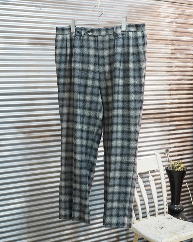 Text 》 二つ目はメタリックボディにさり気ない裏地のパープルが個人的には好物 こちらは裾幅30cmでワンタックとセンタープレス、ヘリンボーン織なのでまじまじと見たらストライプにも見える一本 グレー系のアイテムとシルバーは相性良いです Size 》 36 (着用モデル:173cm) ウエスト平置き:45cm 股上:41cm 股下:71cm 裾幅:30cm ※多少の誤差はご了承下さい Material 》 × ※表記なし Condition 》 B S:新品または未使用(デッドストック) A:使用感がなく、ダメージのない美品 B:使用感ありだが、比較的綺麗な個体 C:着用に支障がない程度の個体(微細なヨゴレ等) D:使用感が強く、大きなダメージや汚れあり ※当店で扱っている商品はユ‐ズドアイテムになり、古着の特性上、わずかな汚れやシミ等による返品、返金、交換は受け付けておりません。 必ず写真と詳細欄をご確認の上ご購入お願いいたします。