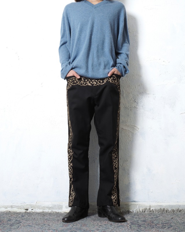 Text 》 まず目に入ってくるこのデザイン性の高さと、黒ボディとの相性が◎ 太すぎないラグジュアリーな雰囲気とシルエット、ポリエステルの硬めな生地感がかなり良く、重宝するパンツだと思います Size 》 F (着用モデル:173cm) ウエスト平置き:48cm 股上:37cm 股下:72cm 裾幅:23cm ※多少の誤差はご了承下さい Material 》 Polyester Condition 》 B S:新品または未使用(デッドストック) A:使用感がなく、ダメージのない美品 B:使用感ありだが、比較的綺麗な個体 C:着用に支障がない程度の個体(微細なヨゴレ等) D:使用感が強く、大きなダメージや汚れあり ※当店で扱っている商品はユ‐ズドアイテムになり、古着の特性上、わずかな汚れやシミ等による返品、返金、交換は受け付けておりません。 必ず写真と詳細欄をご確認の上ご購入お願いいたします。