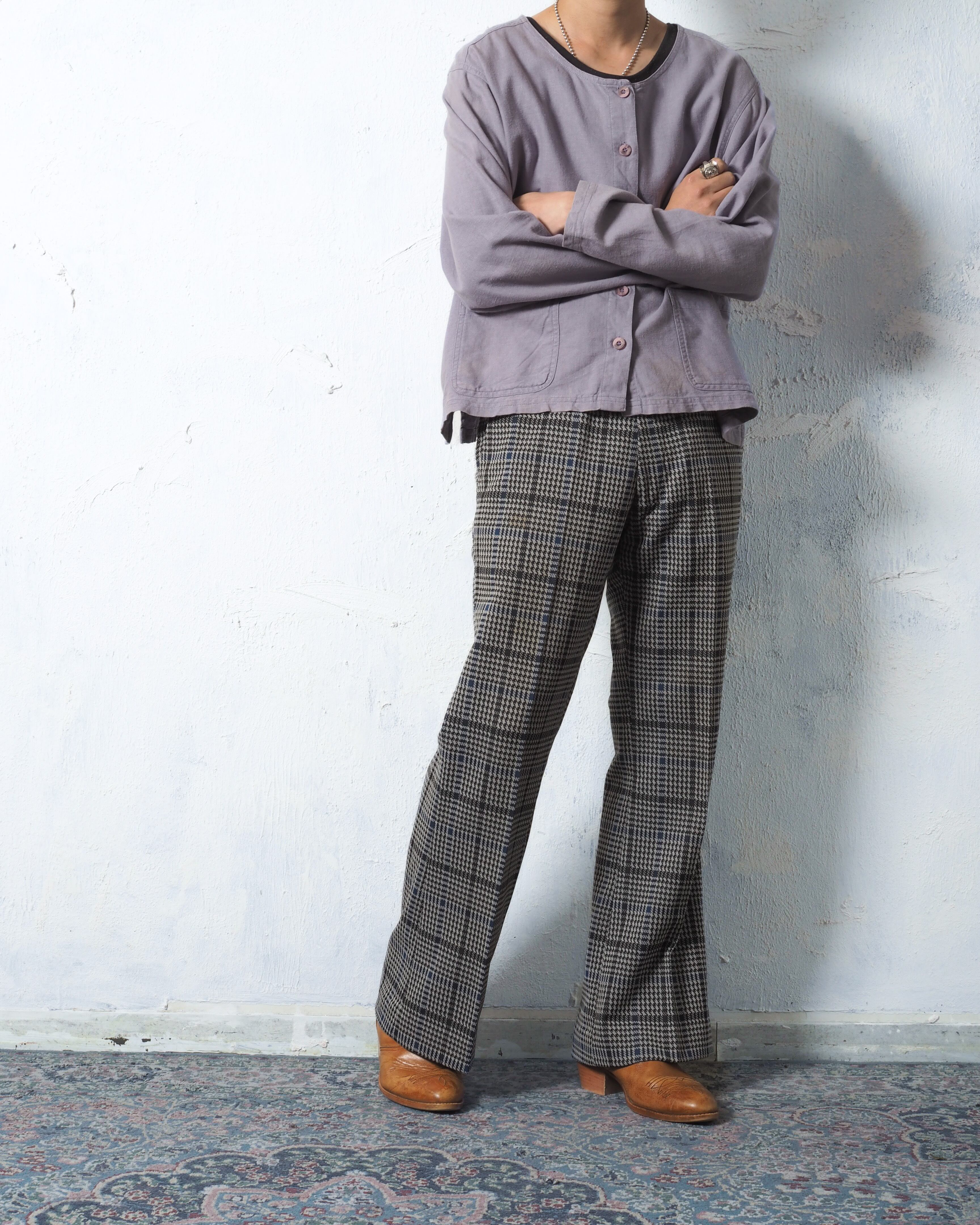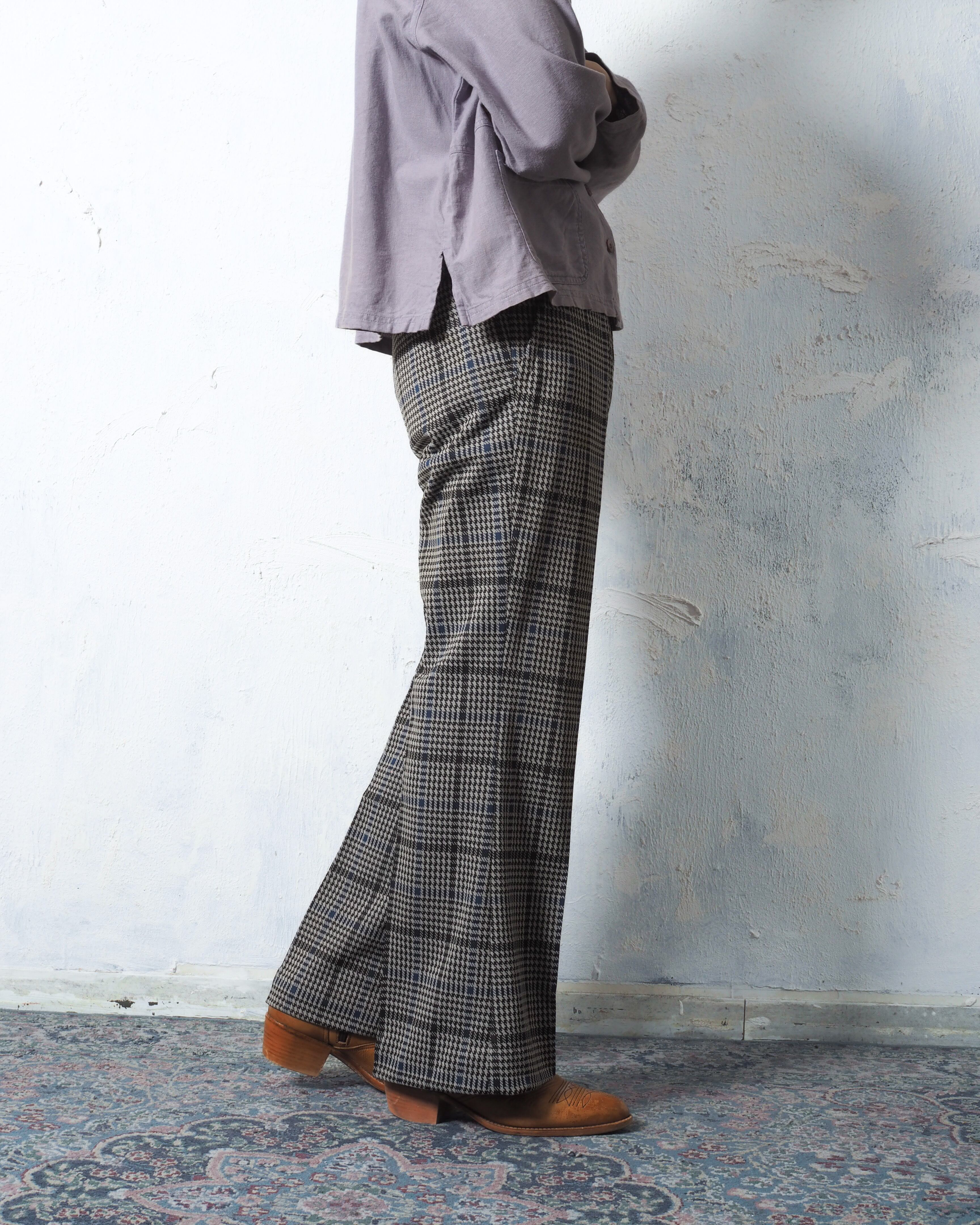 寒色の効いた千鳥格子×チェックのフレアスラックス
