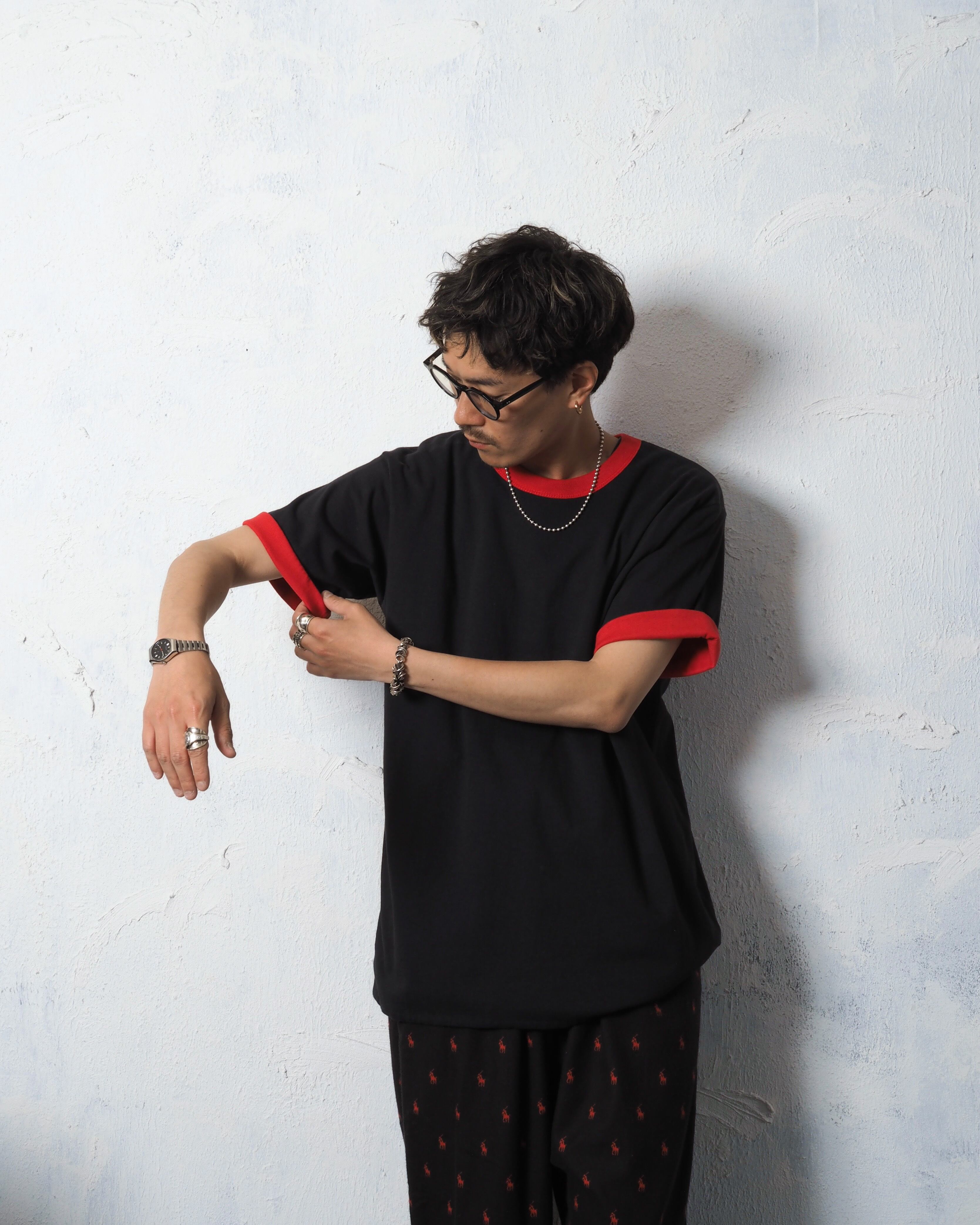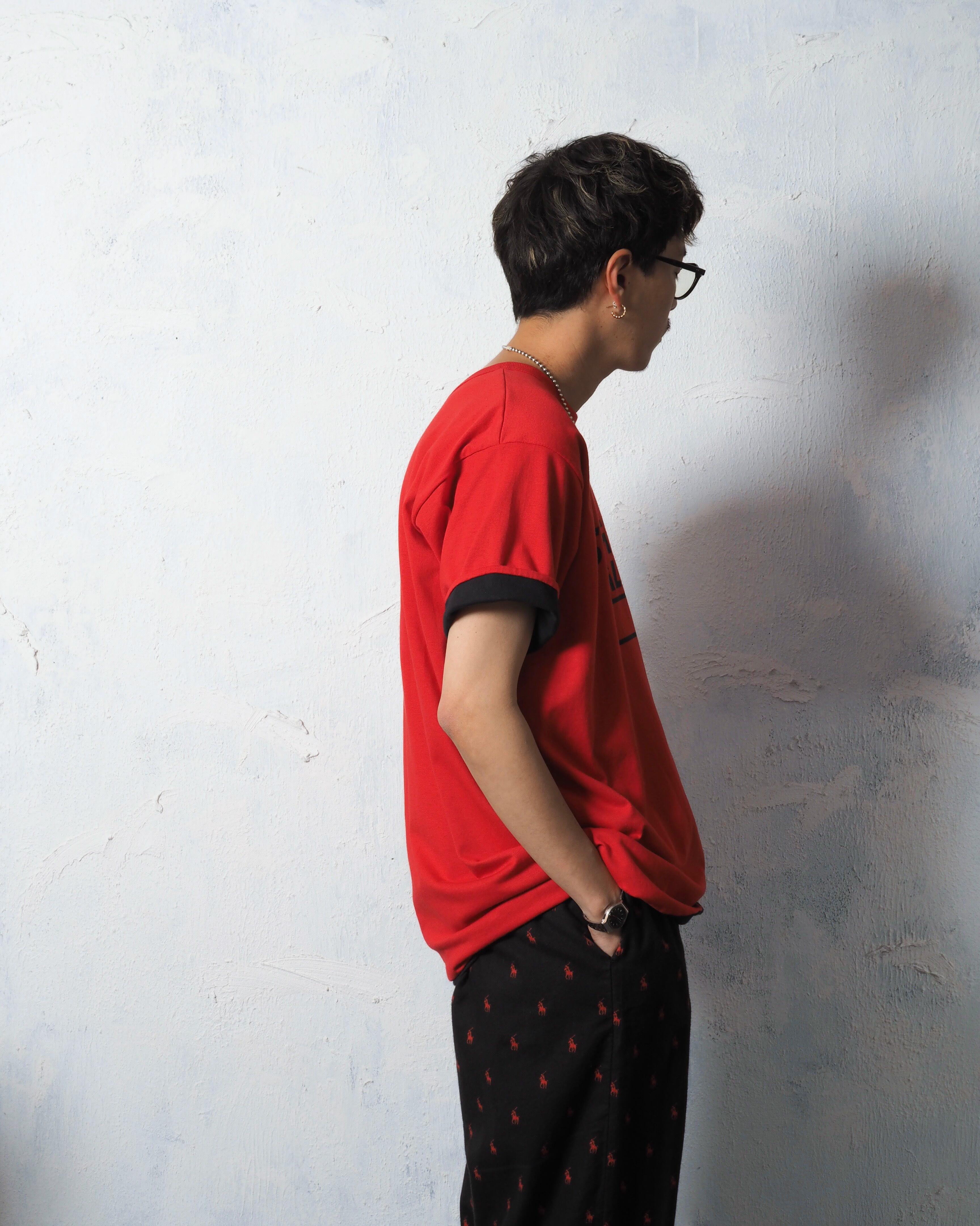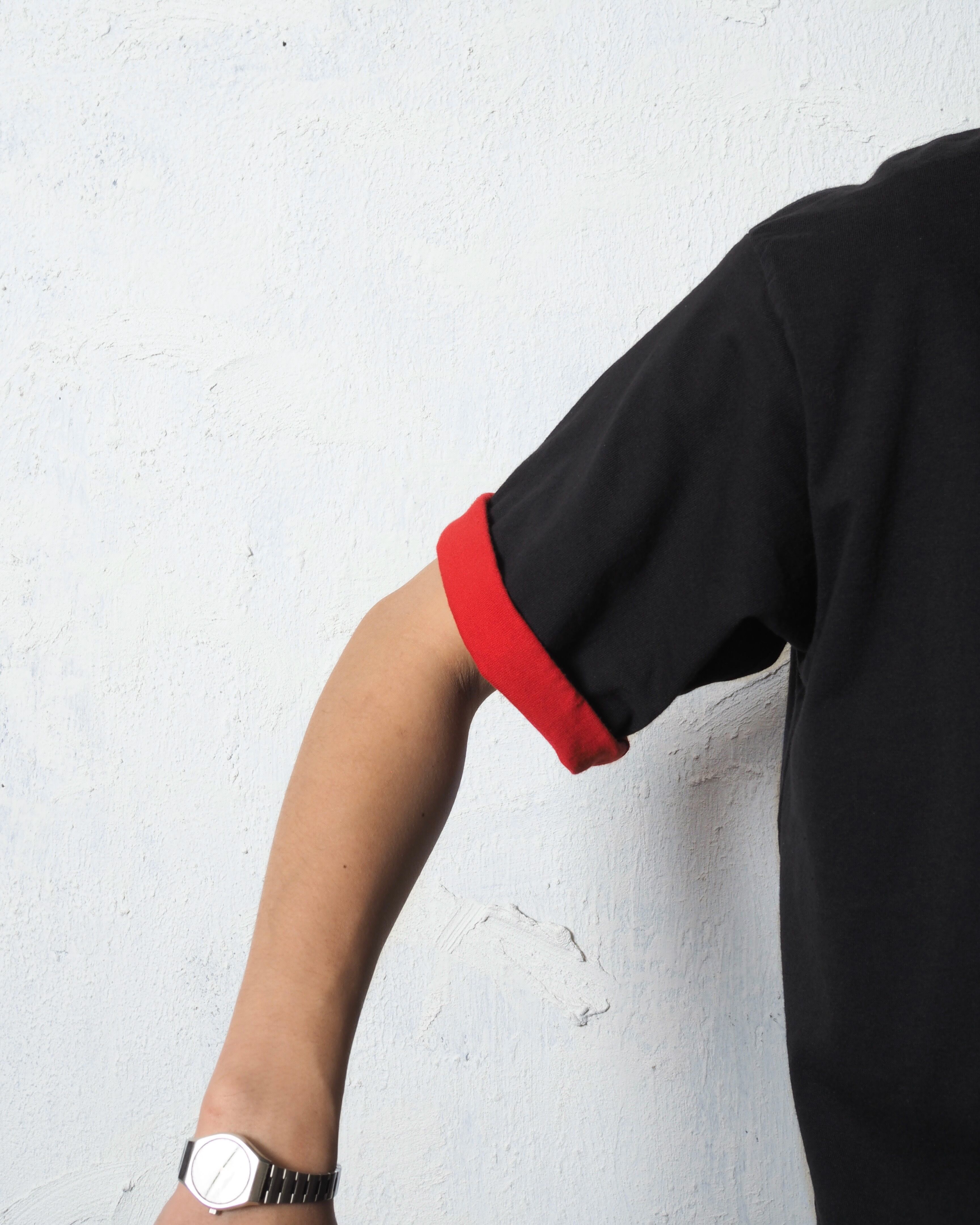オンスが厚く赤と黒の真逆な顔を魅せてくれるこのアイテムは袖を少し折り、オリジナリティを入れ込んで着たいところ
