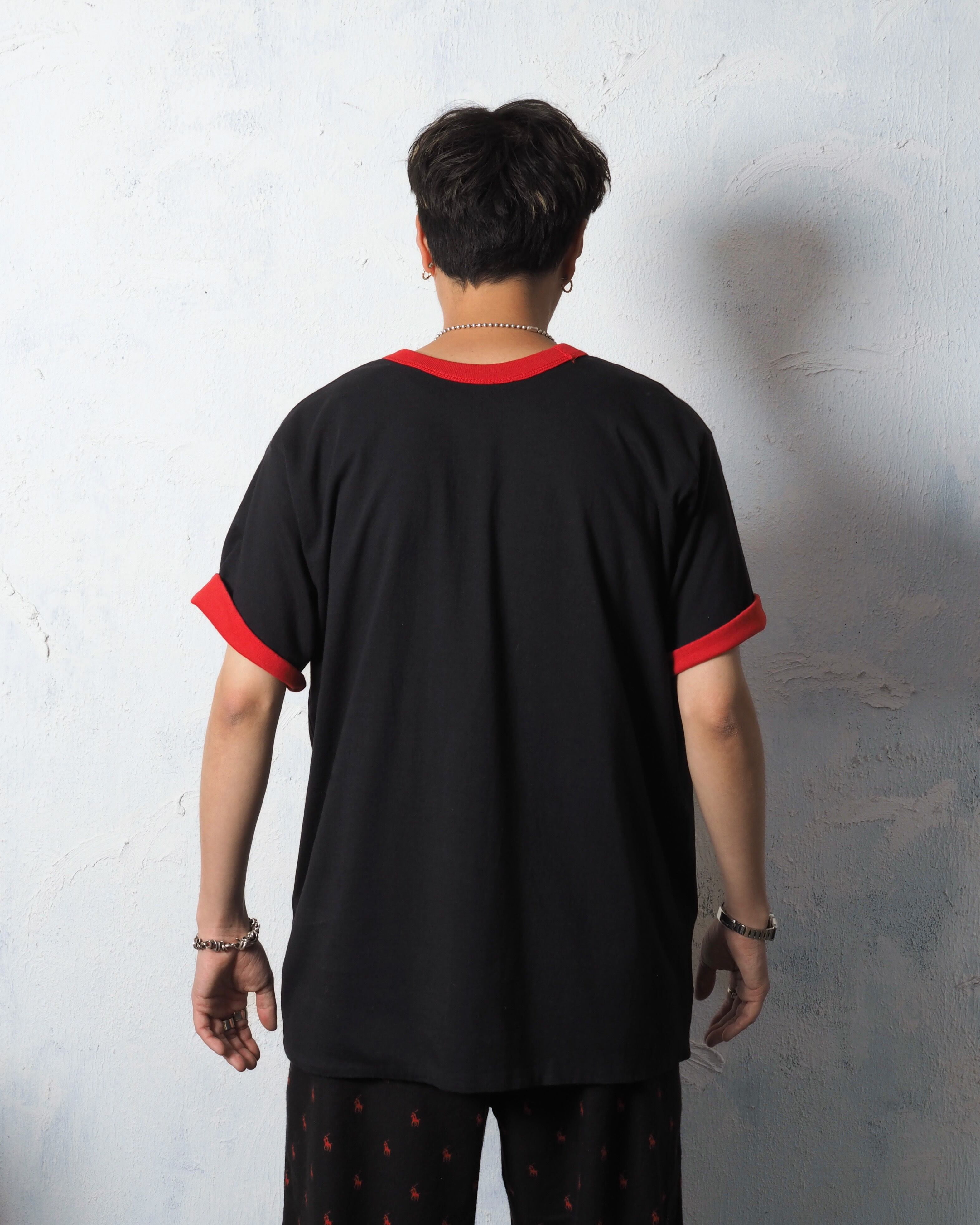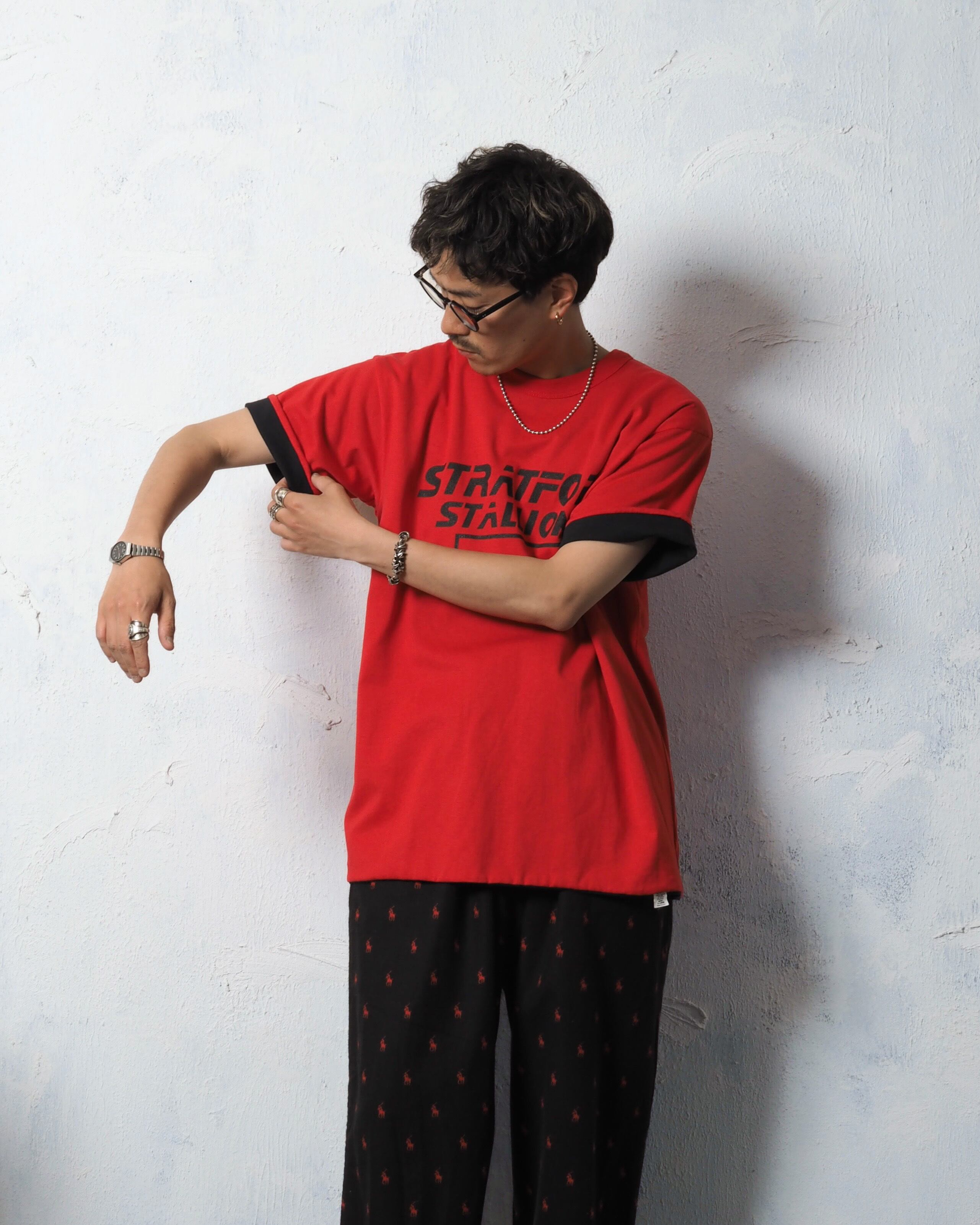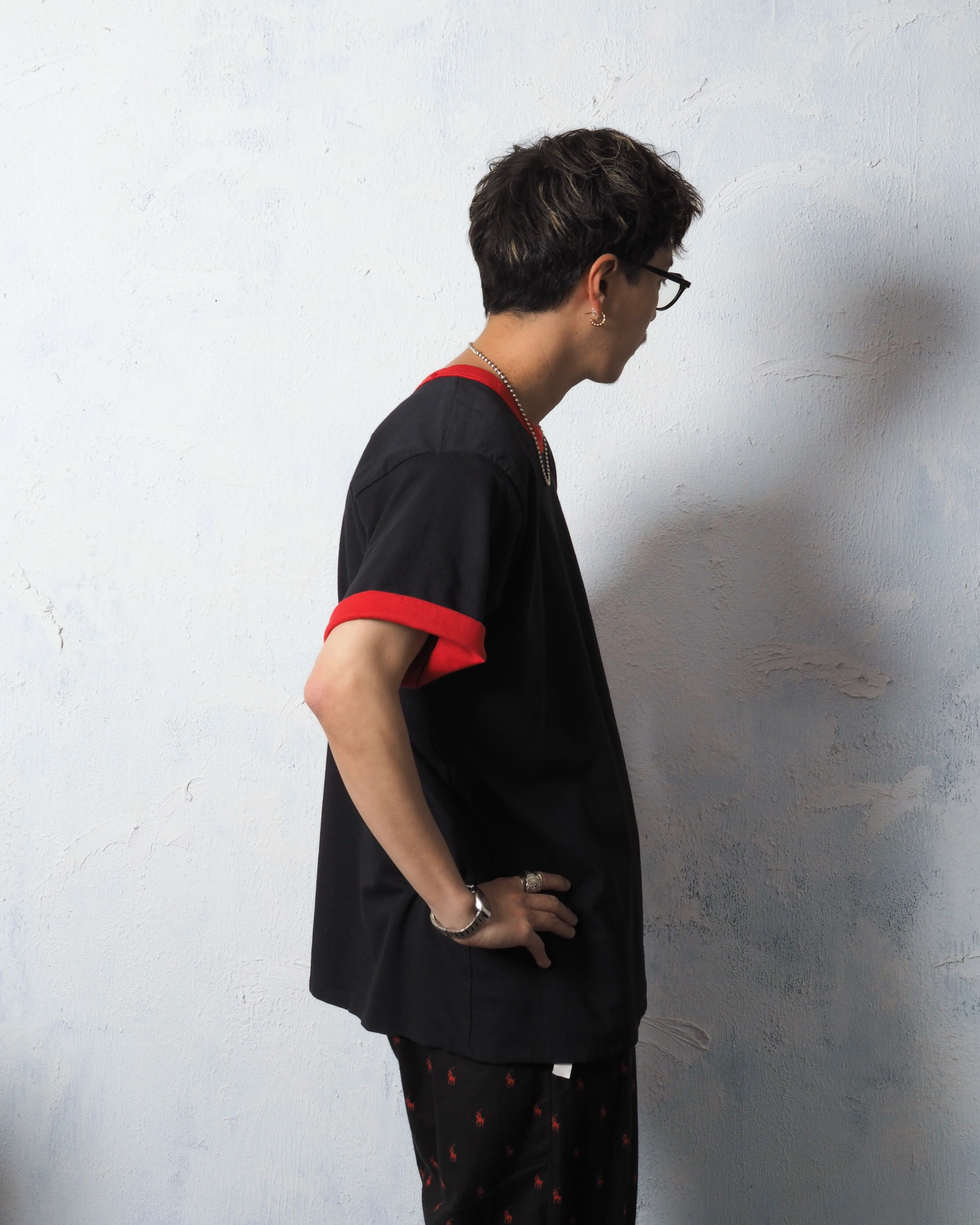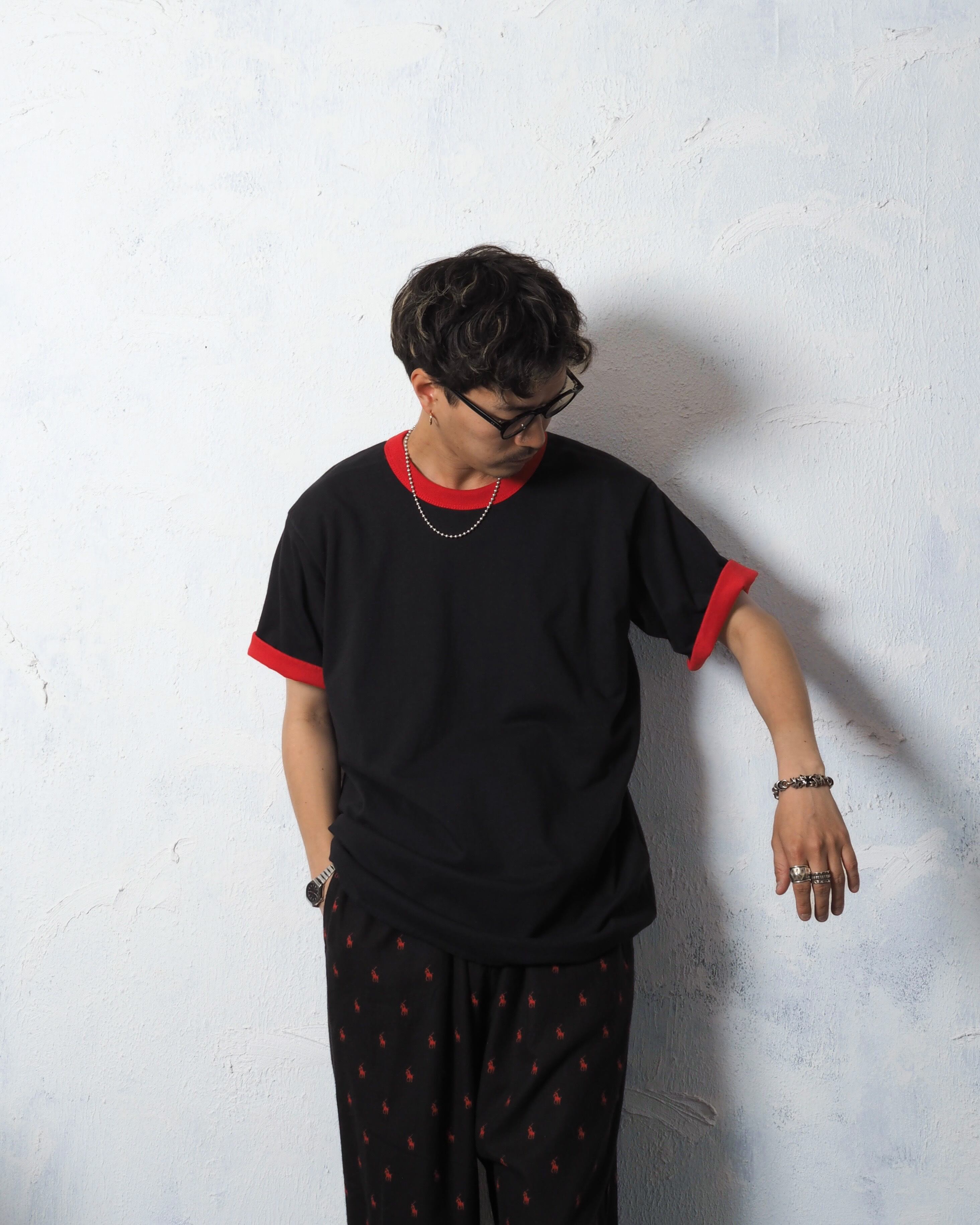 オンスが厚く赤と黒の真逆な顔を魅せてくれるこのアイテムは袖を少し折り、オリジナリティを入れ込んで着たいところ