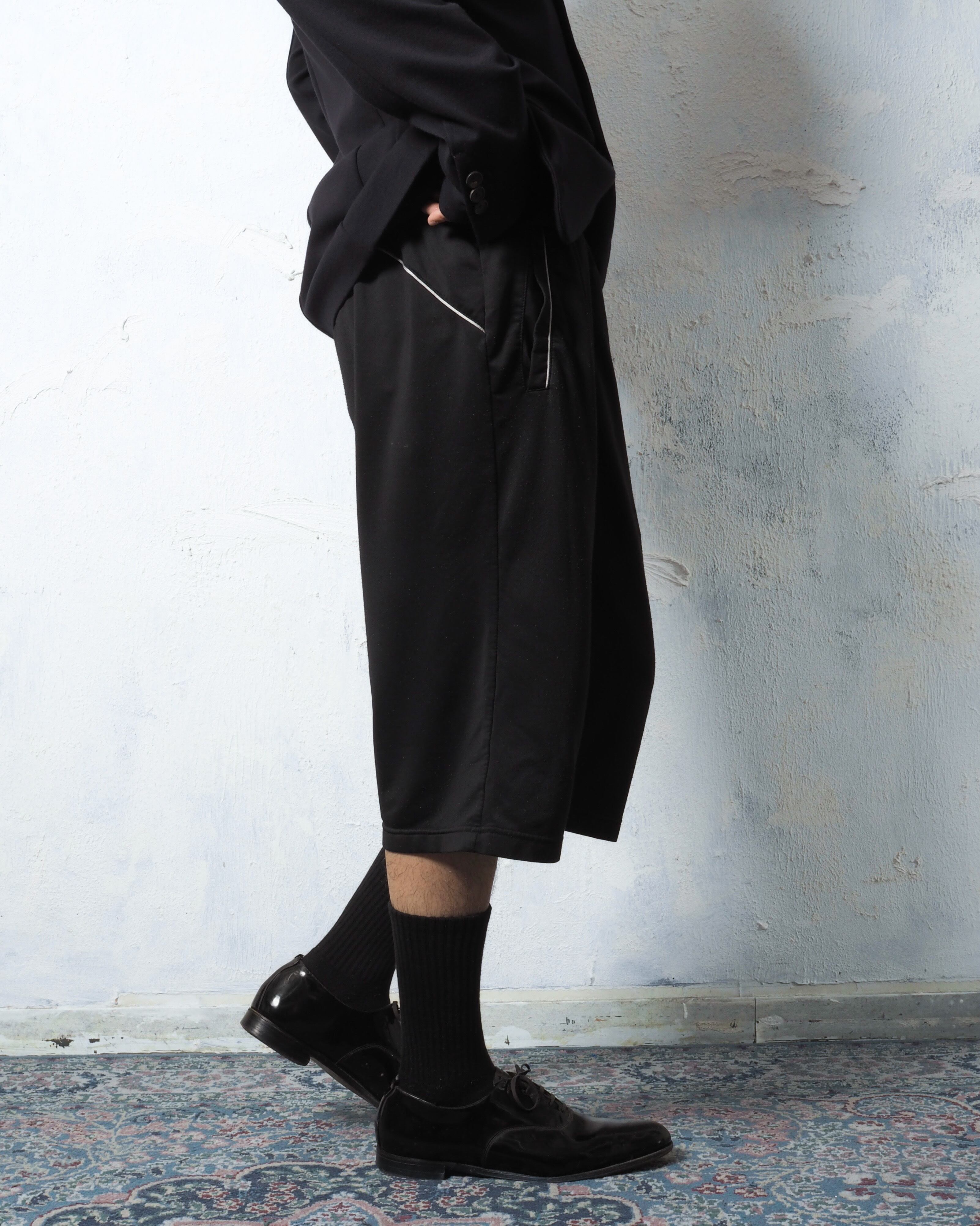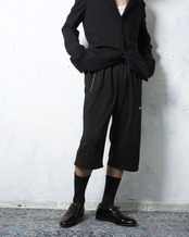 着画のように黒で纏めてテーラードと革靴で上品さを出しつつ、フォーカスをパンツに置いてあげると面白いです