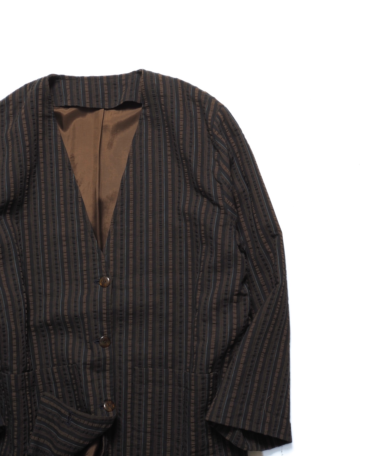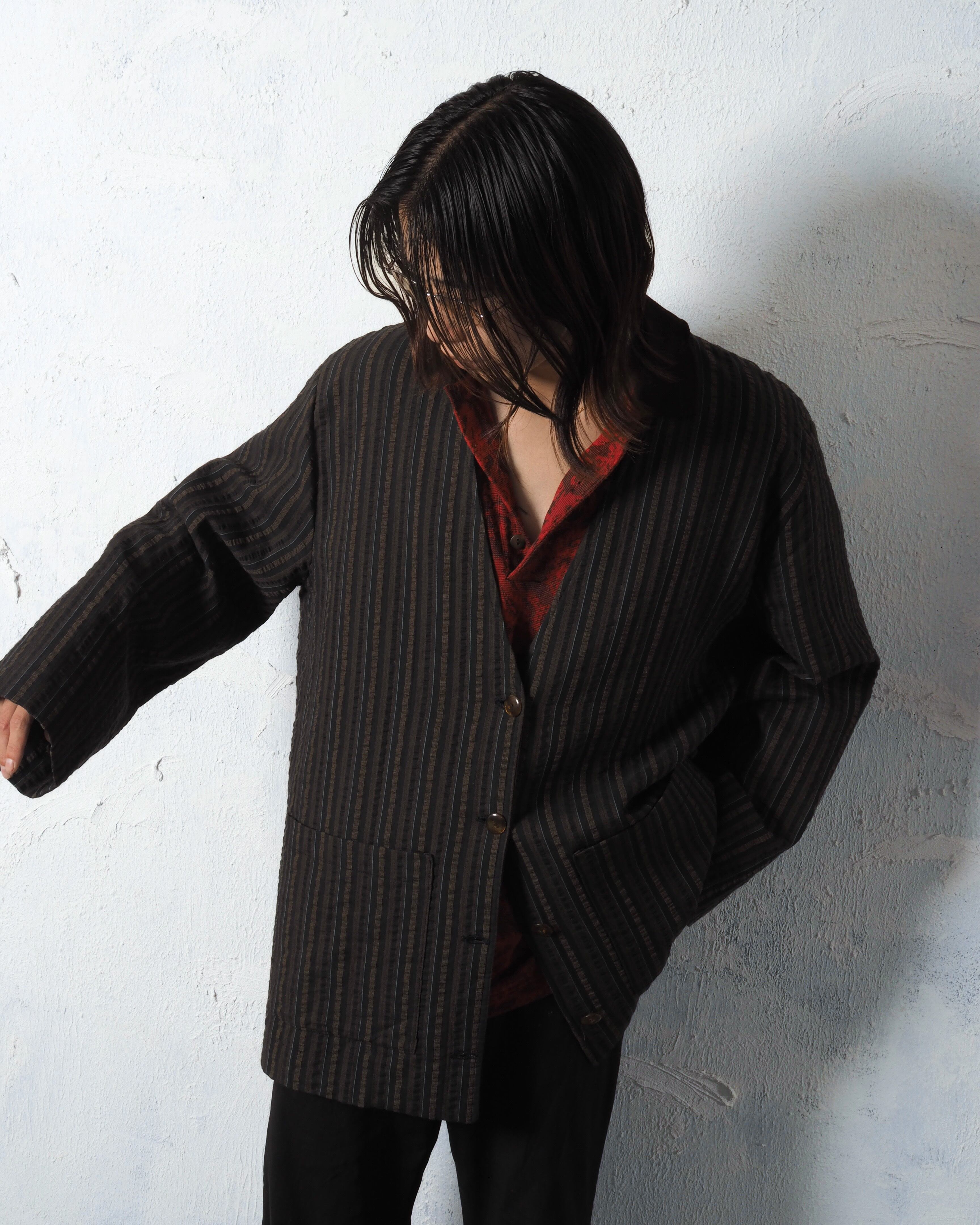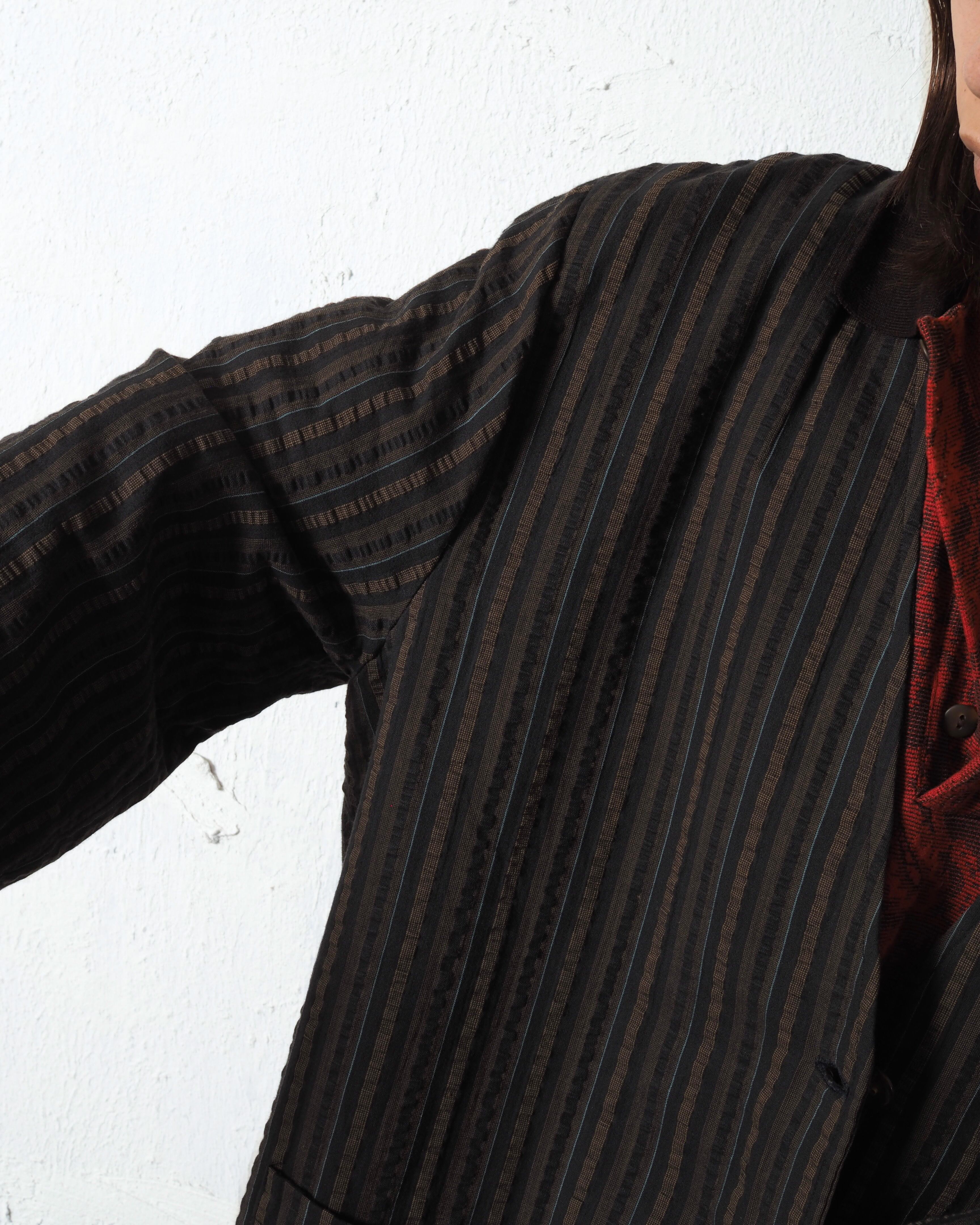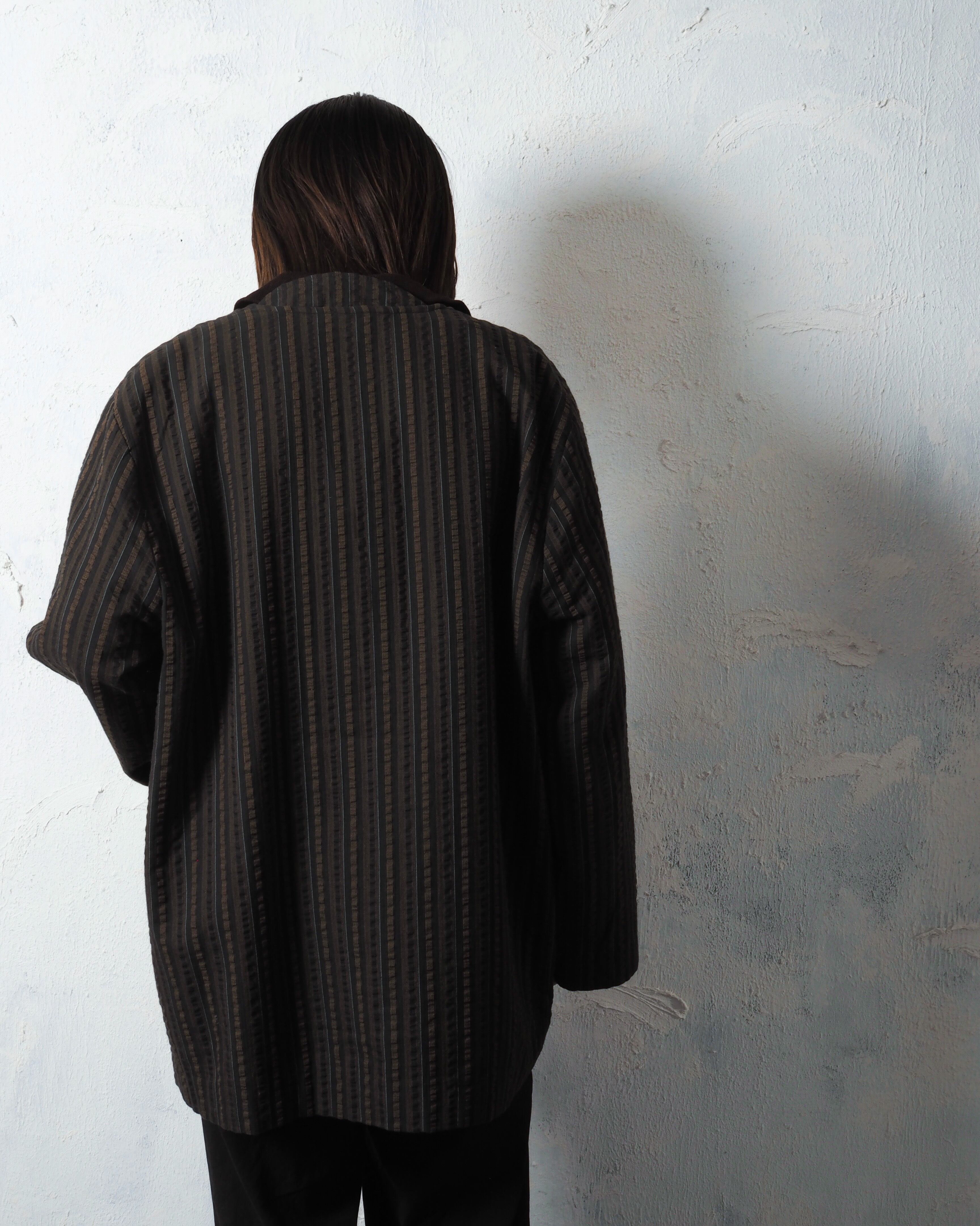 シアサッカー且つノーカラーでこの落ち着いた色味から生まれる圧倒的な洒落っ気と余裕感