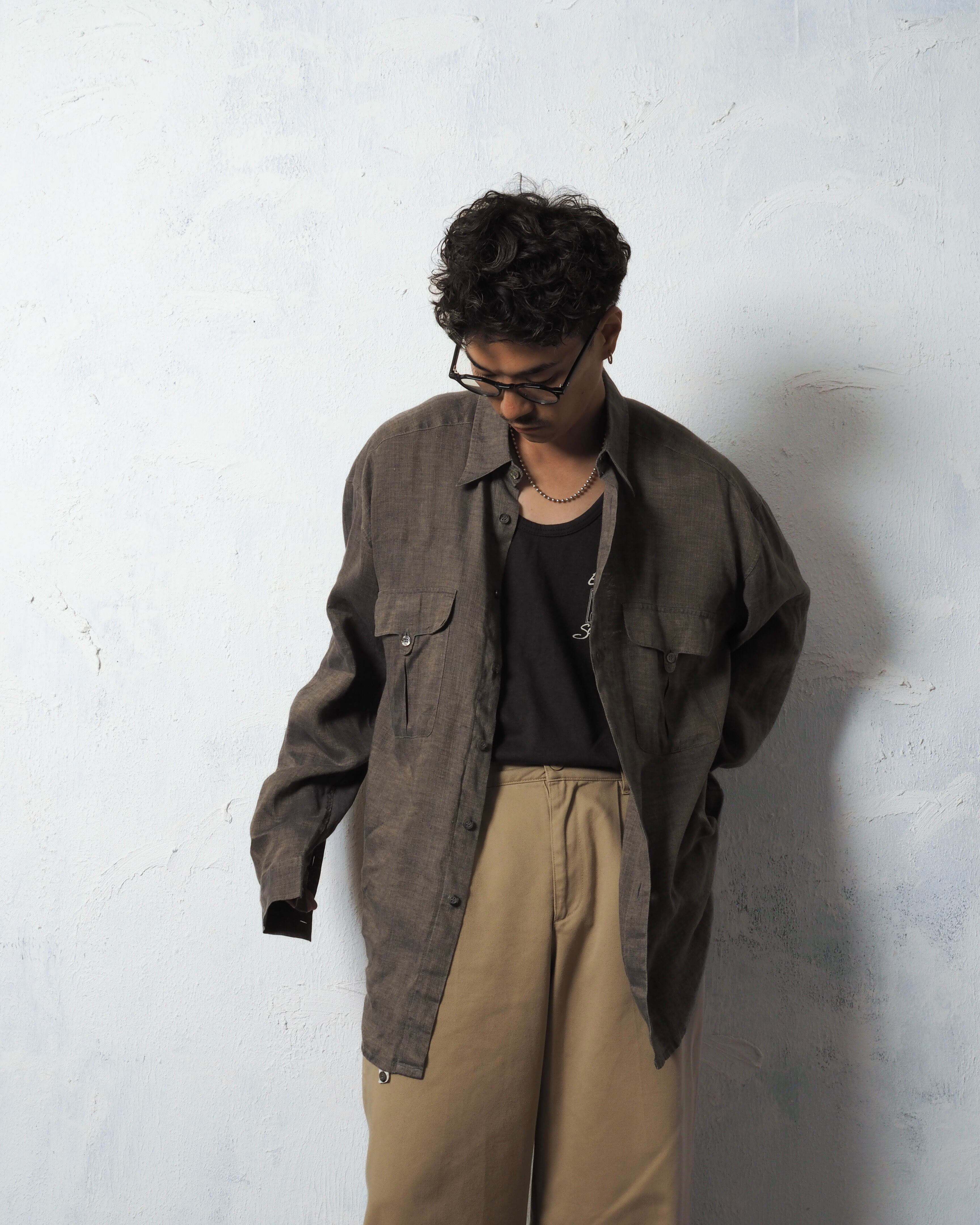 トロトロリネン100%で、デザインフラポケ、サイズはM表記ですが、体感M〜L程かと