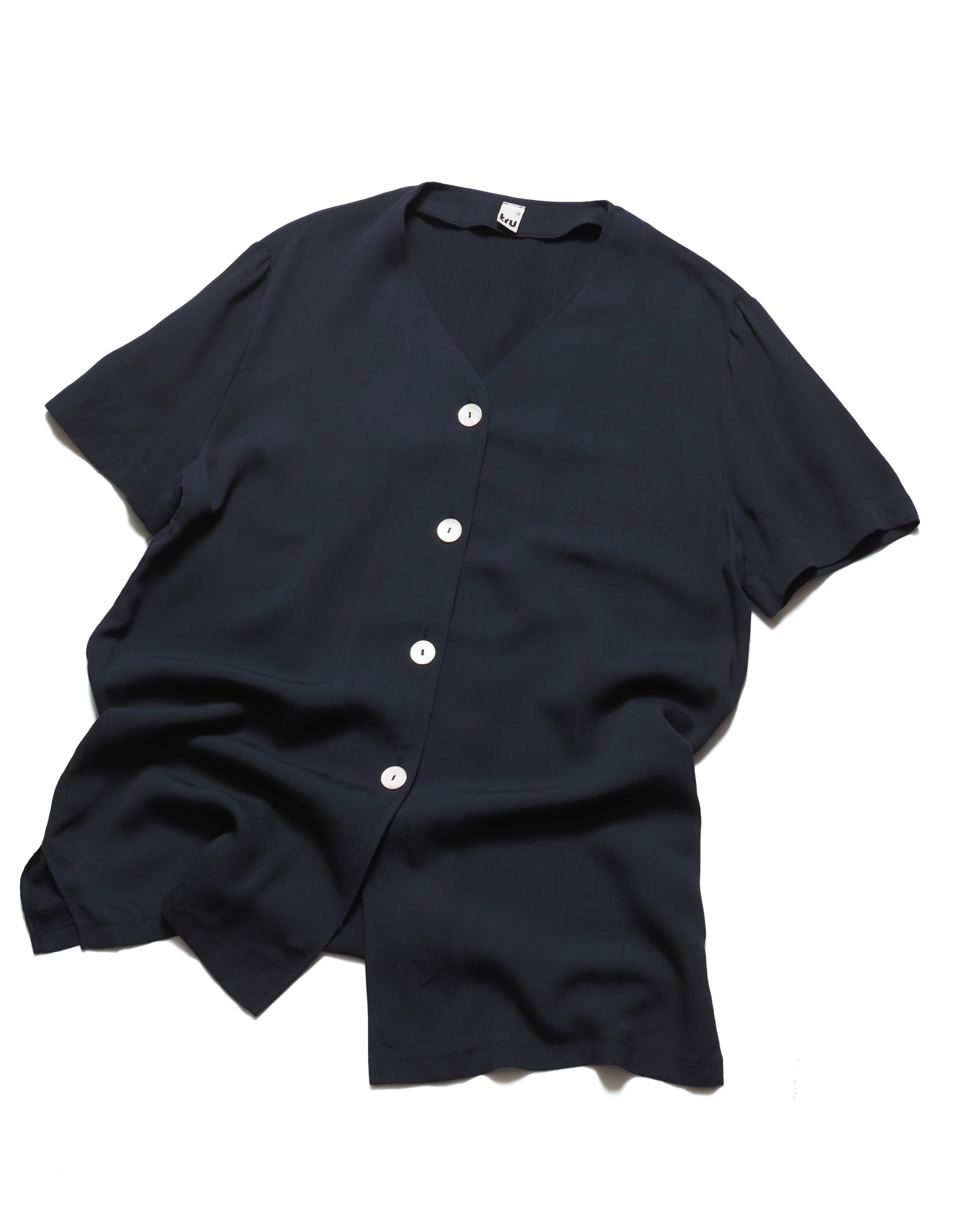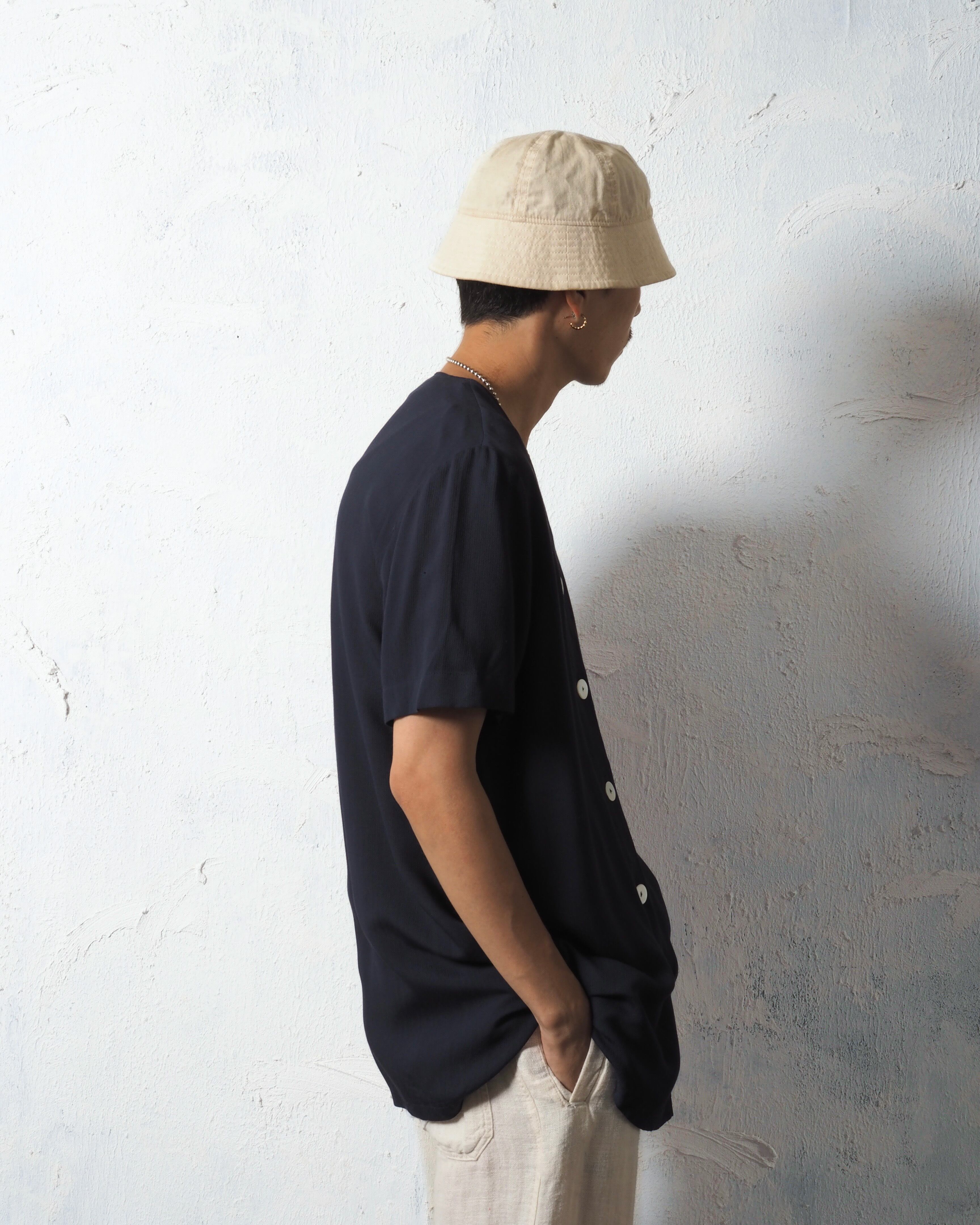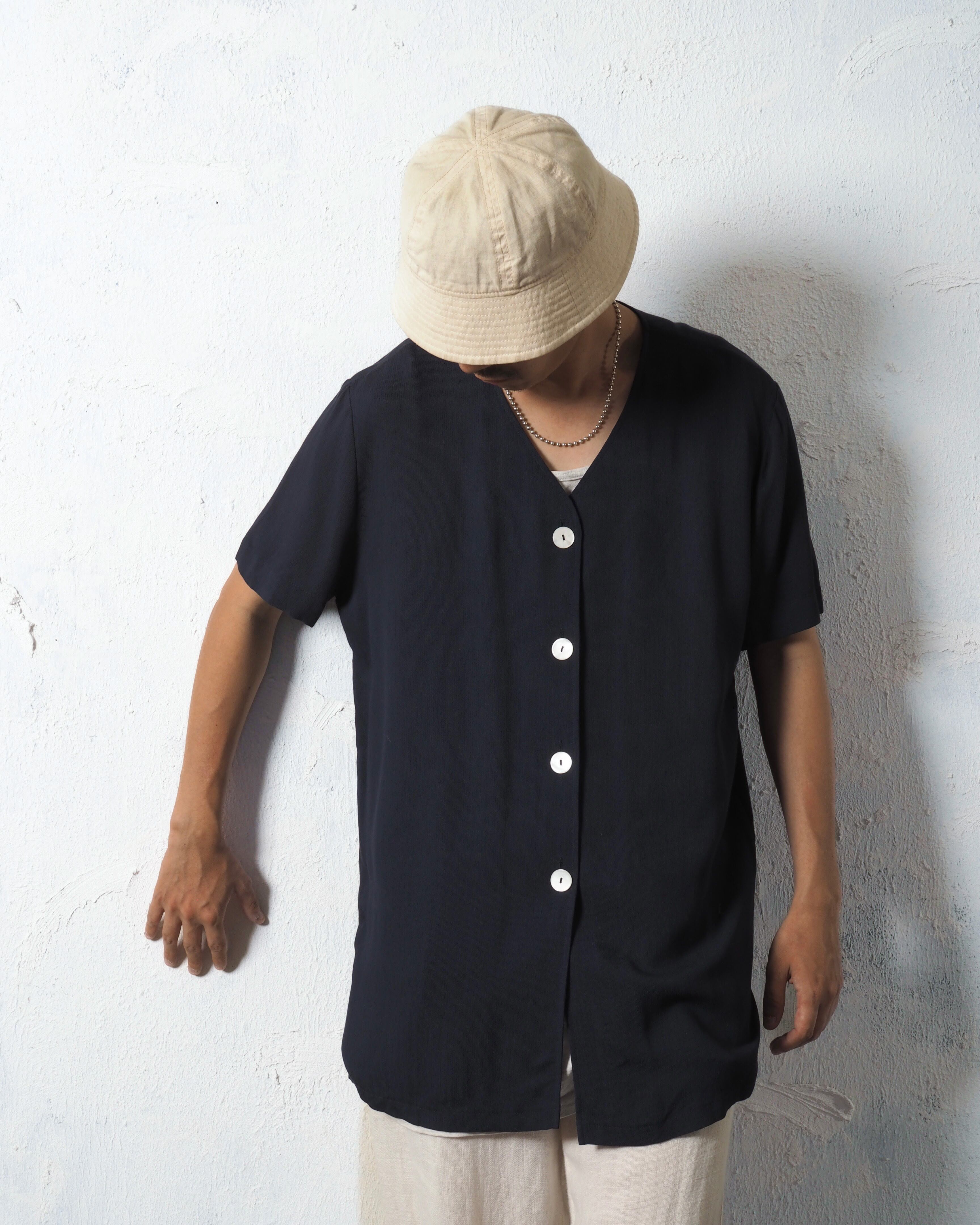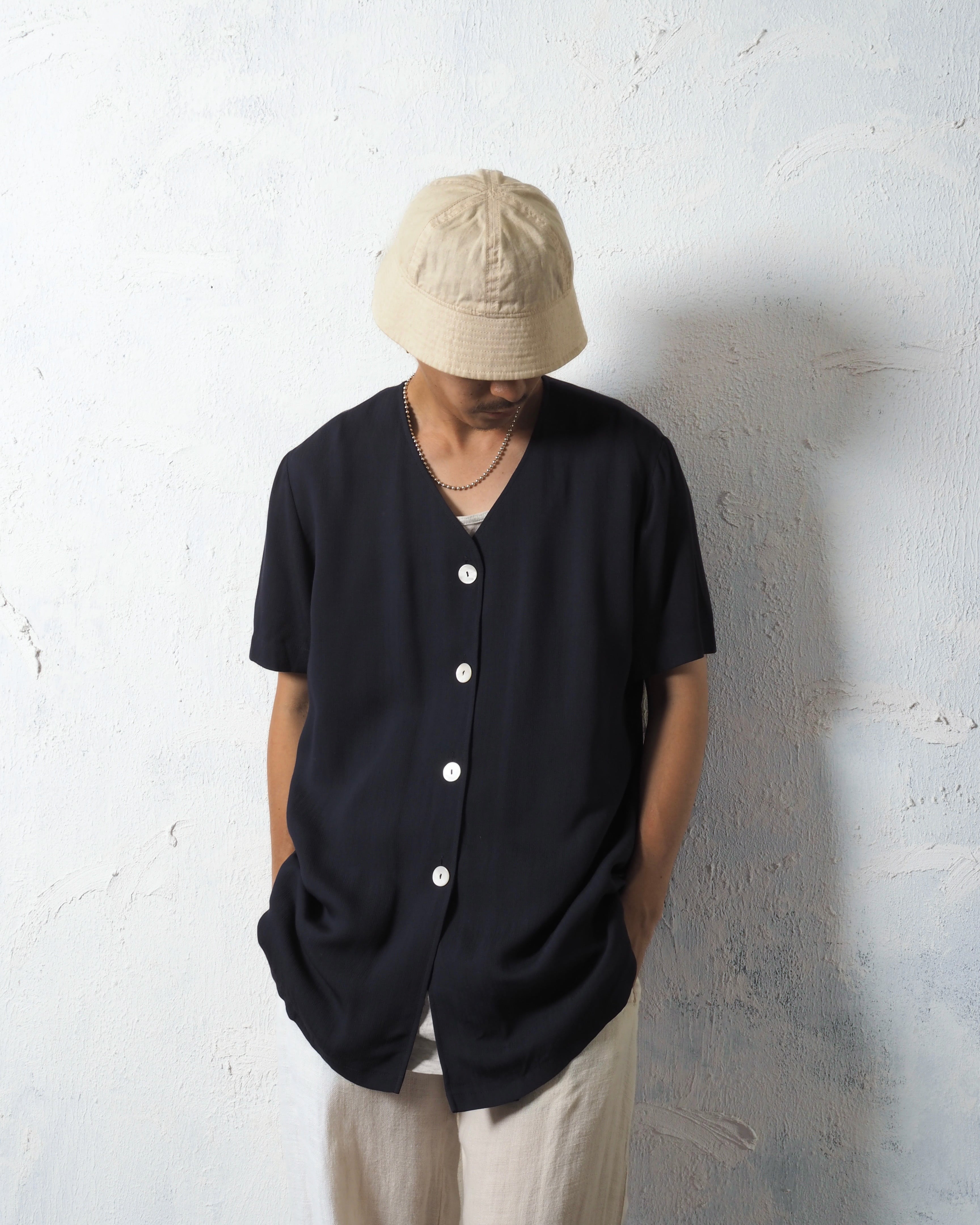汗が溜まる襟元をとっぱらったノーカラーデザインでビスコース100%というトロトロ且つ風通しが鬼良い素材感