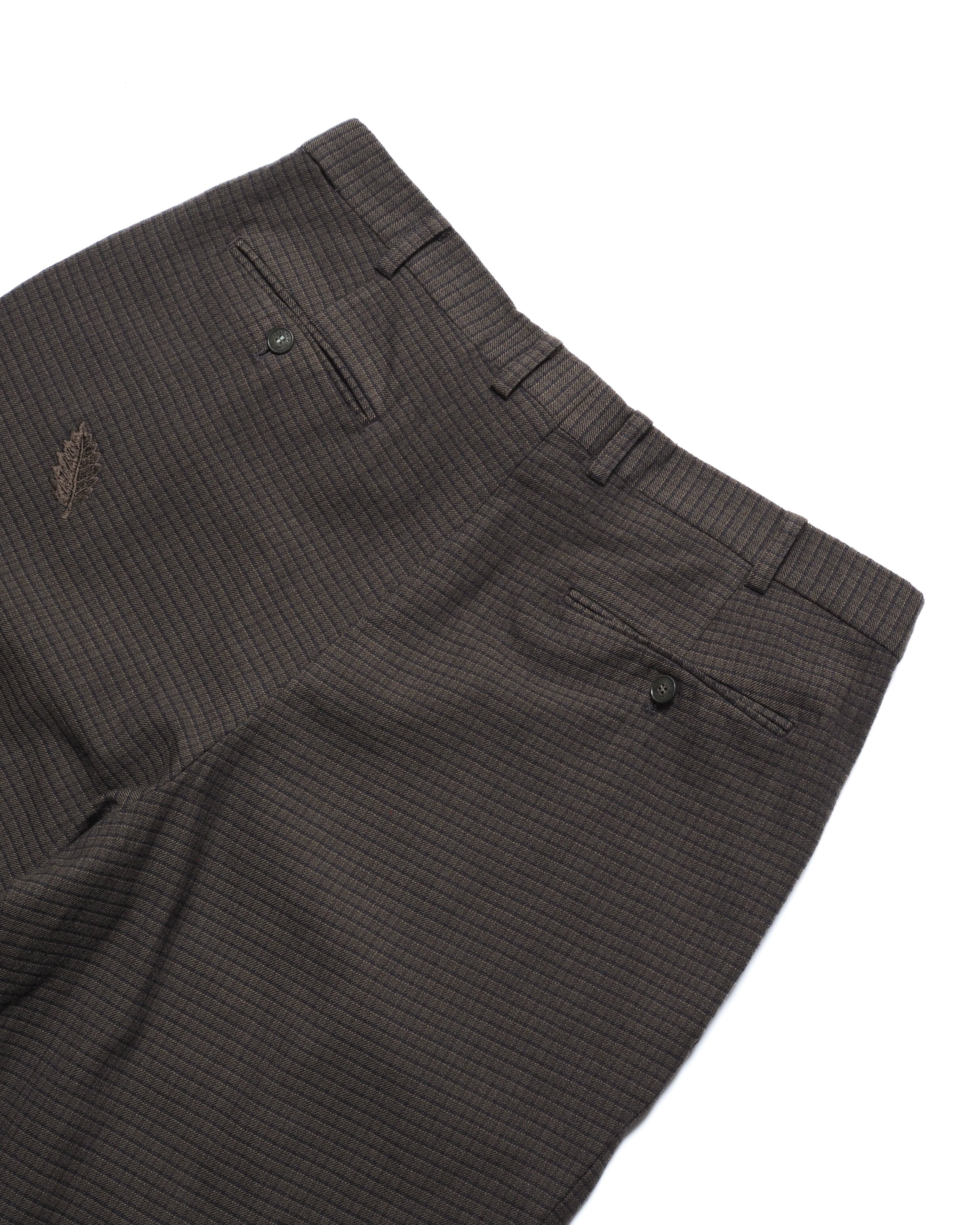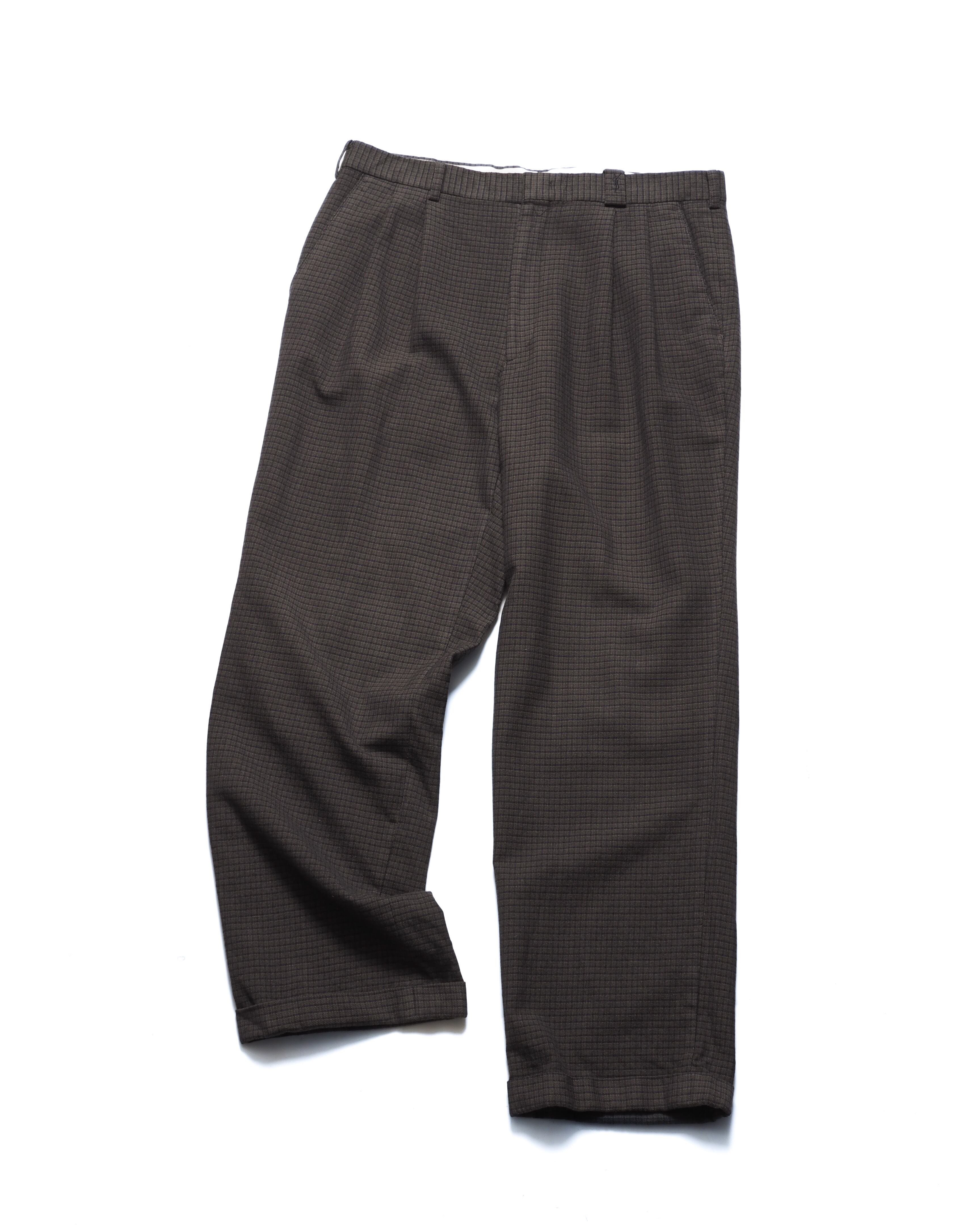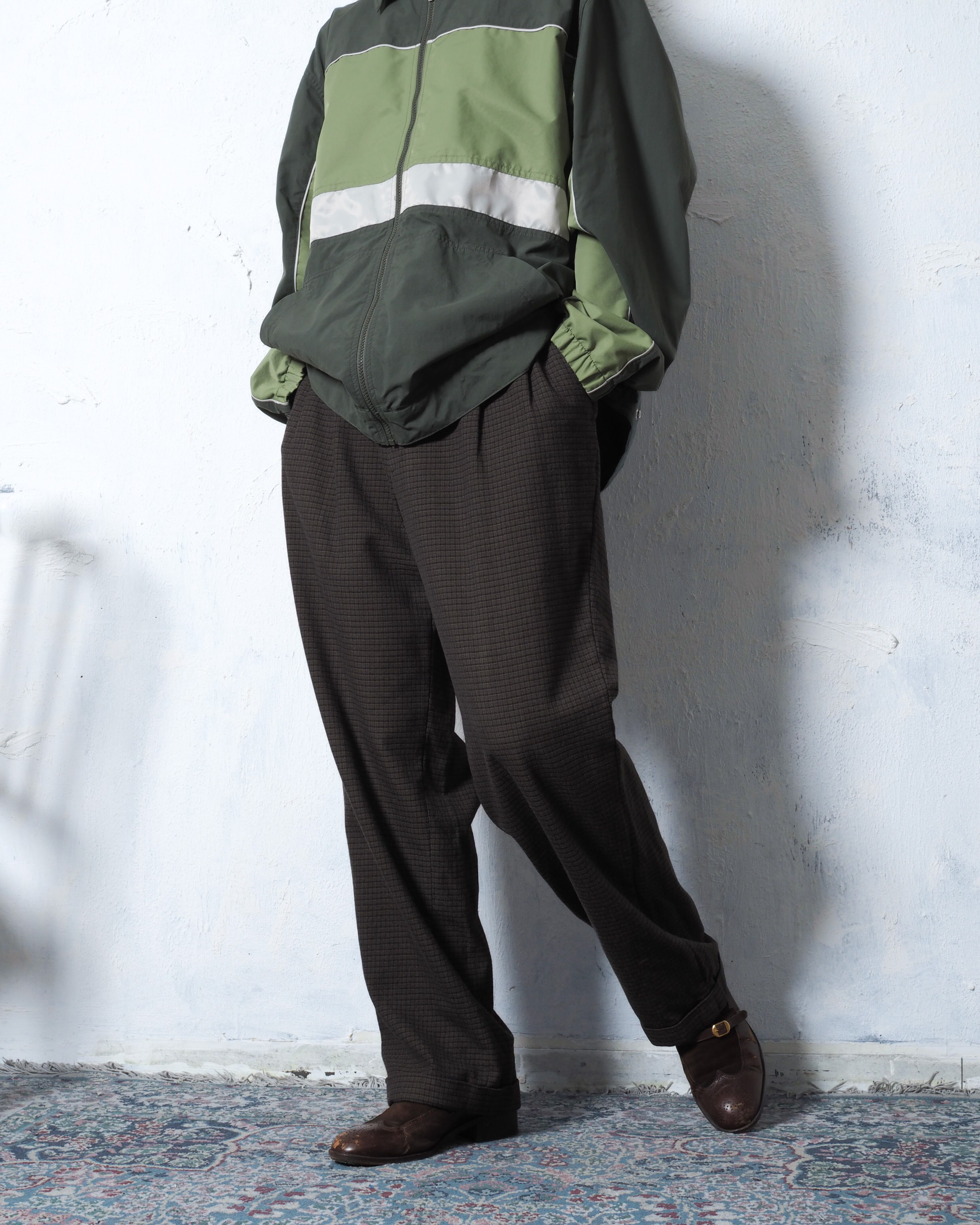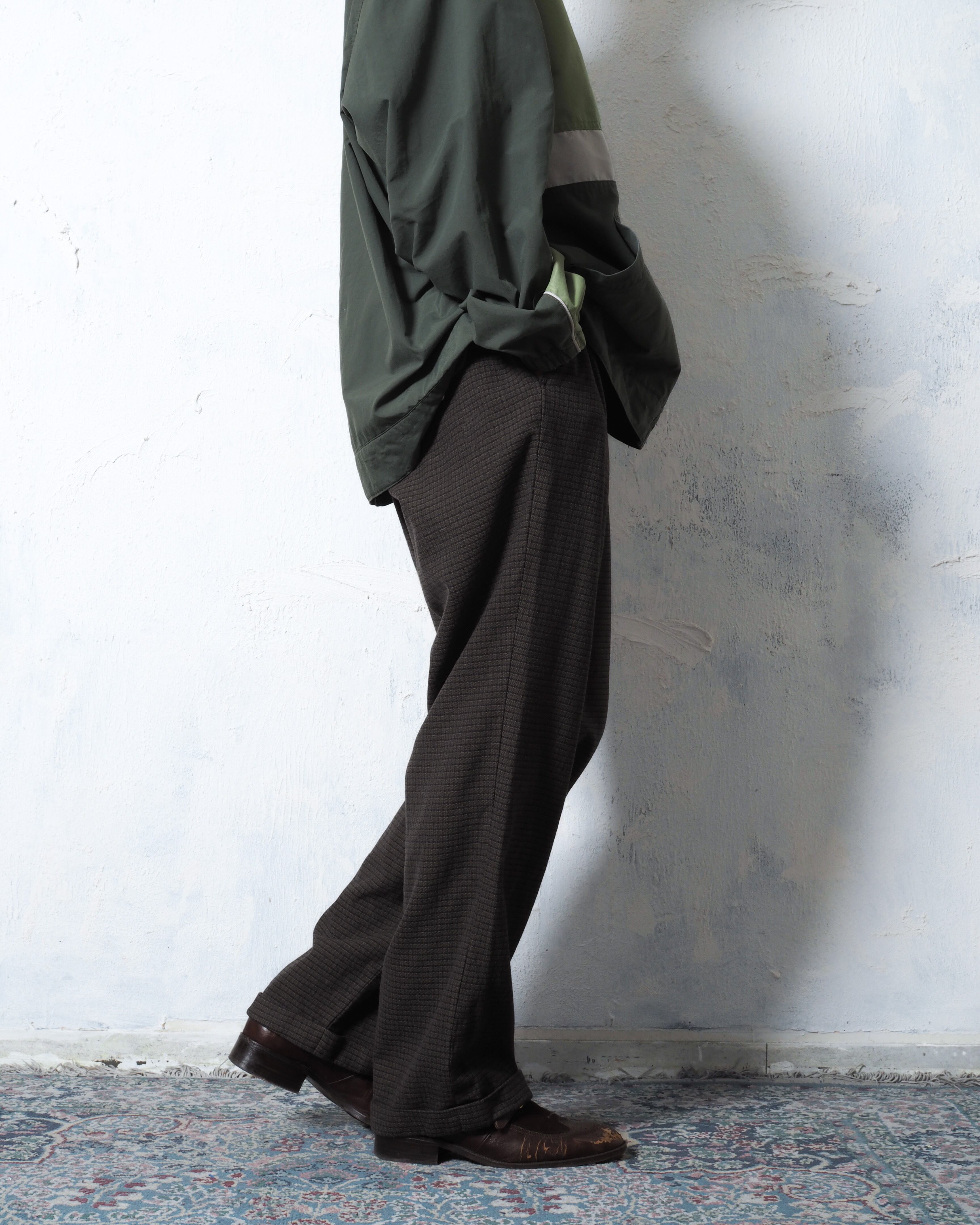 カーキにブラックのチェック、裾はダブルでワタリ幅もしっかりと採られたクラシカルスラックス