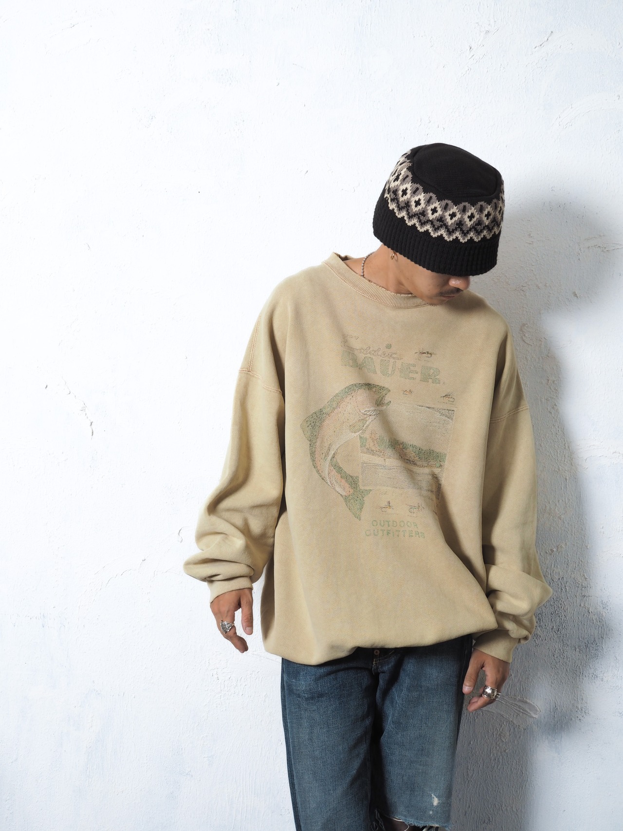 部類で言ったらロゴスウェットになるのでしょうか、フロントのプリントはアウトドアブランドらしいデザイン(人気の魚柄)で良い擦れ具合