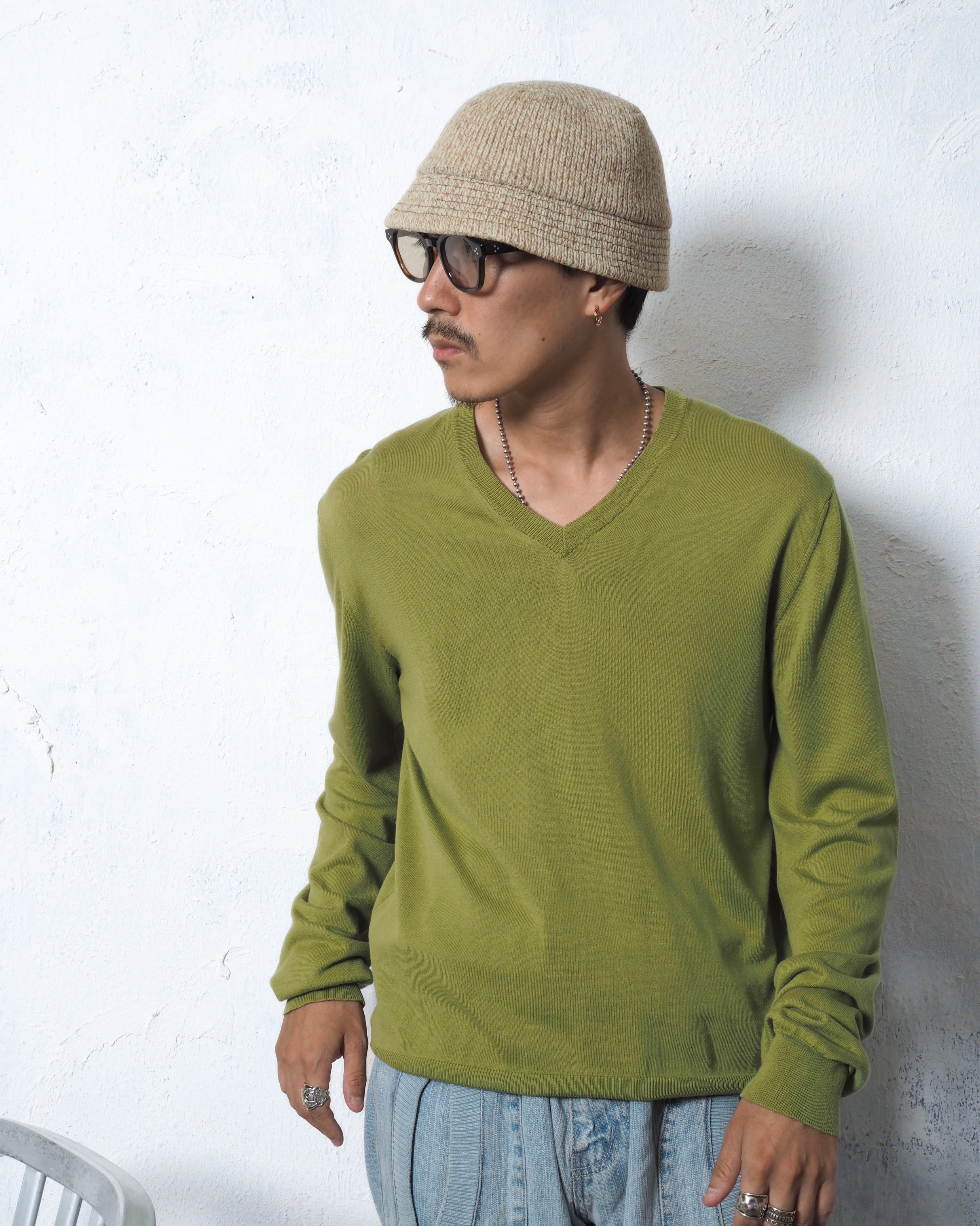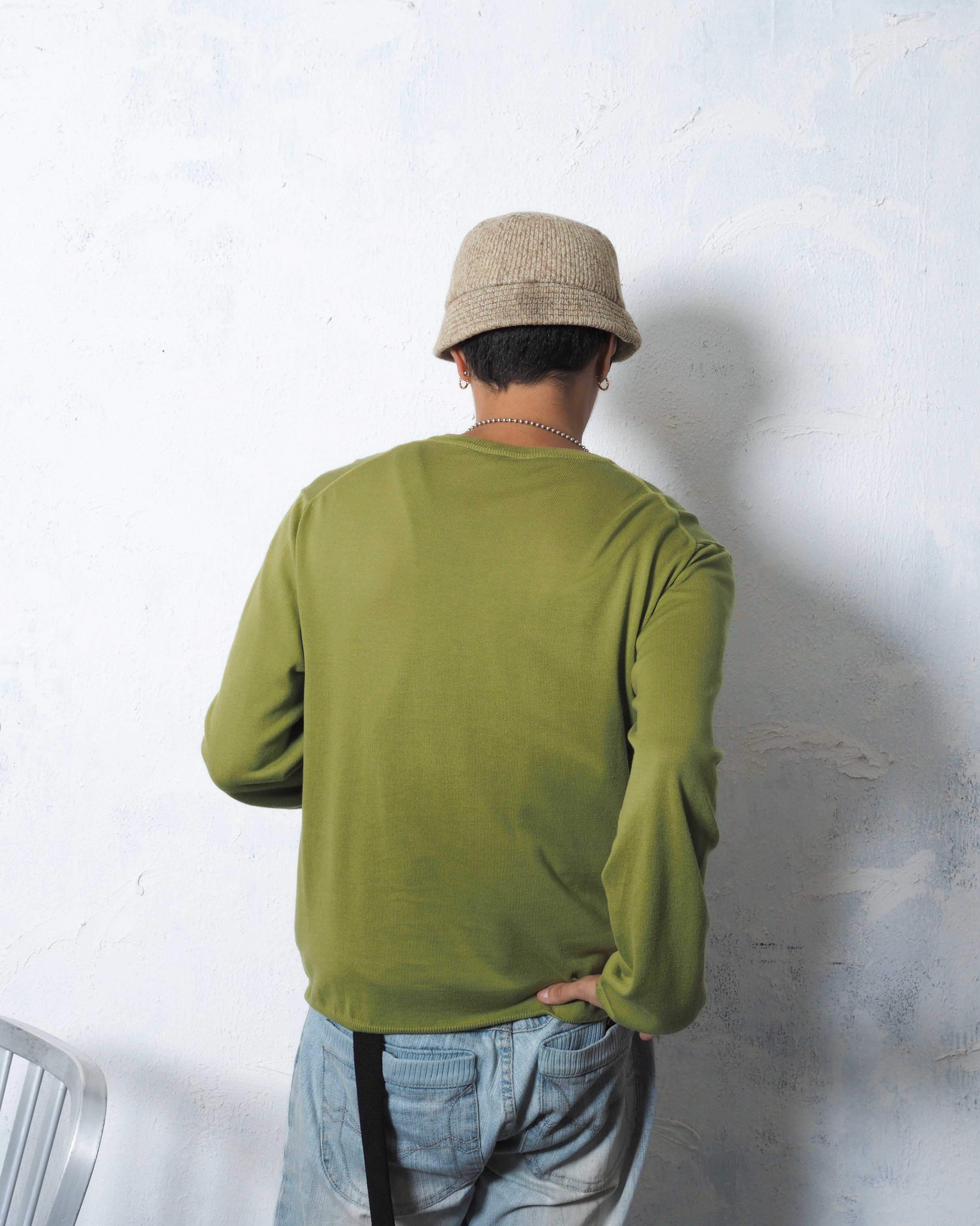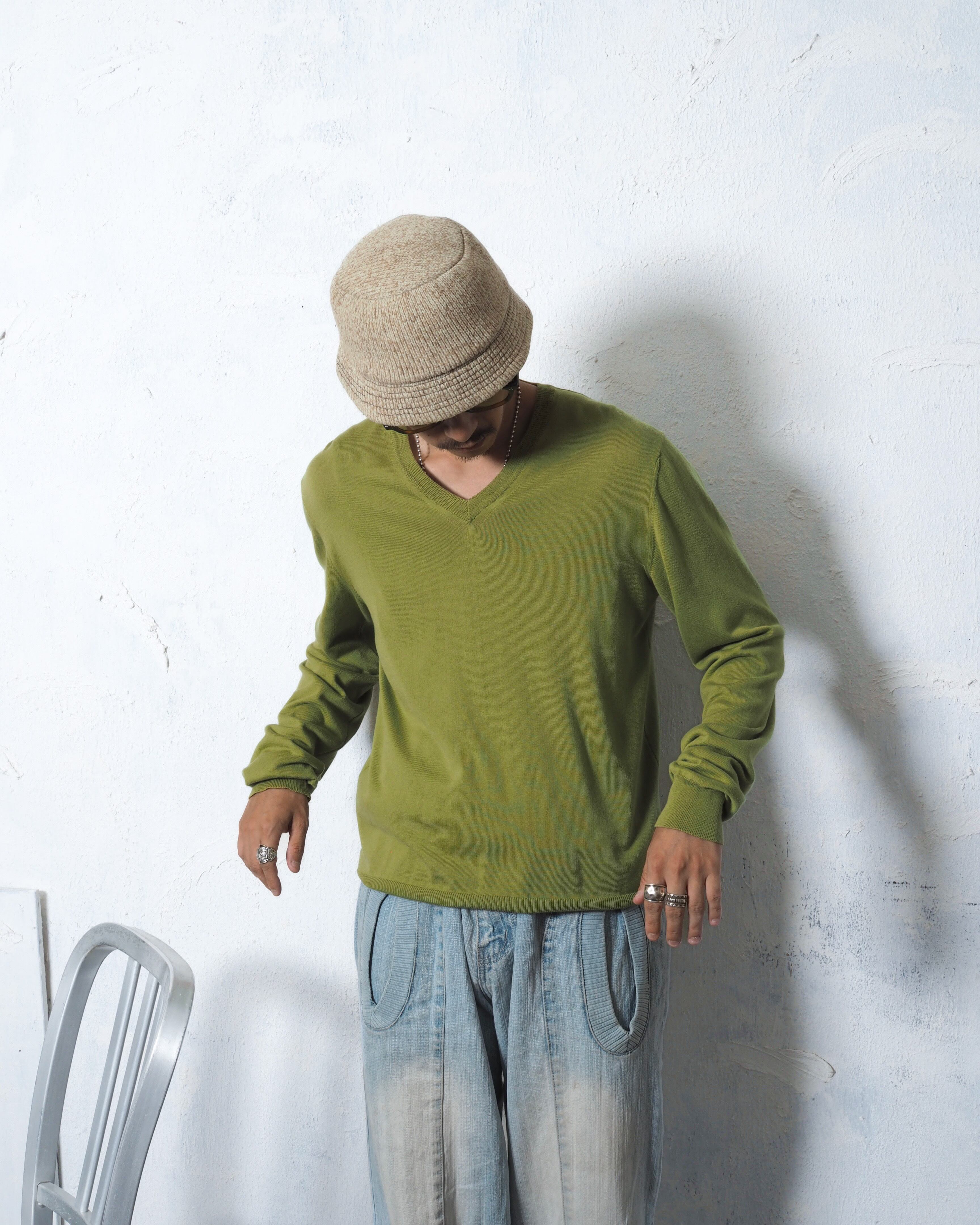 今っぽさもありつつシンプルで大人なVネックアイテムがブランドネーム付きのピスタチオカラーで入荷