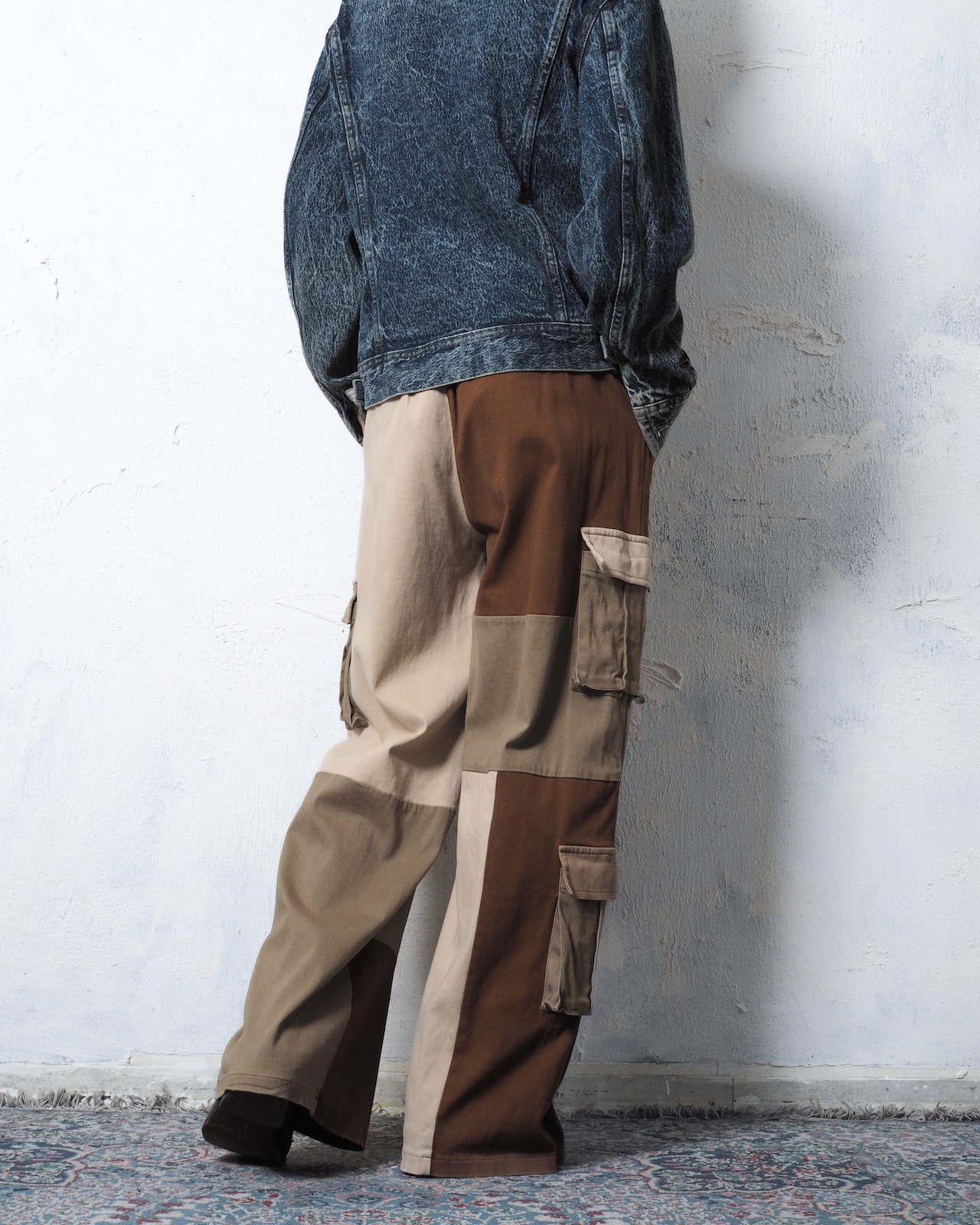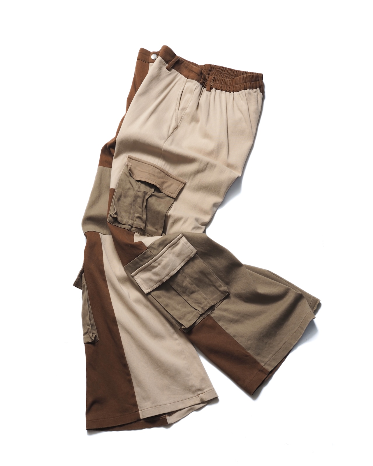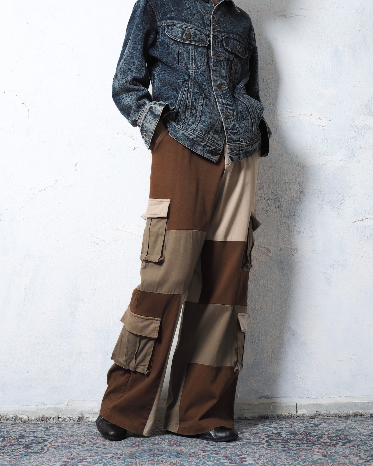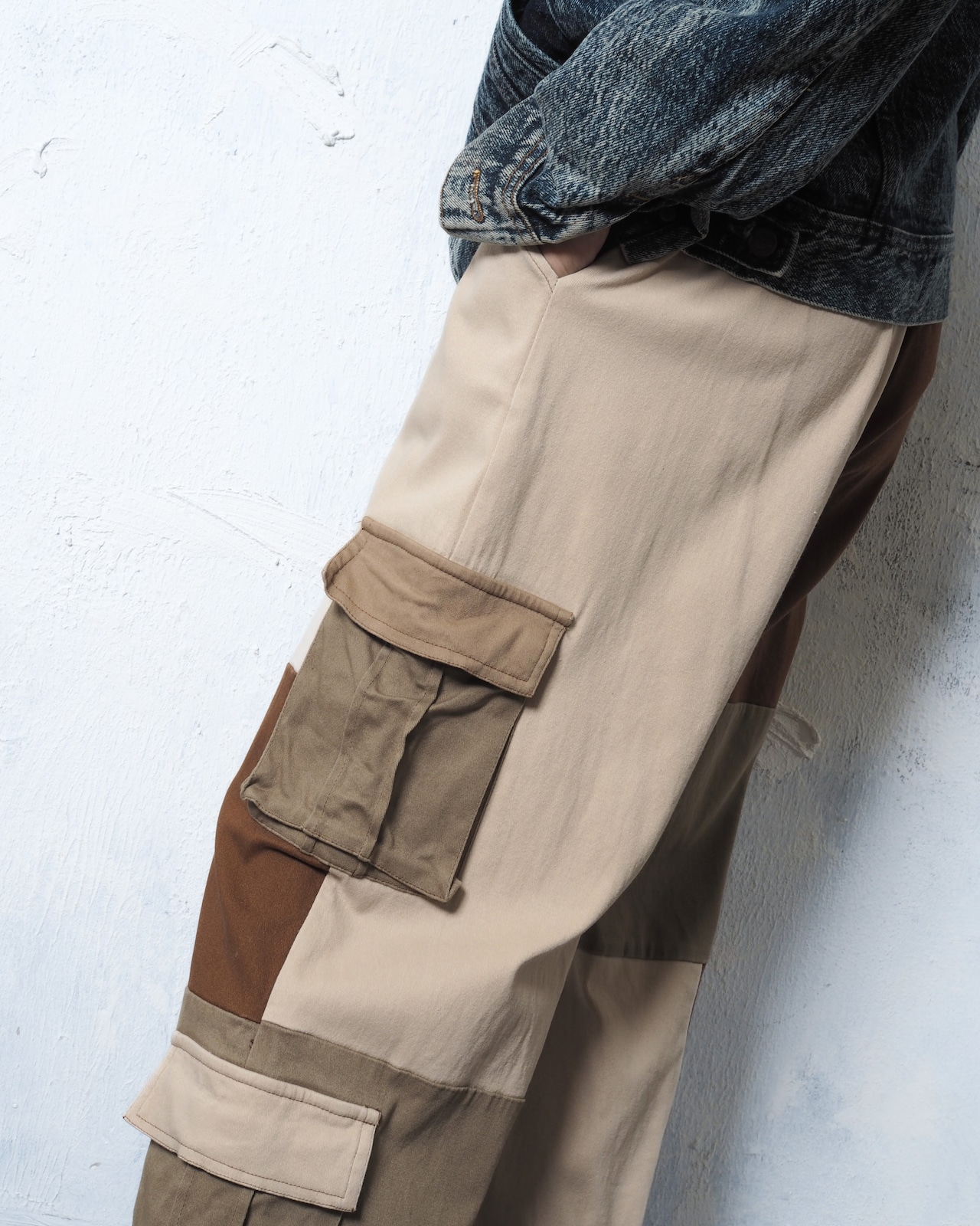 秋を感じるパッチワークカラーで両サイドにポケットが2個ずつ付く、一癖カーゴパンツ