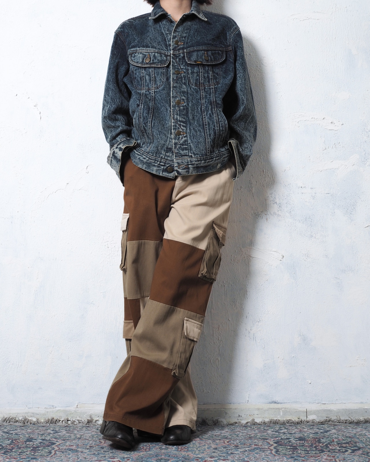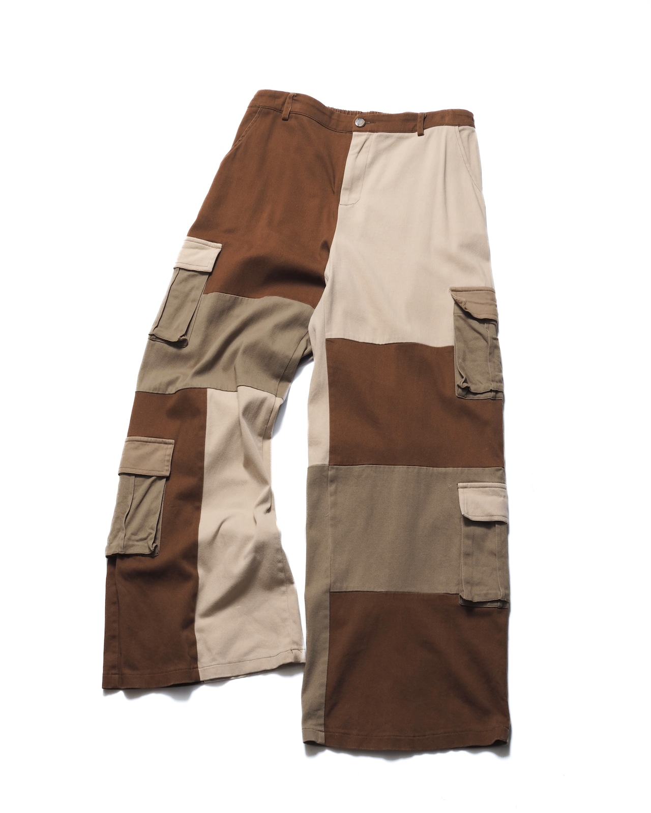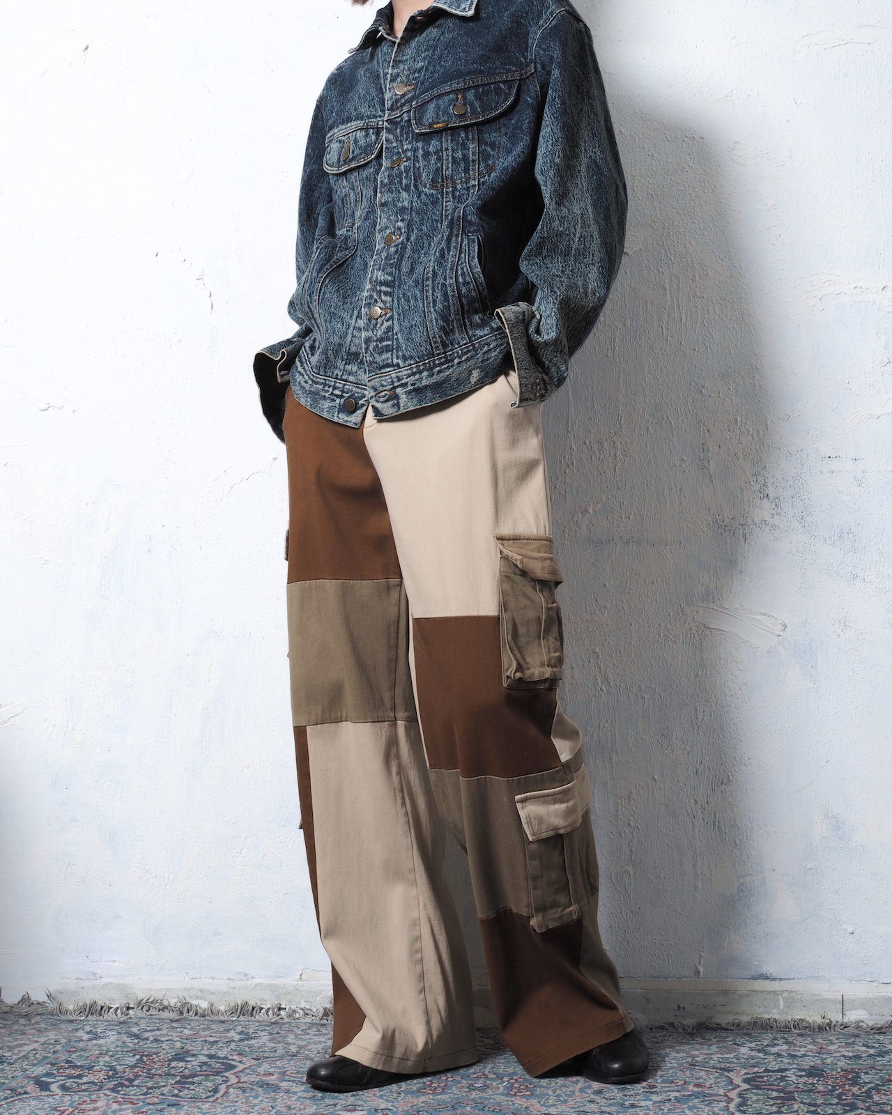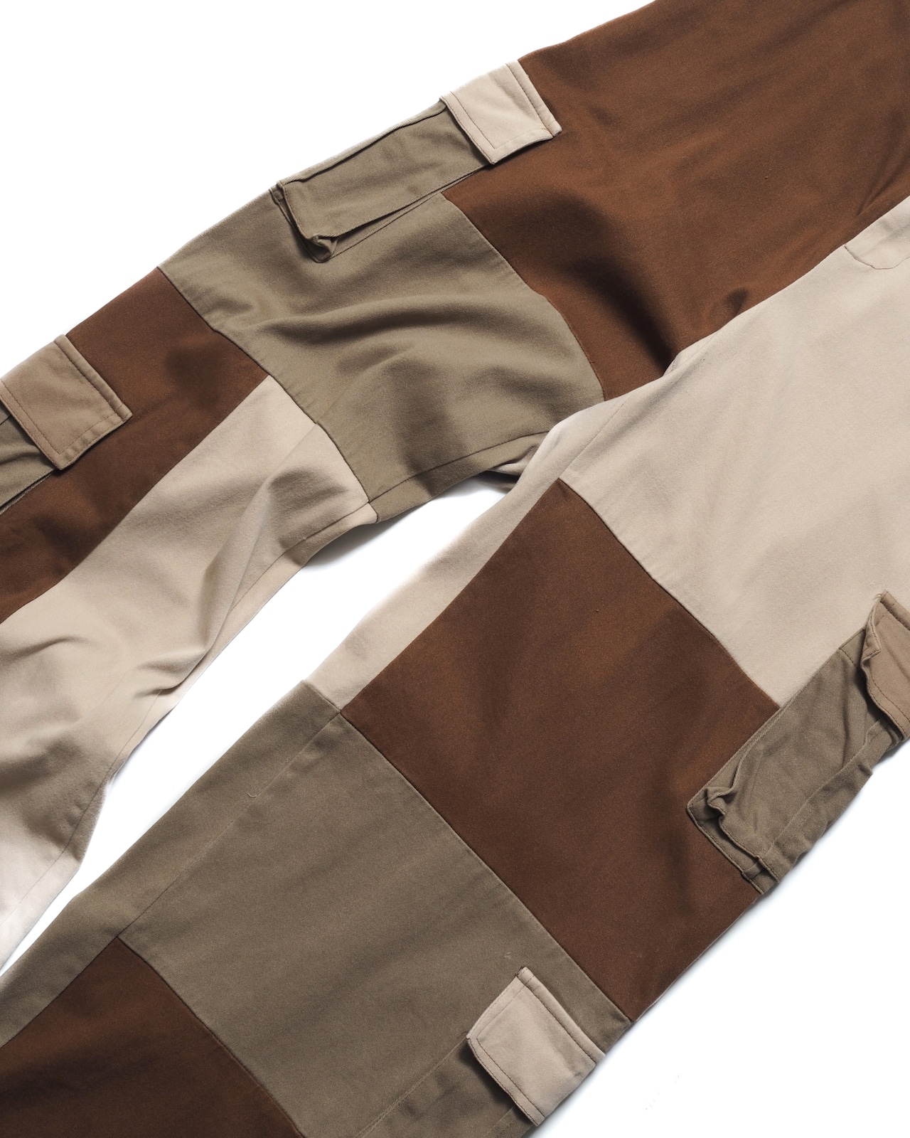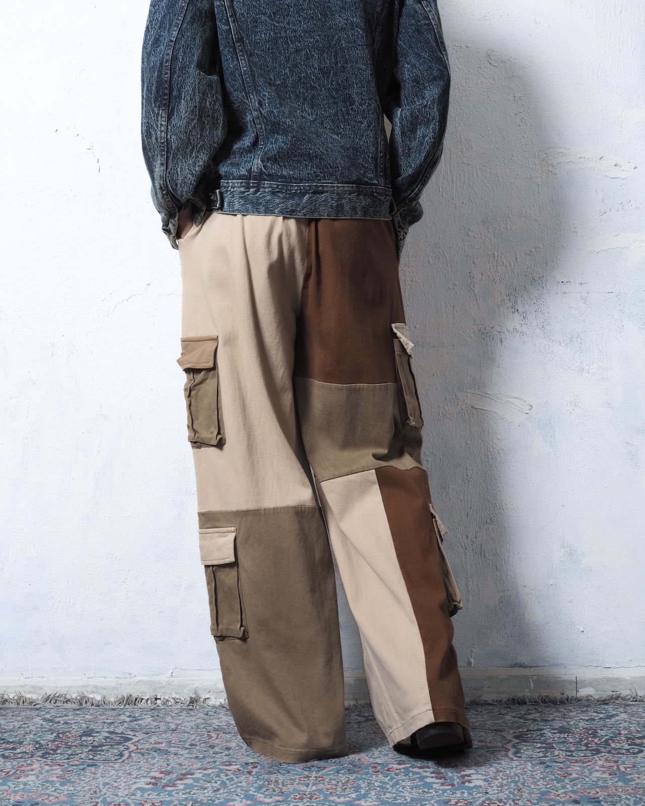 秋を感じるパッチワークカラーで両サイドにポケットが2個ずつ付く、一癖カーゴパンツ