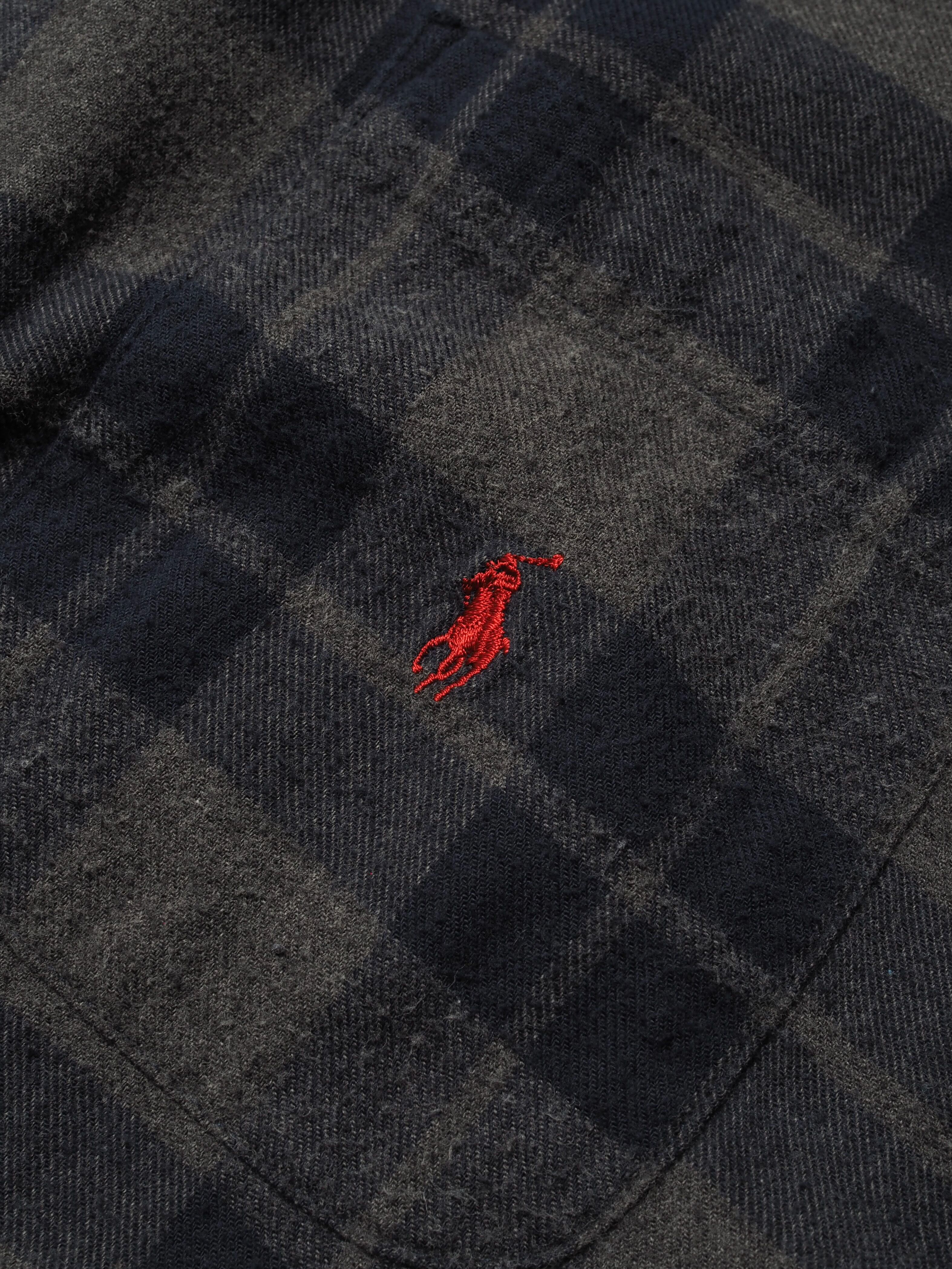 ネイビー×グレーの落ち着いたチェックに胸の赤ポニー