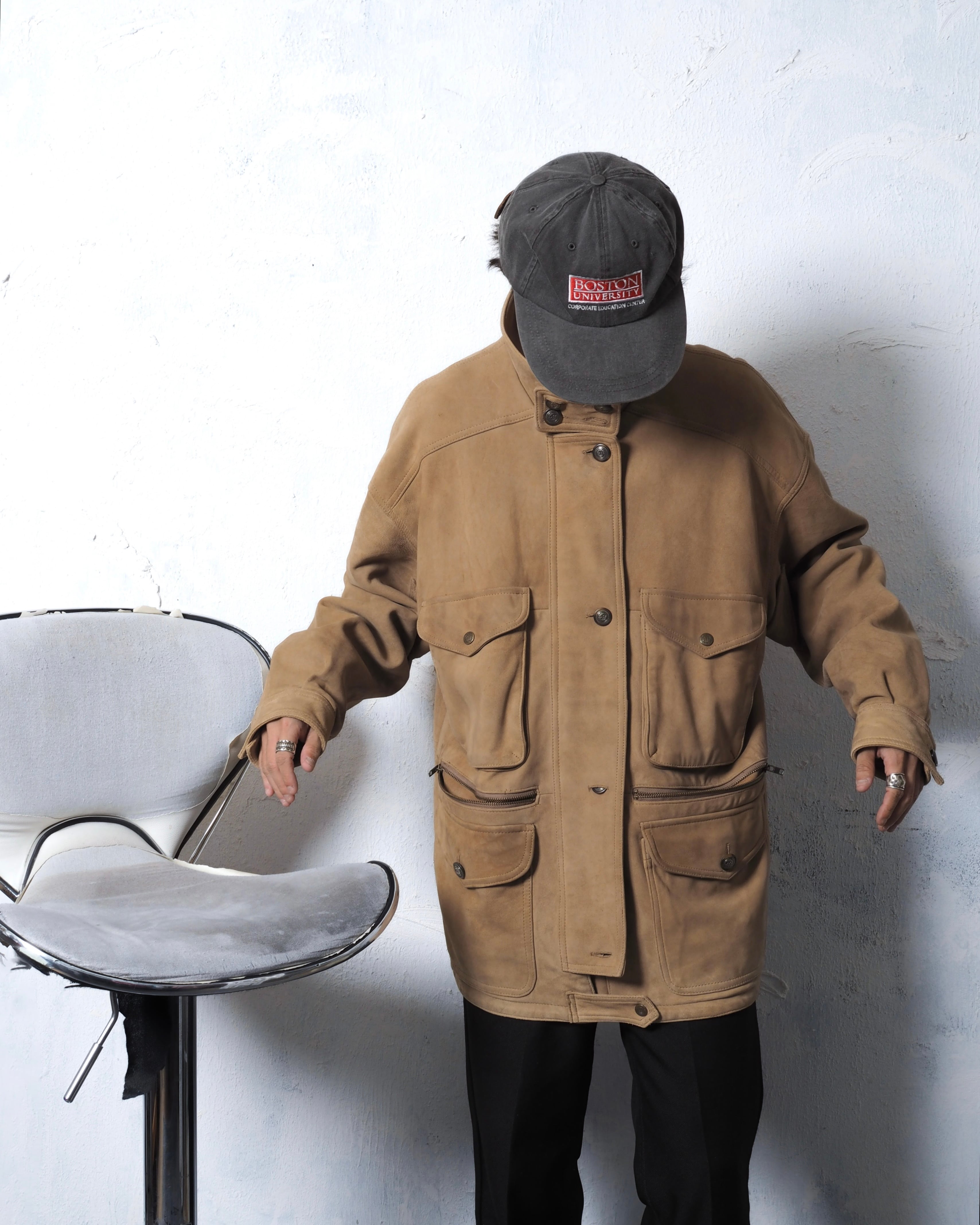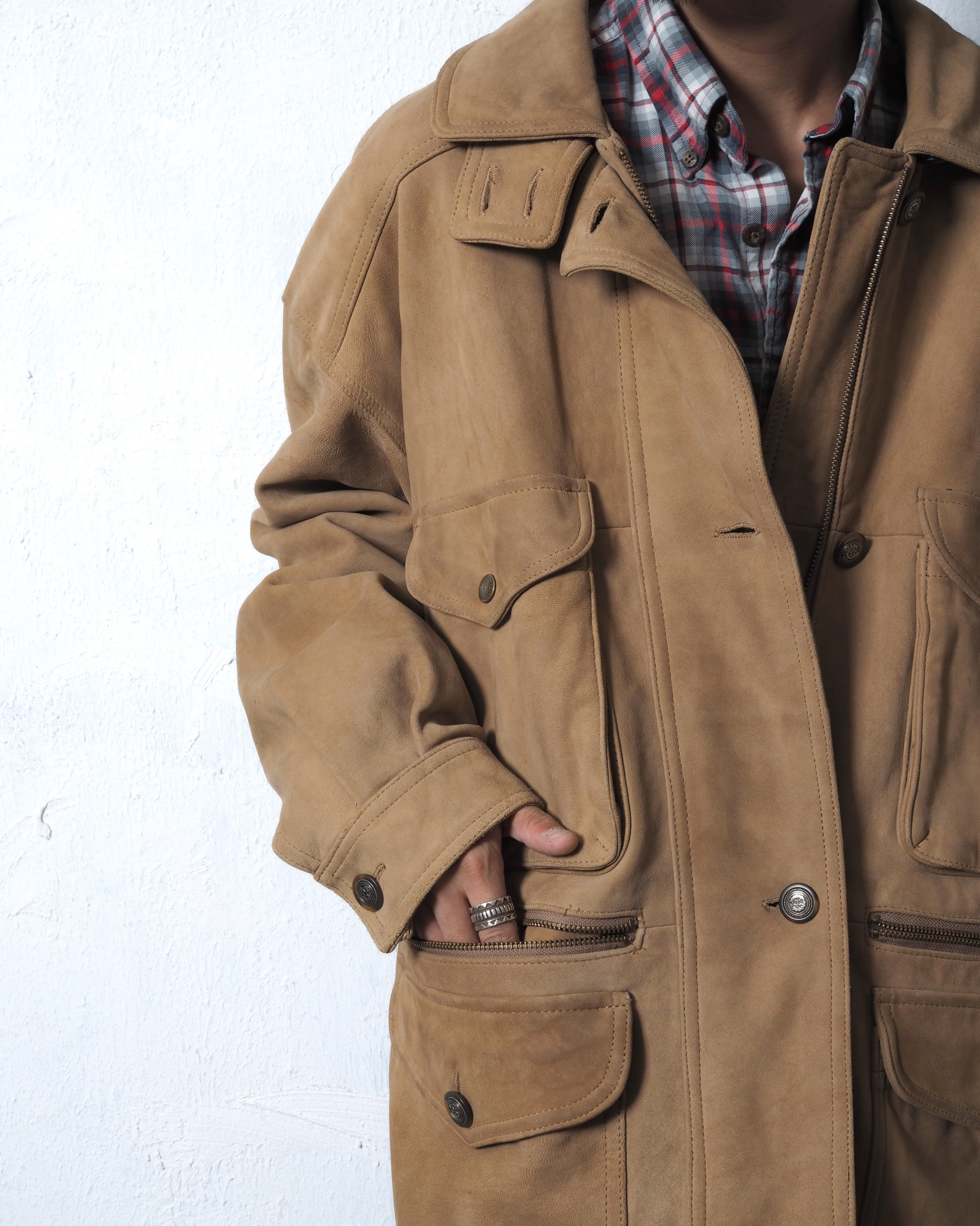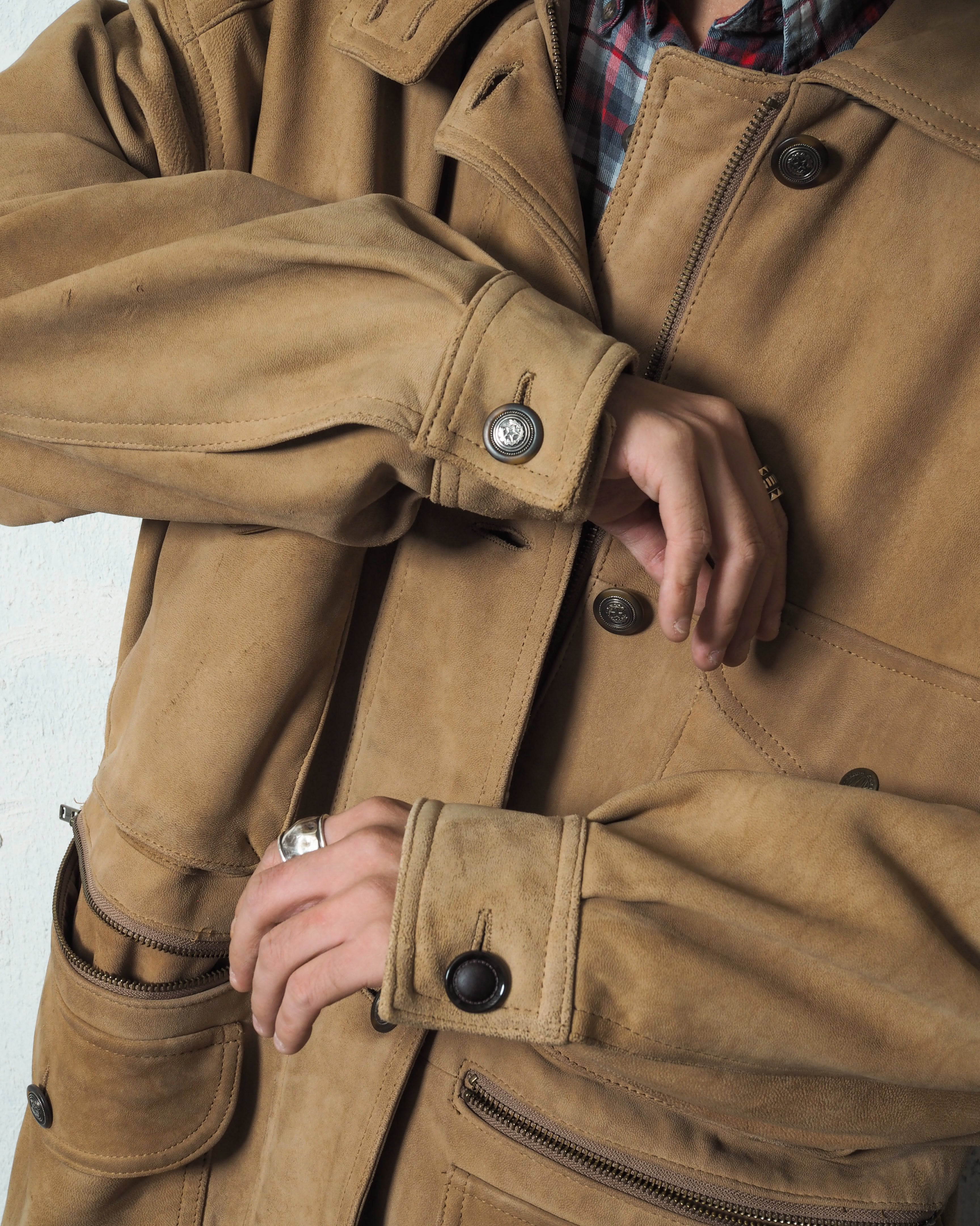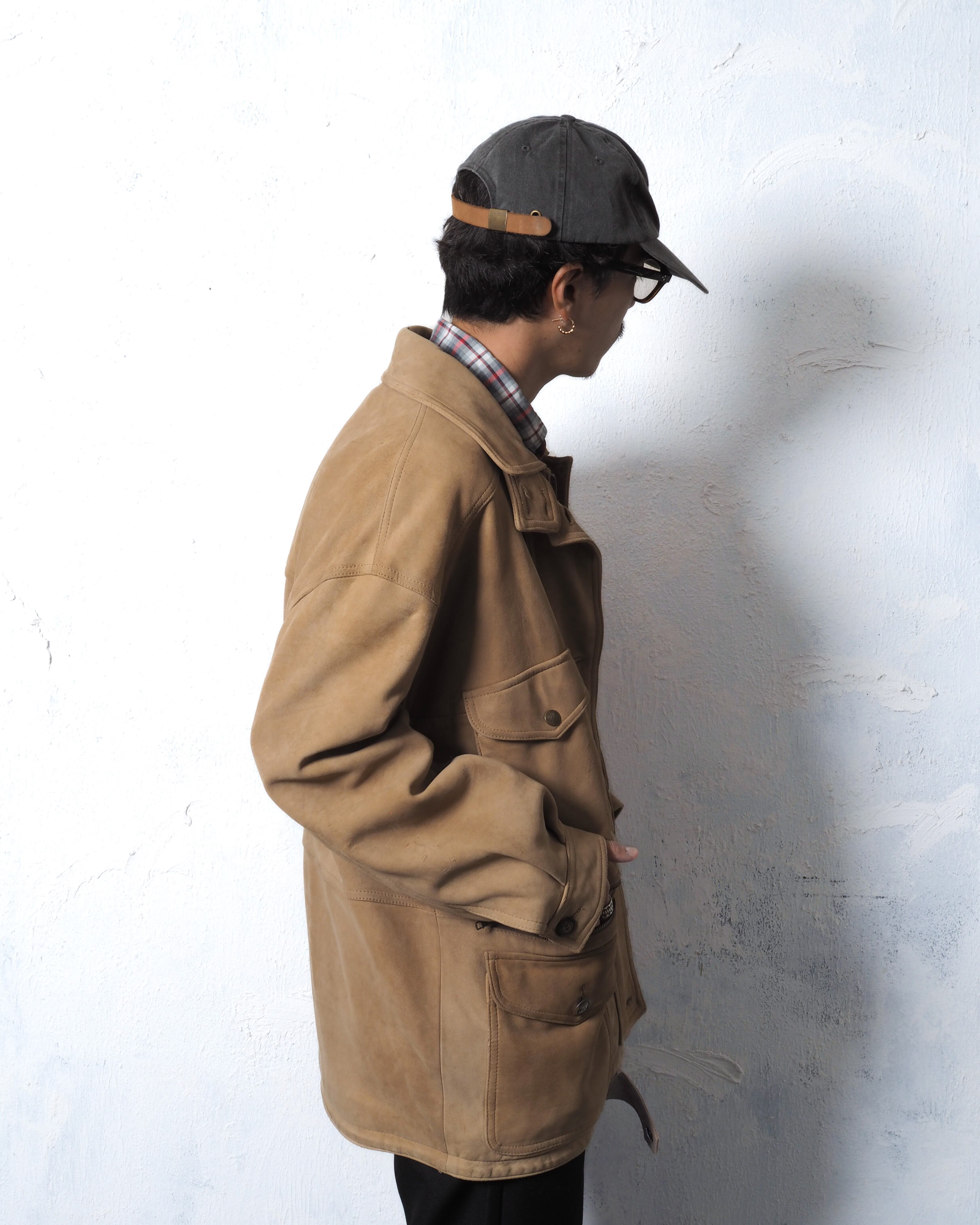 ヌバックレザーにジップポケットや装飾ボタン、要所要所にブランドらしい遊びを感じれます
