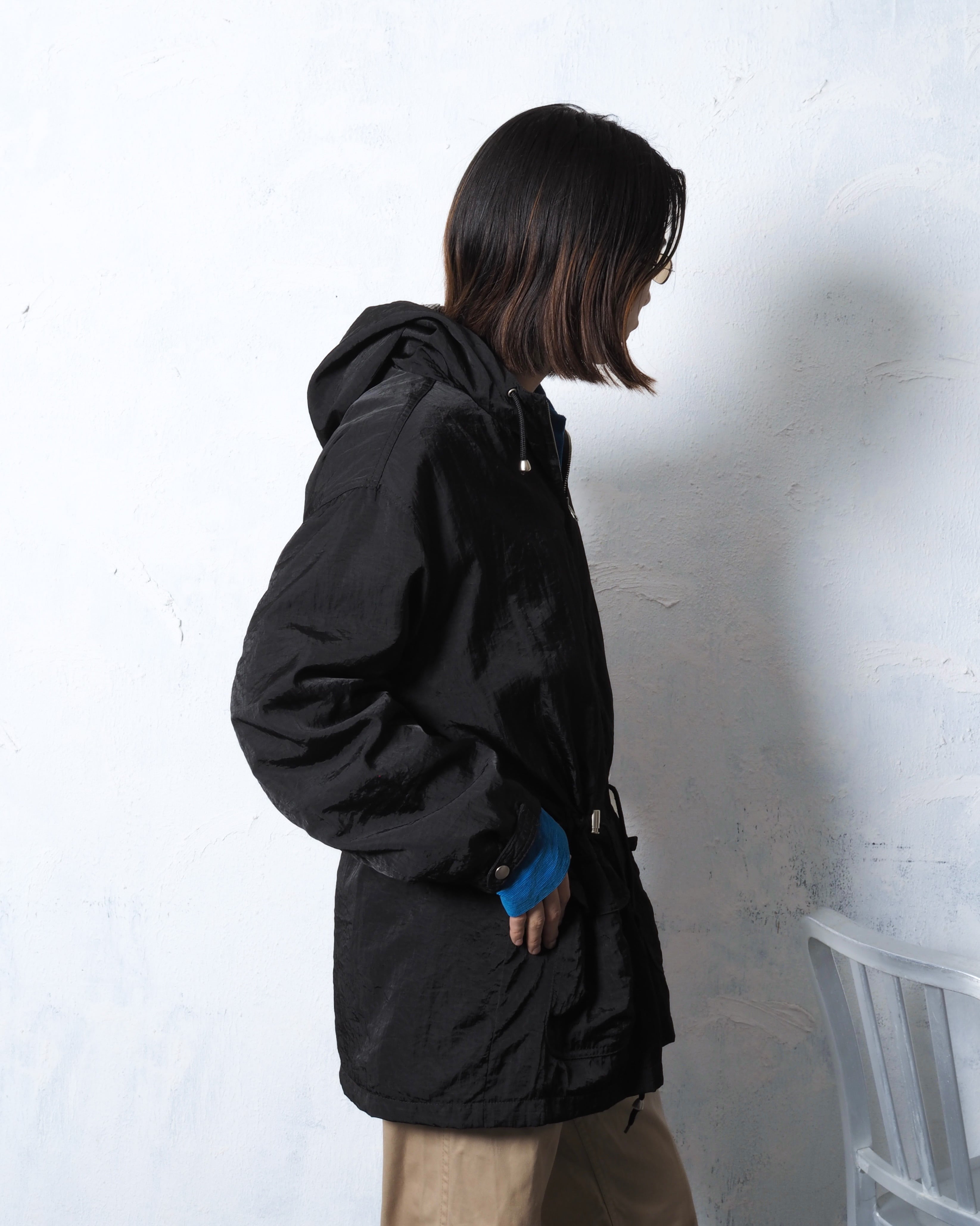 黒ボディにミドル丈、フロントにはギャザーの寄ったデザイン、ナイロンとアンニュイな雰囲気がマッチした一着