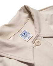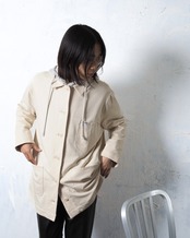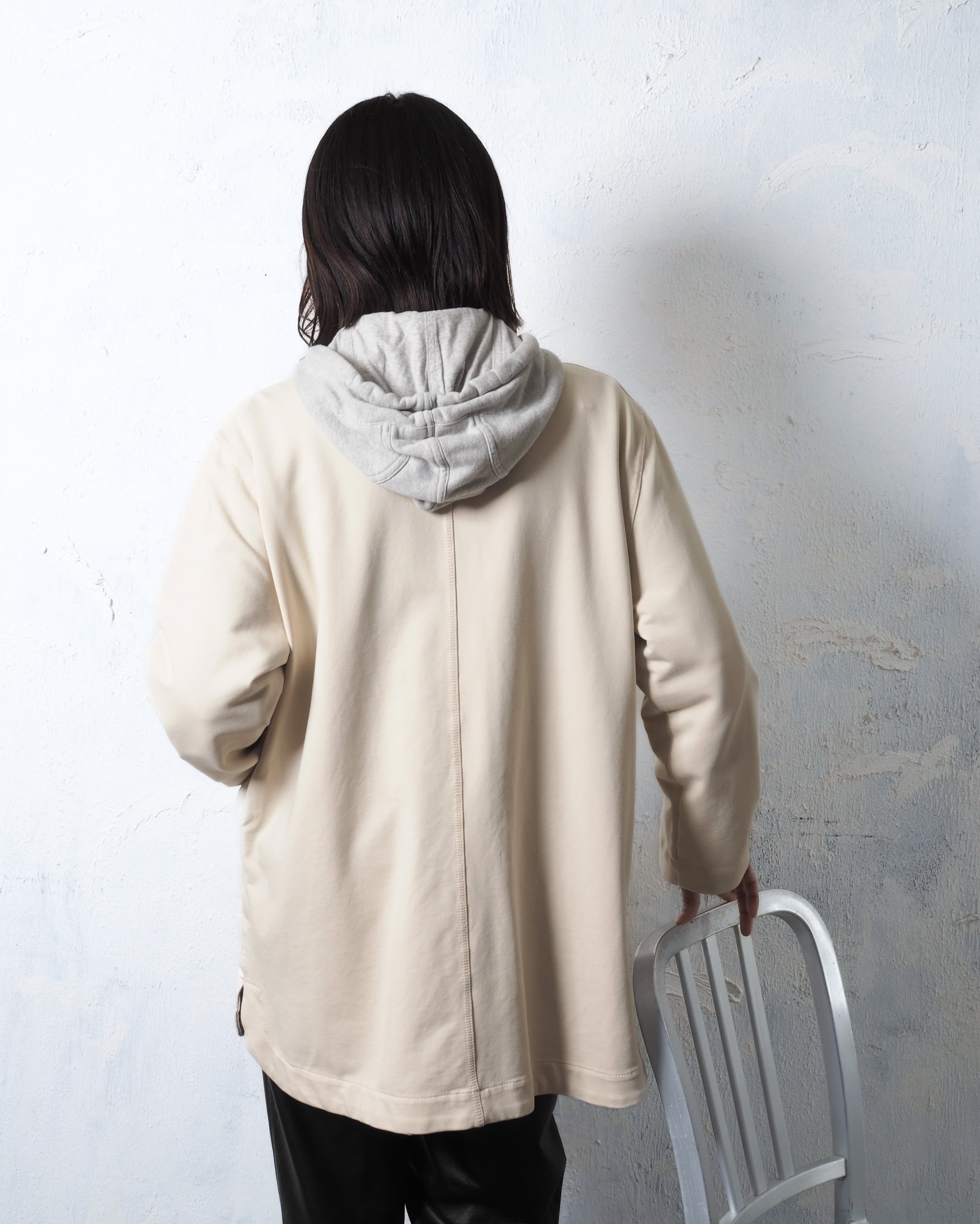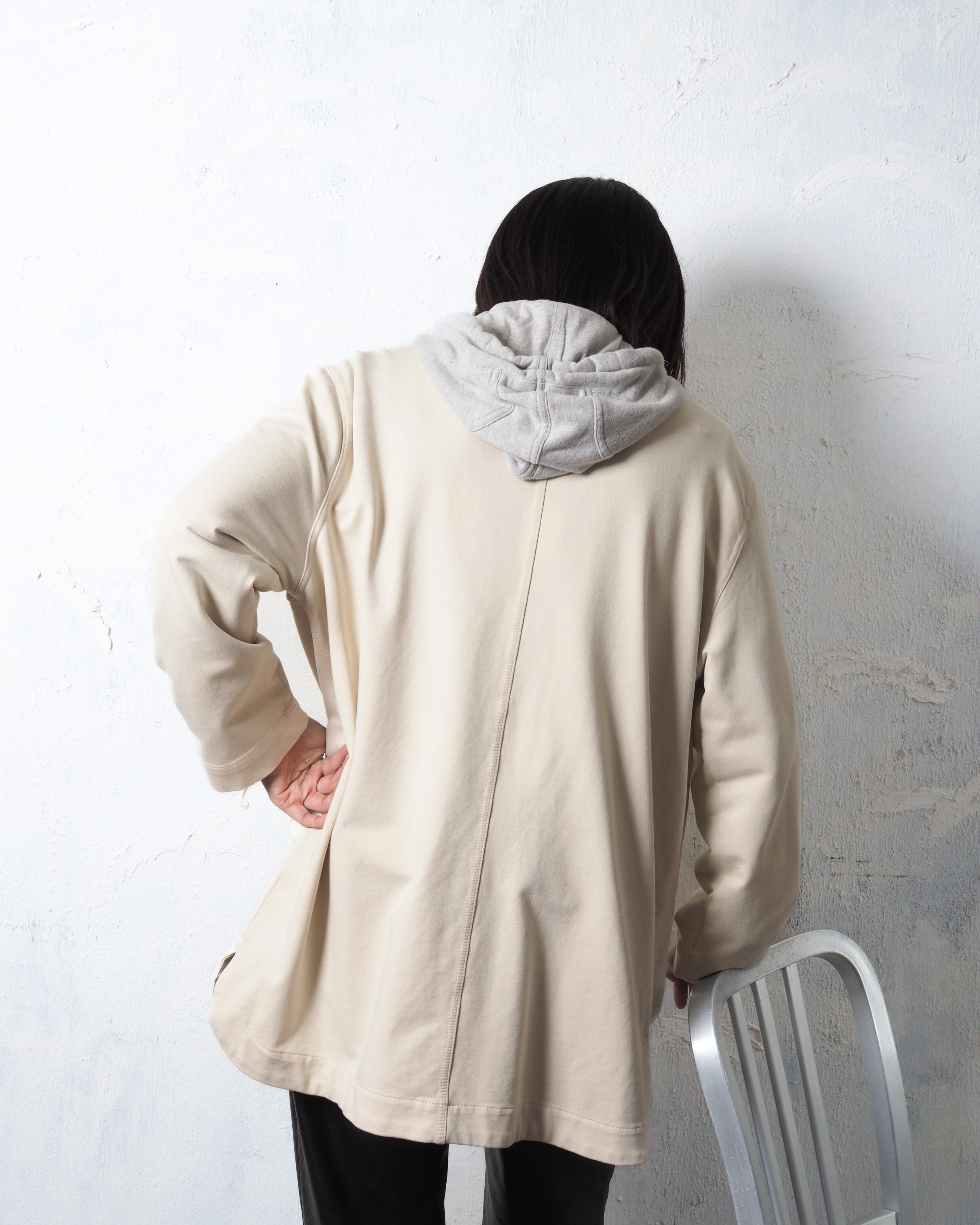 異素材カバーオール、アイボリーのカラーリングで、エラスタンミックスの独特な伸縮性のある素材感