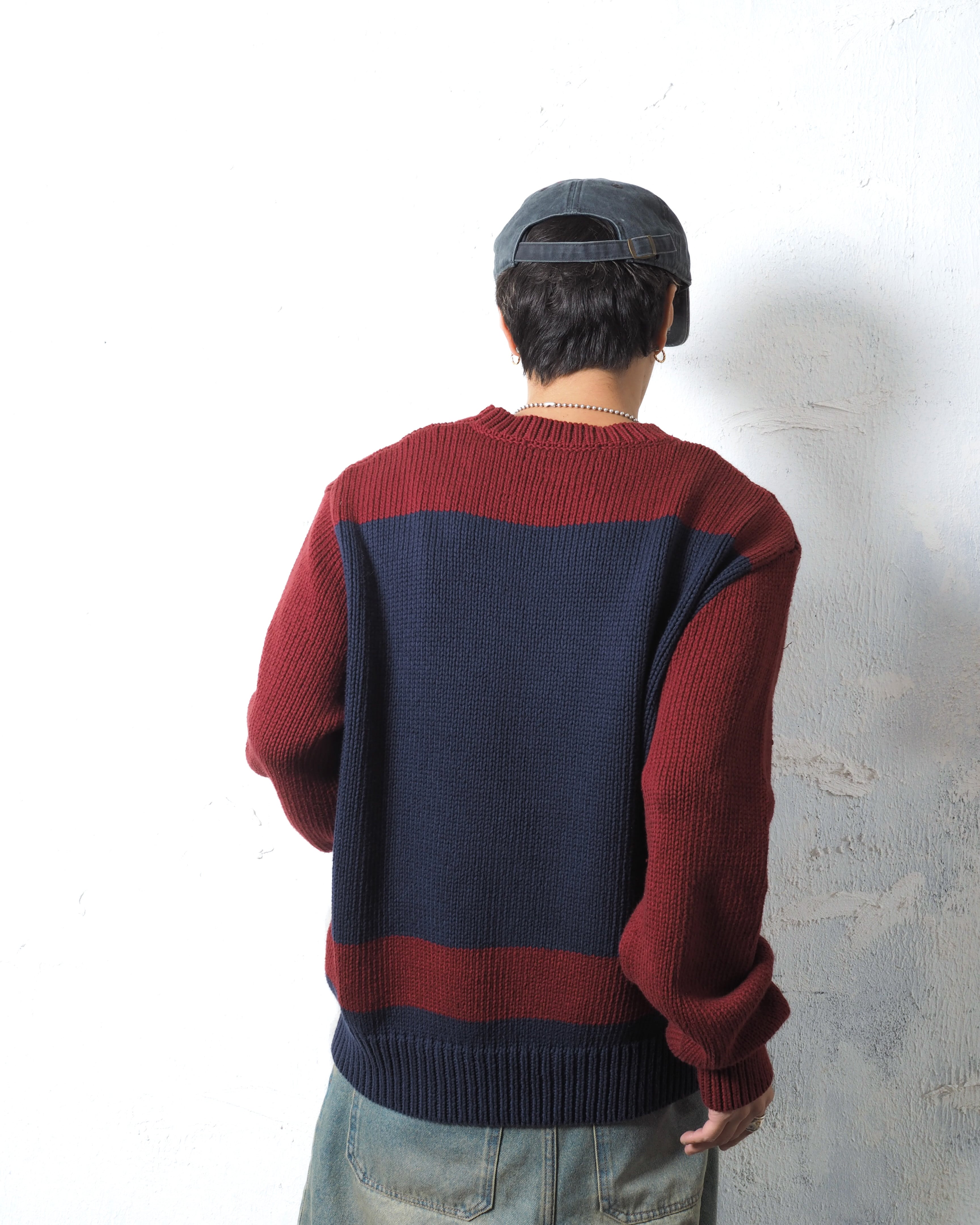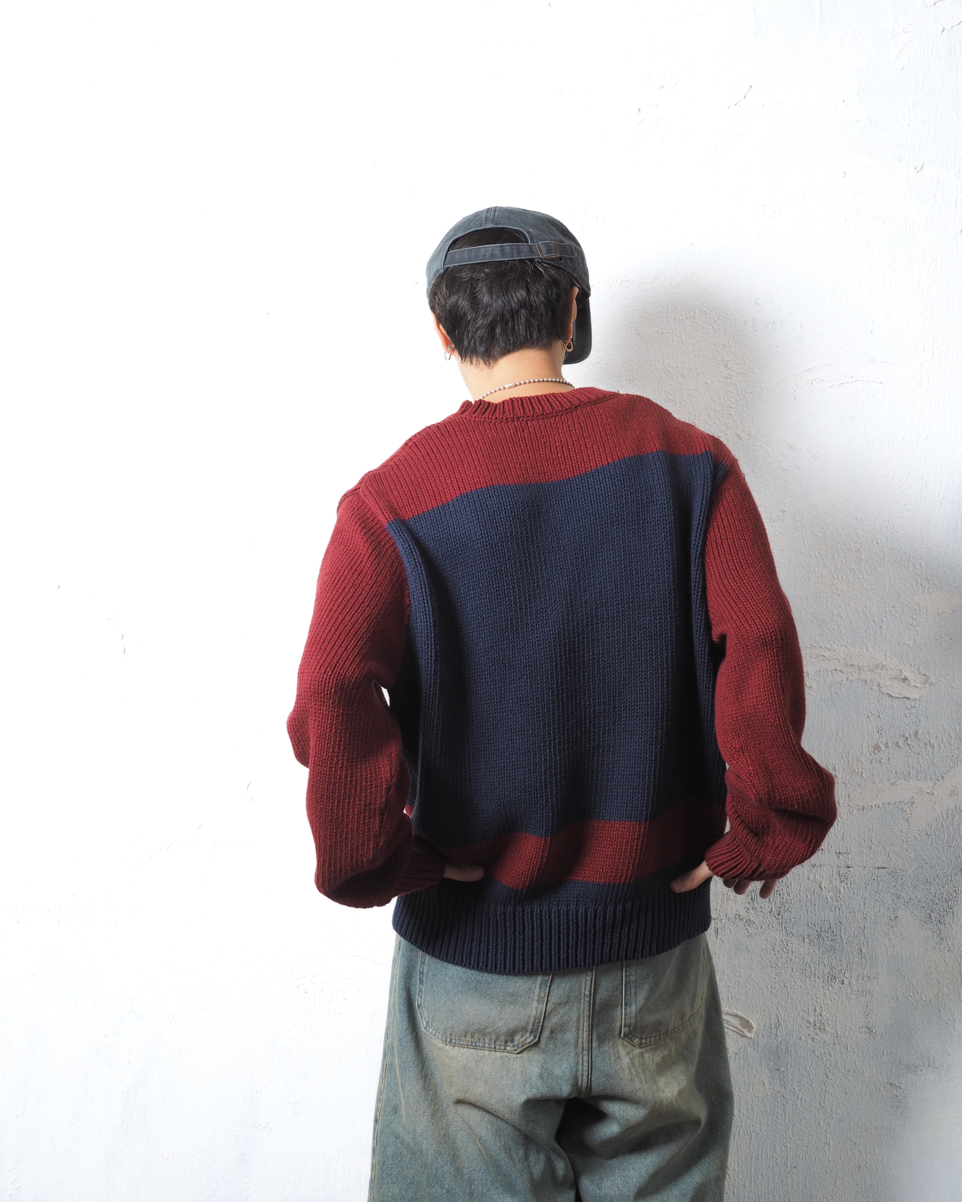 ローゲージ編みにカレッジノリな配色と