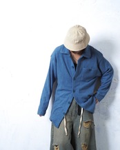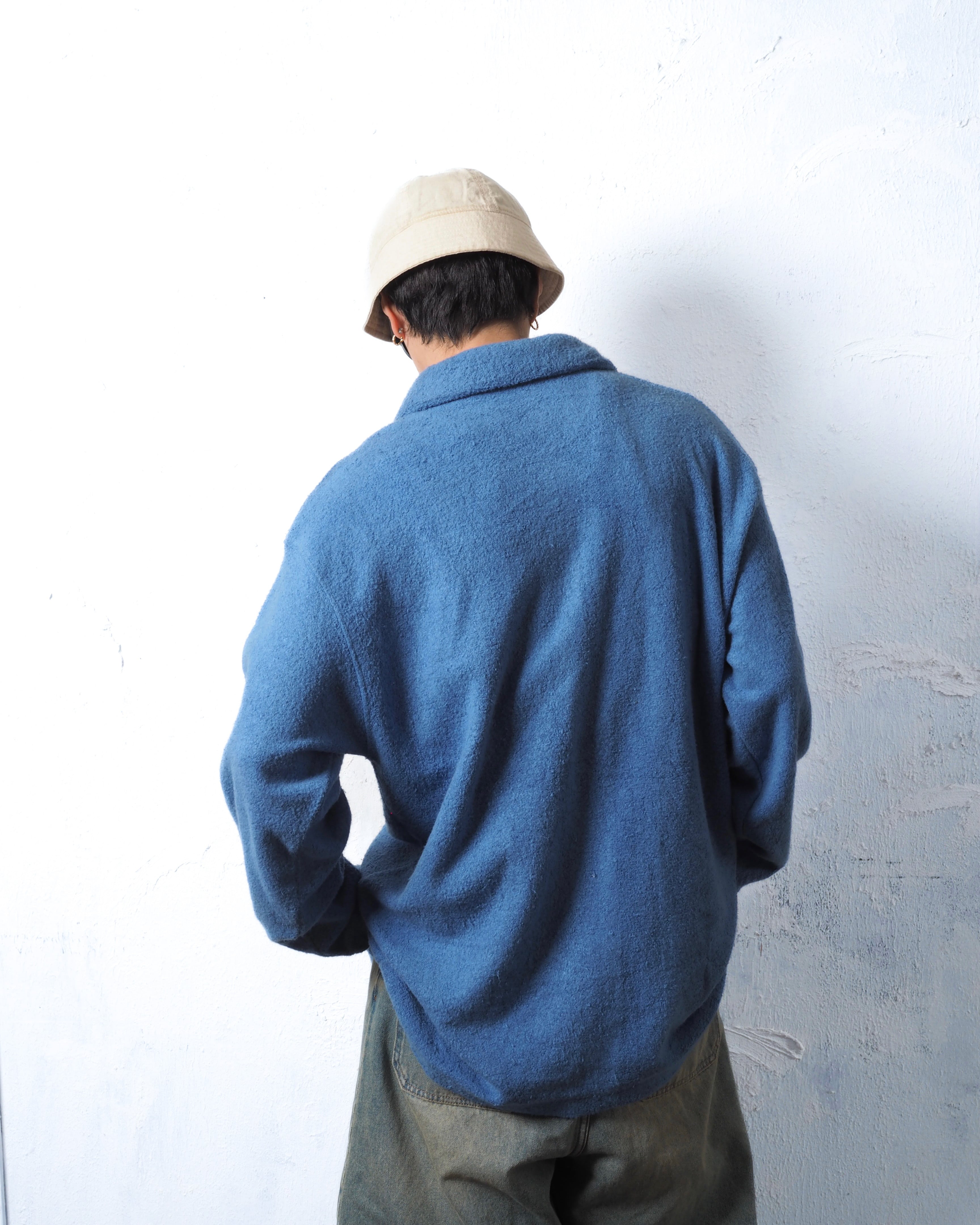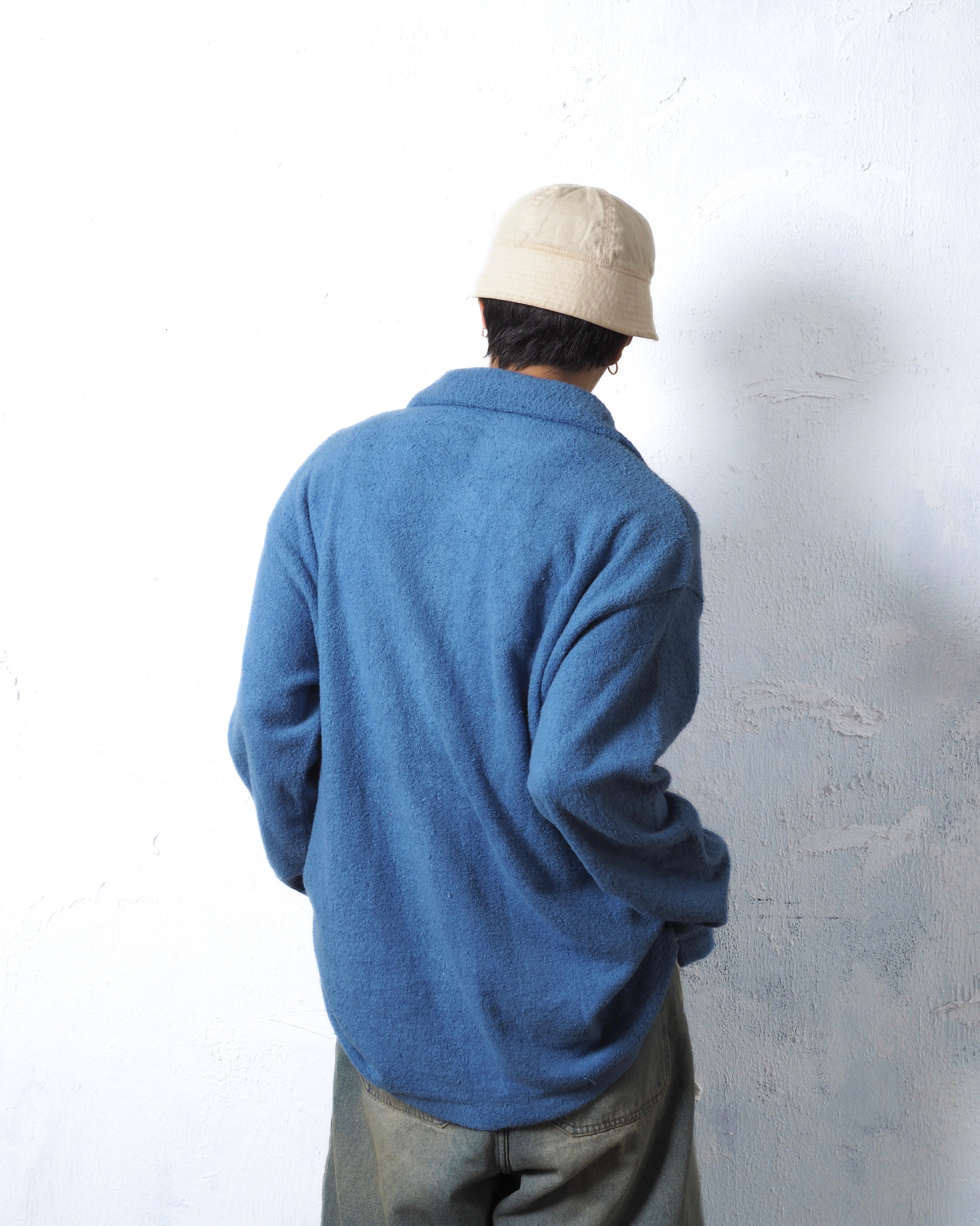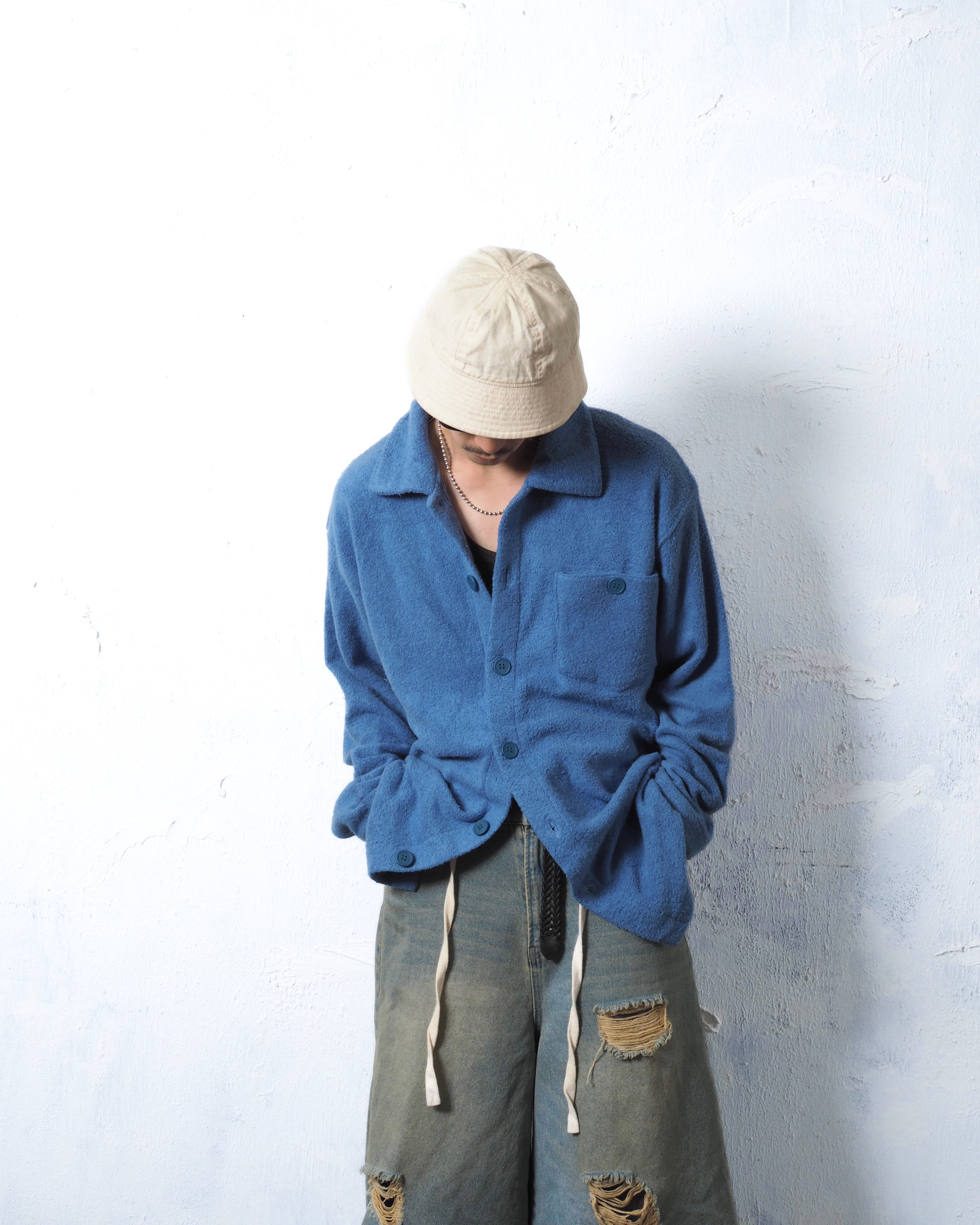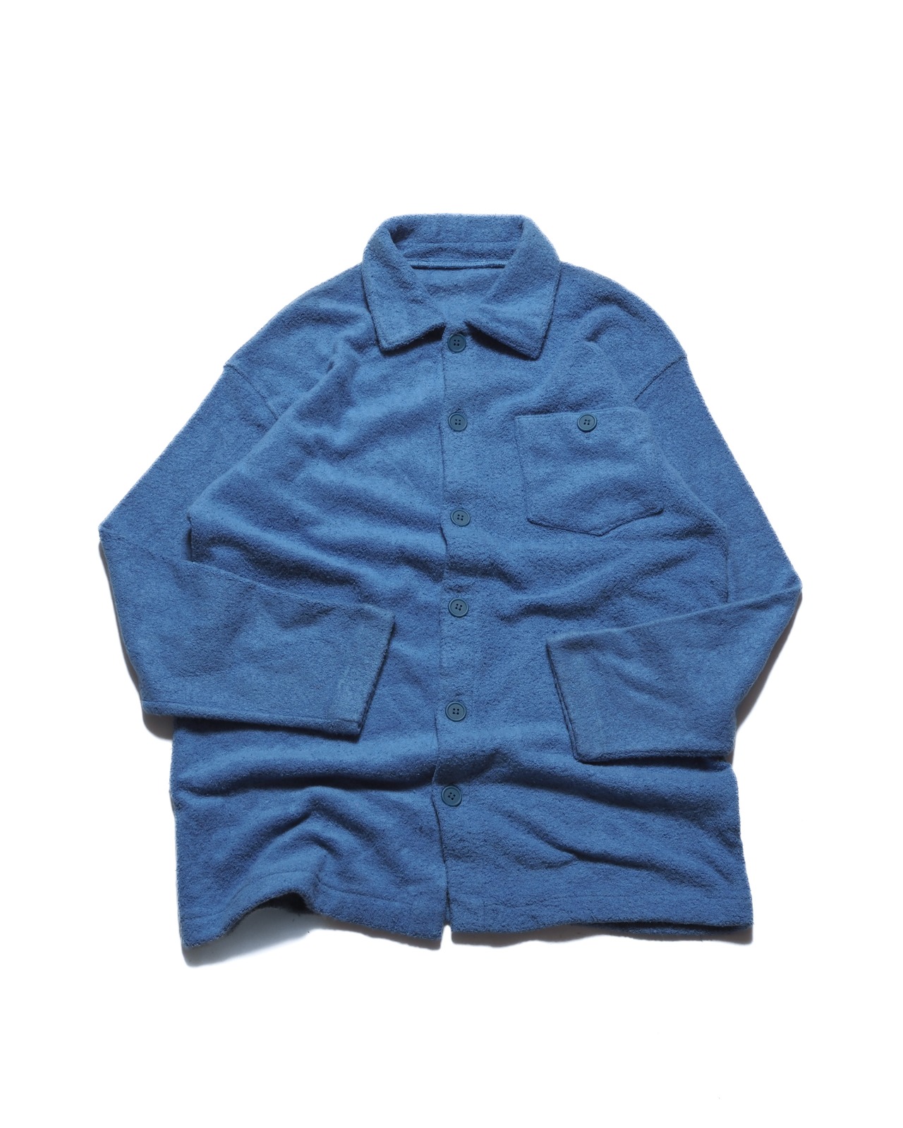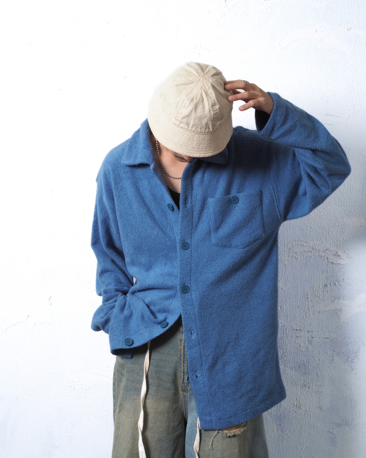 紫に近いブルーカラーにパイルの素材感のアンマッチ具合がまた趣のあるアイテム