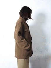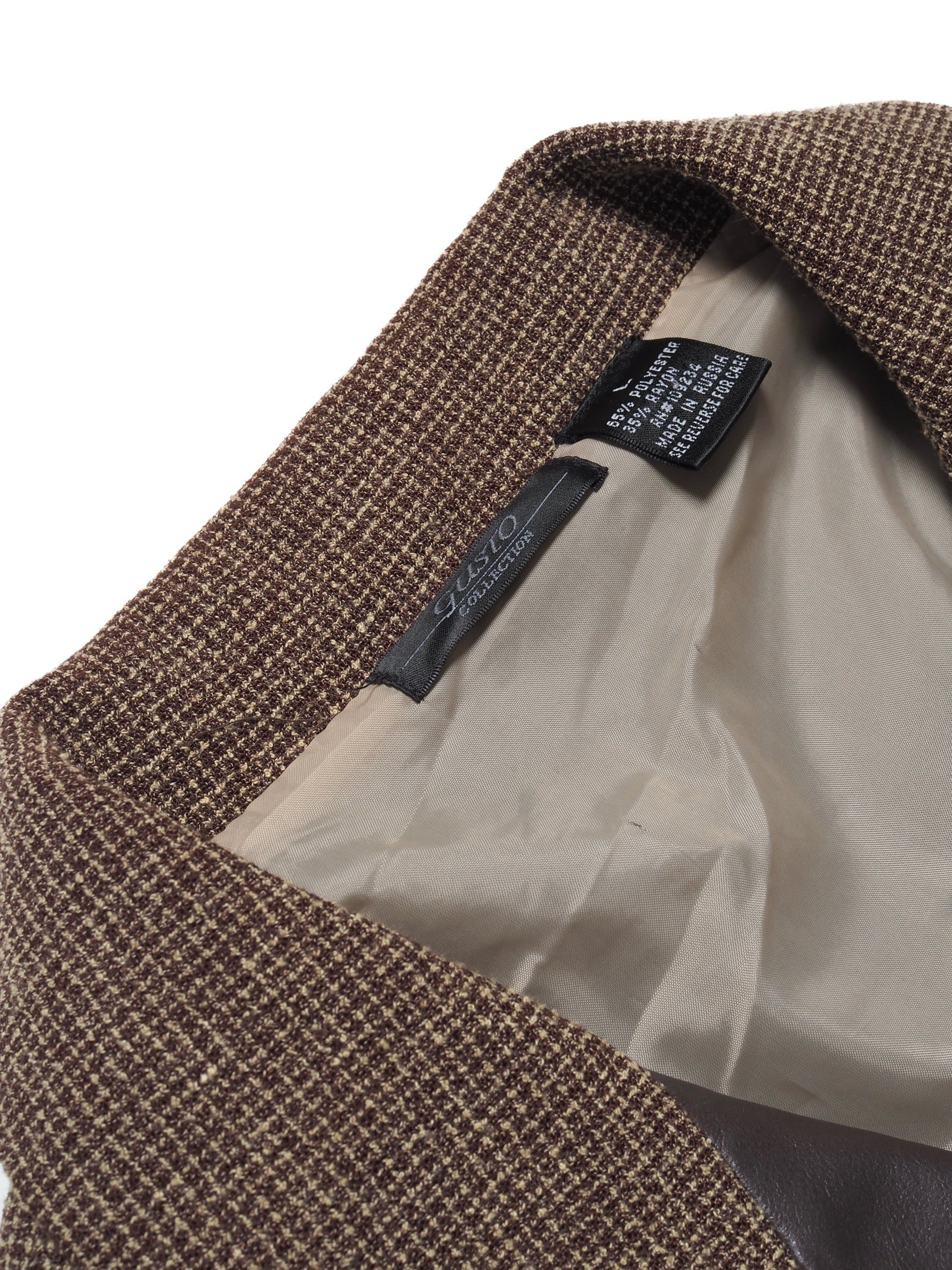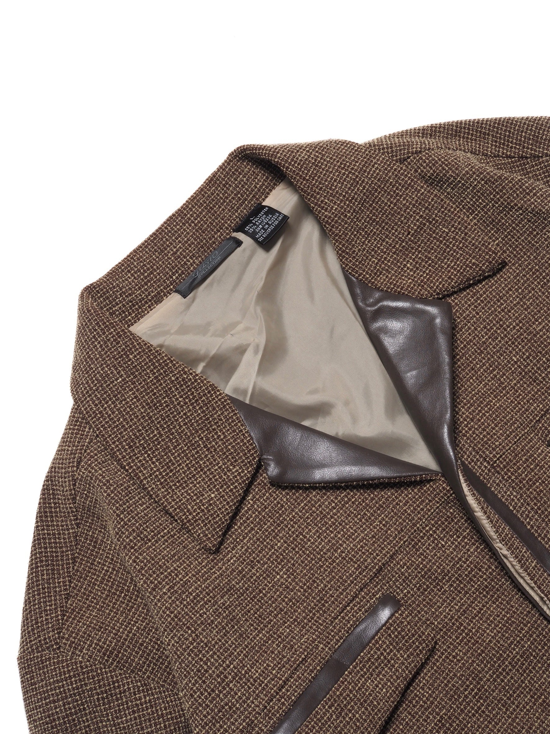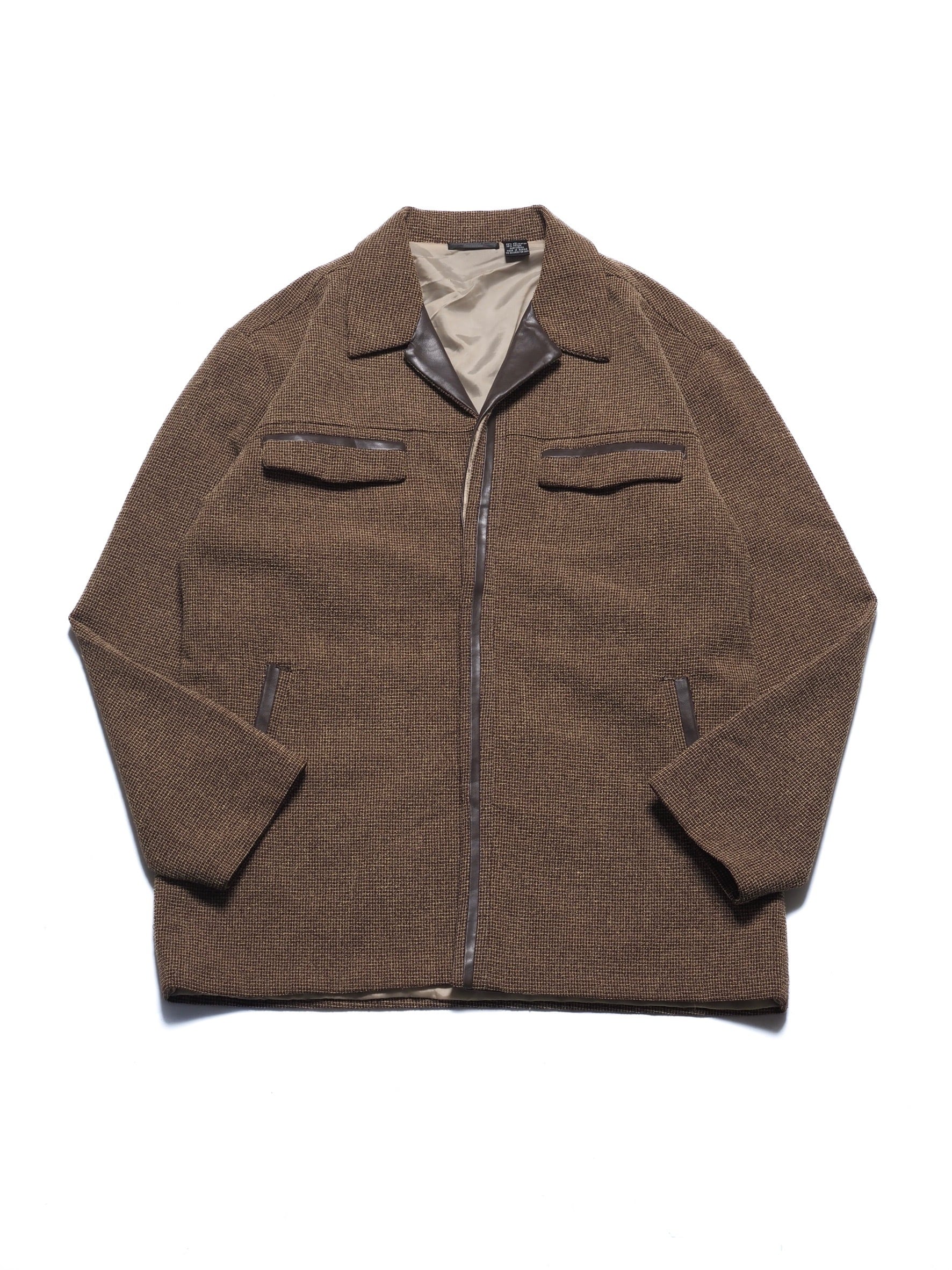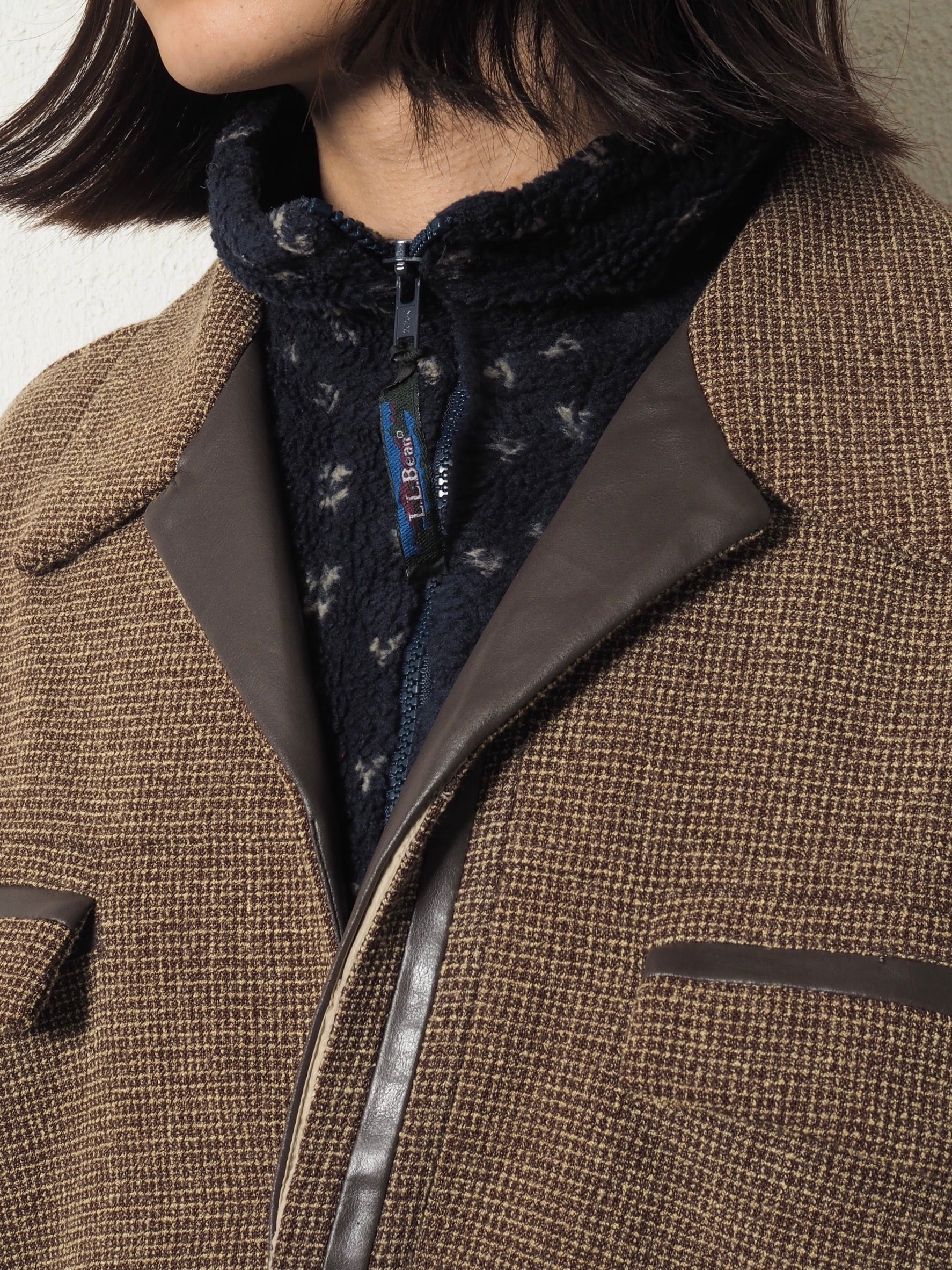 レーヨンポリの素材でツイード織、襟元やポケットのレザー切り替えは少し上品さもありつつ