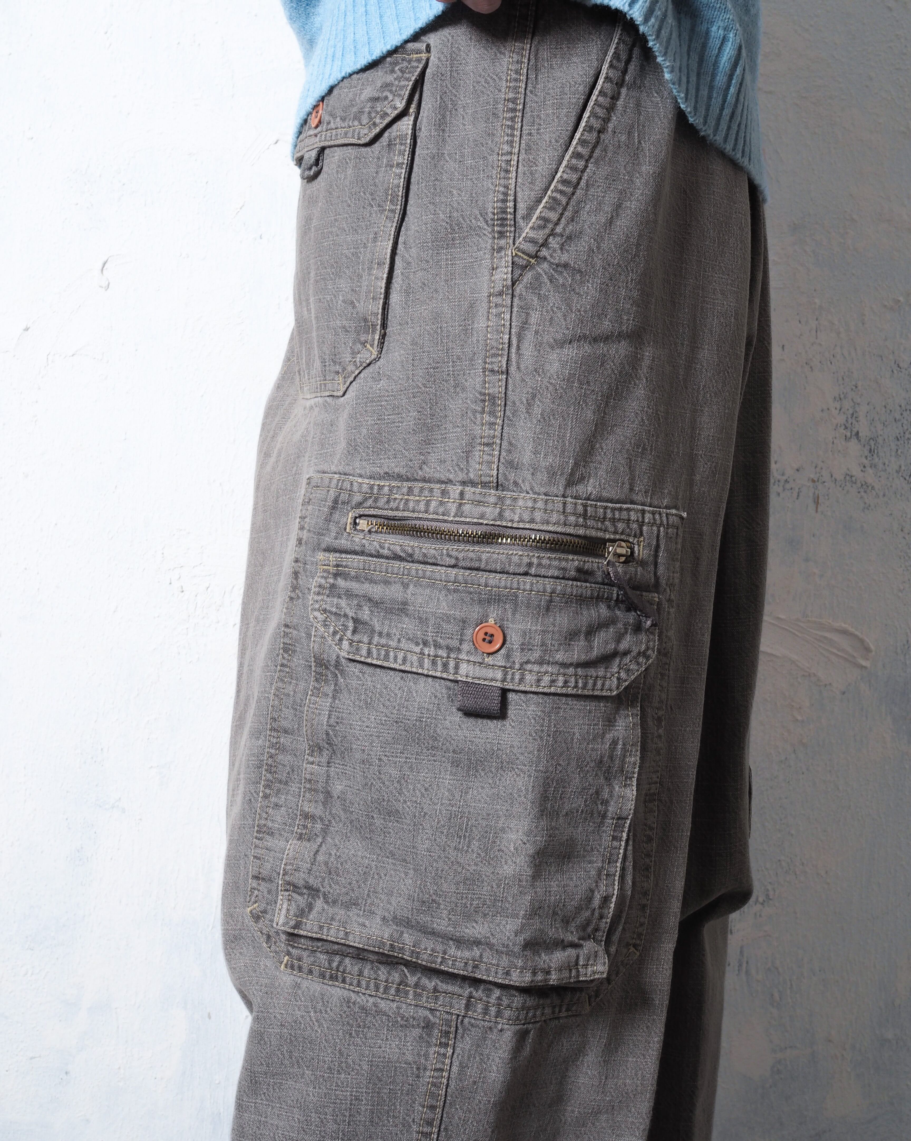 先染め特有のグレー味が強い色落ちに少々デザインの効いたカーゴタイプのバギーデニムパンツ