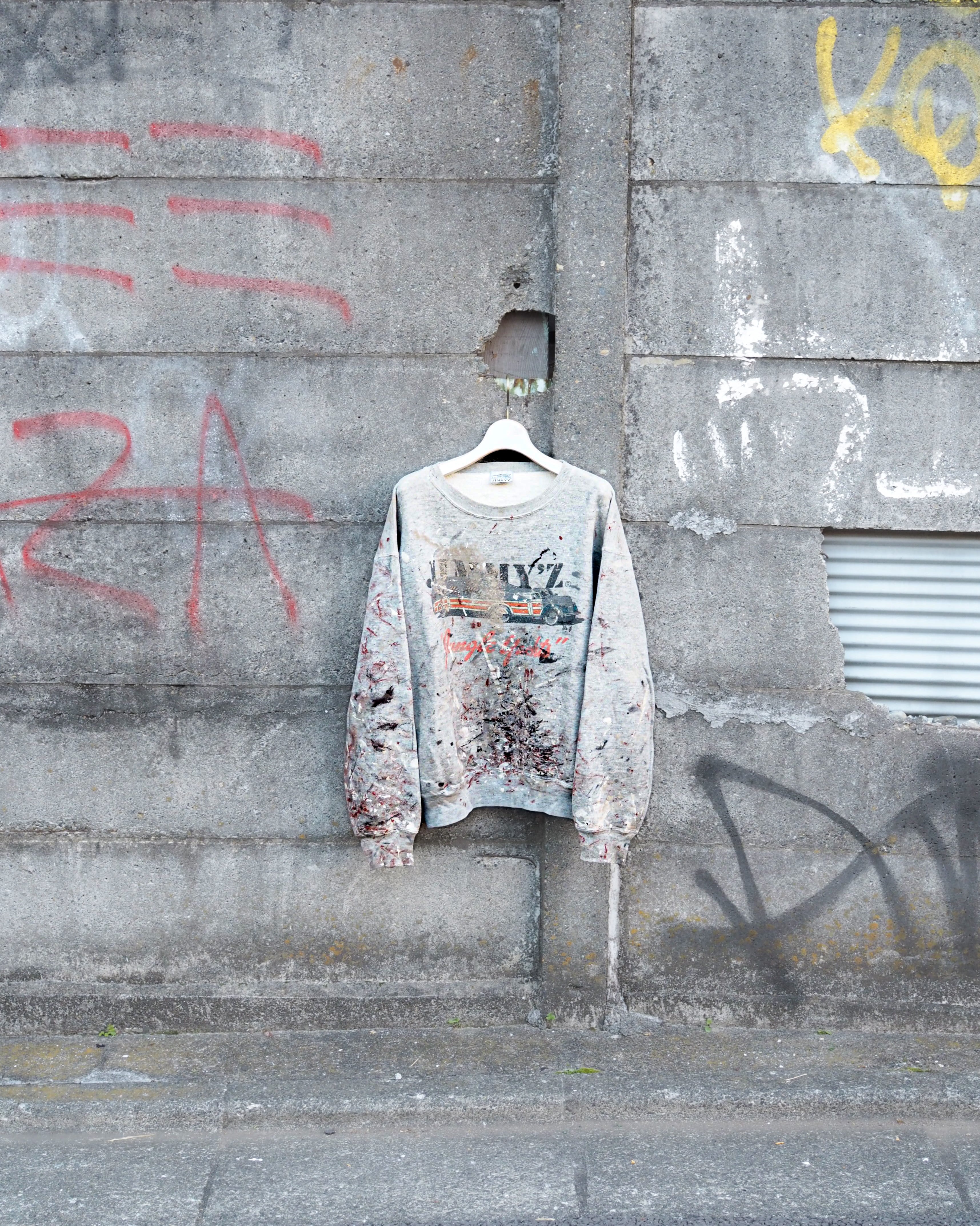 古着の醍醐味でもある1of1アイテム、ペイントのカスタムに加え、程よいボロ、ブランドはあのジミーズ