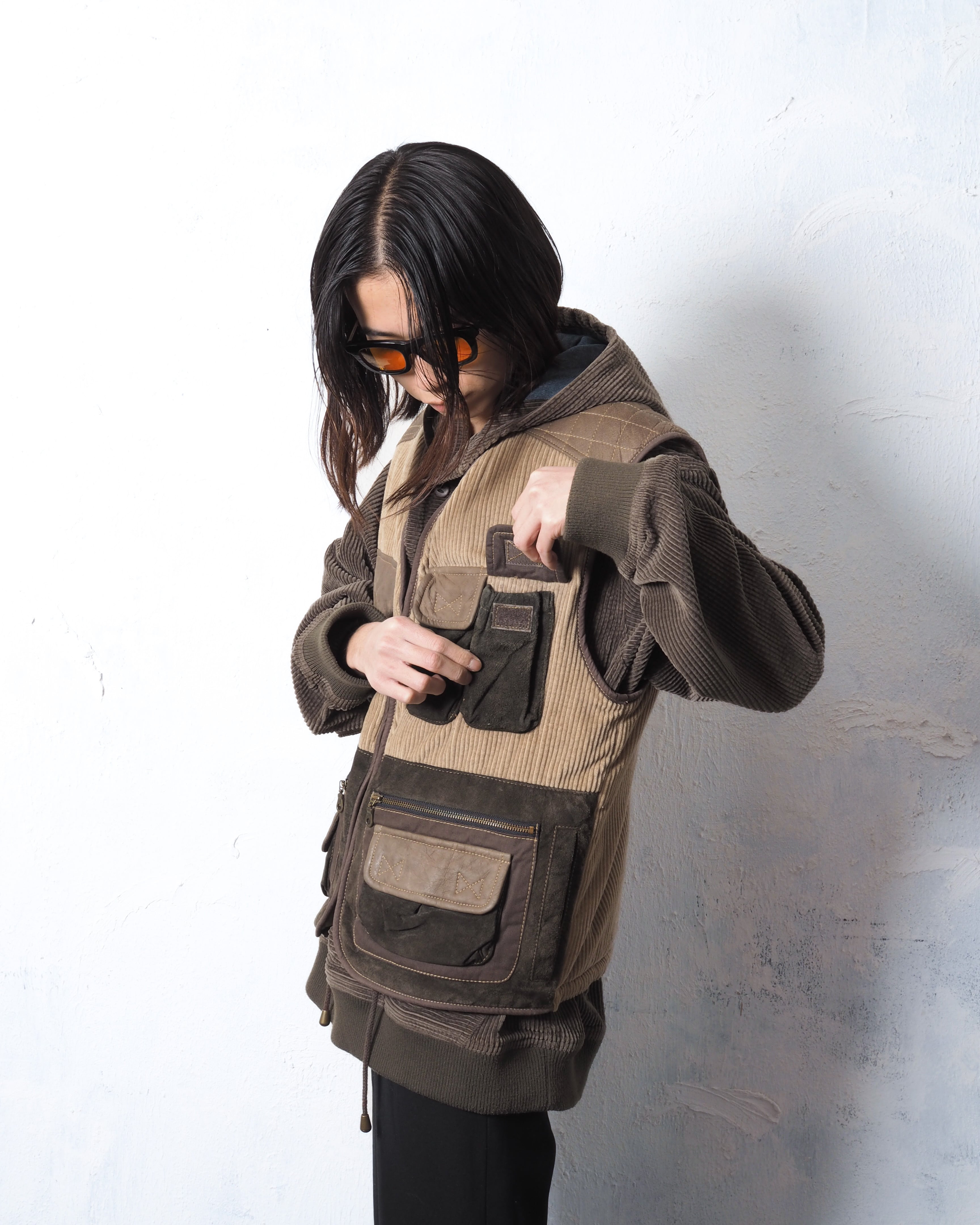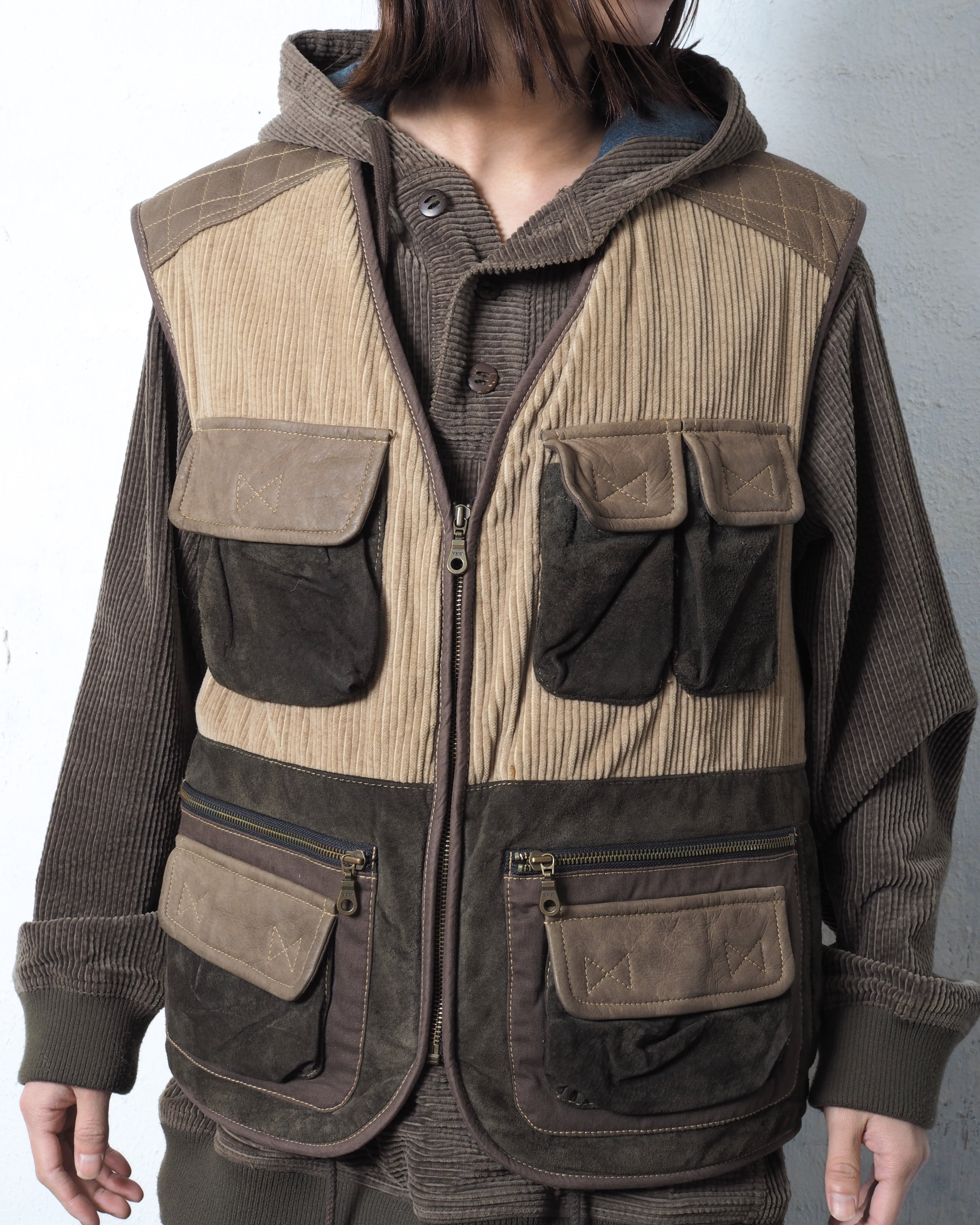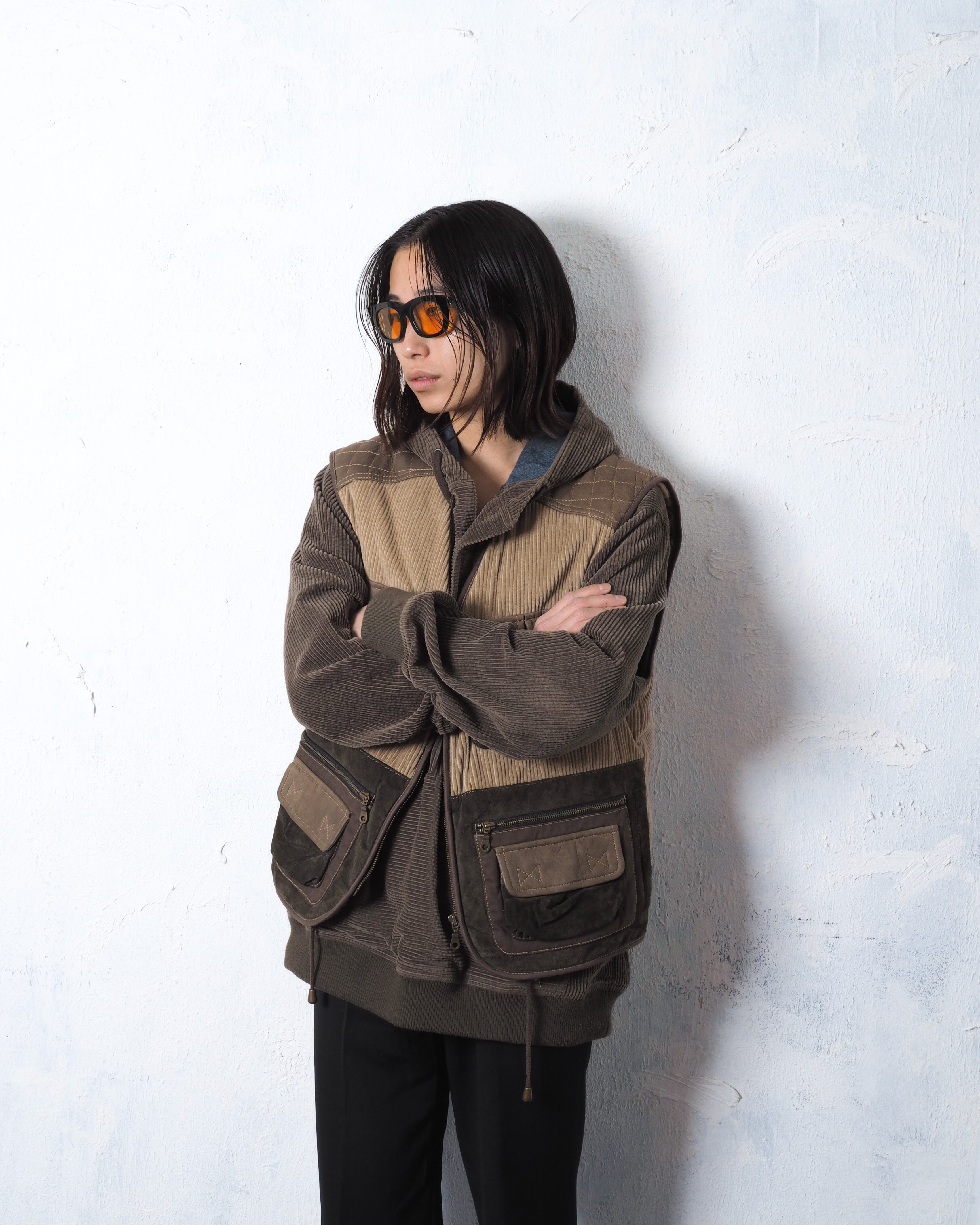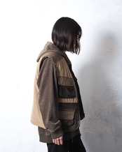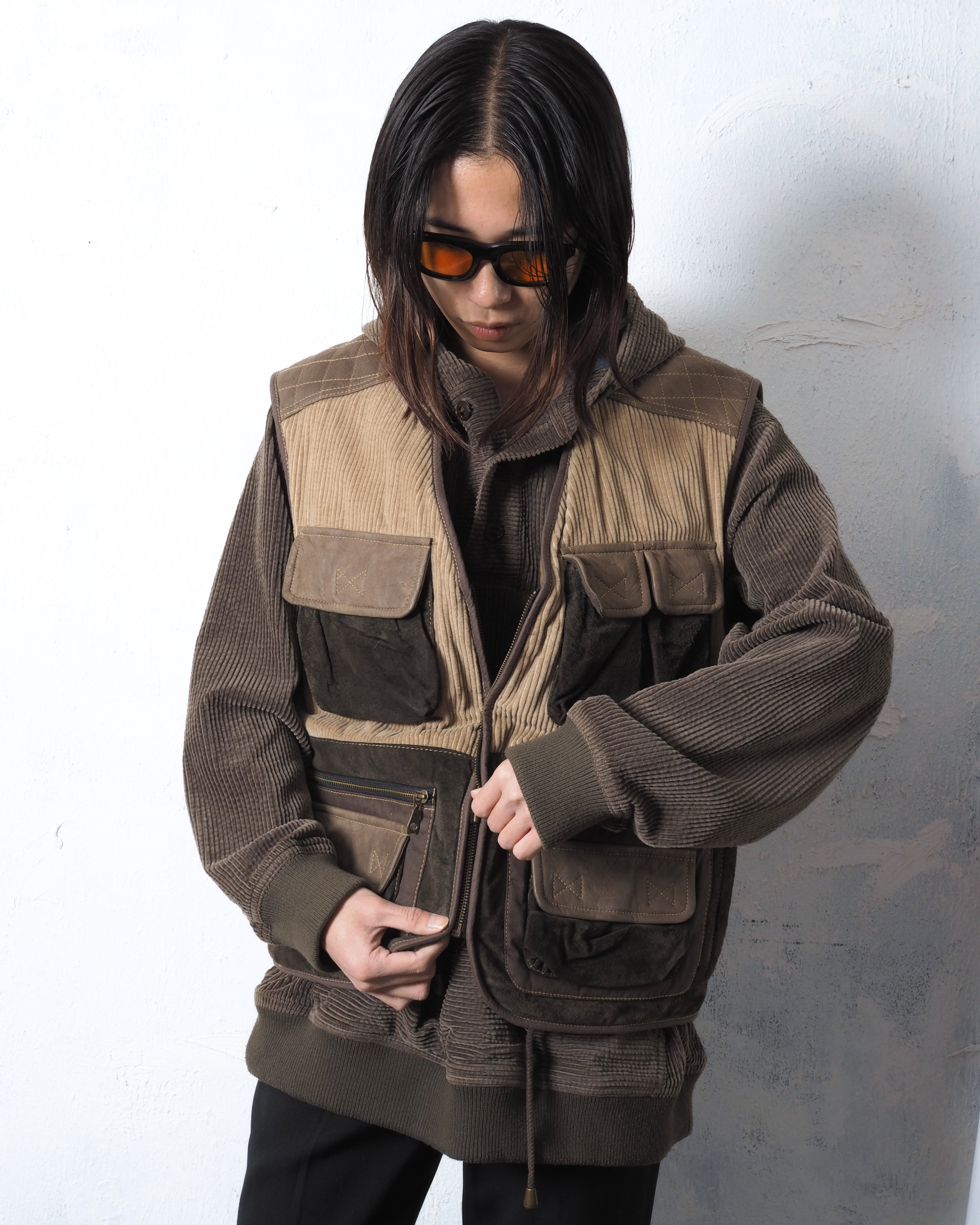 コーデュロイ、スウェード、シープレザーの贅沢な素材選びで裾にはドロストが付いたハンティングディテール