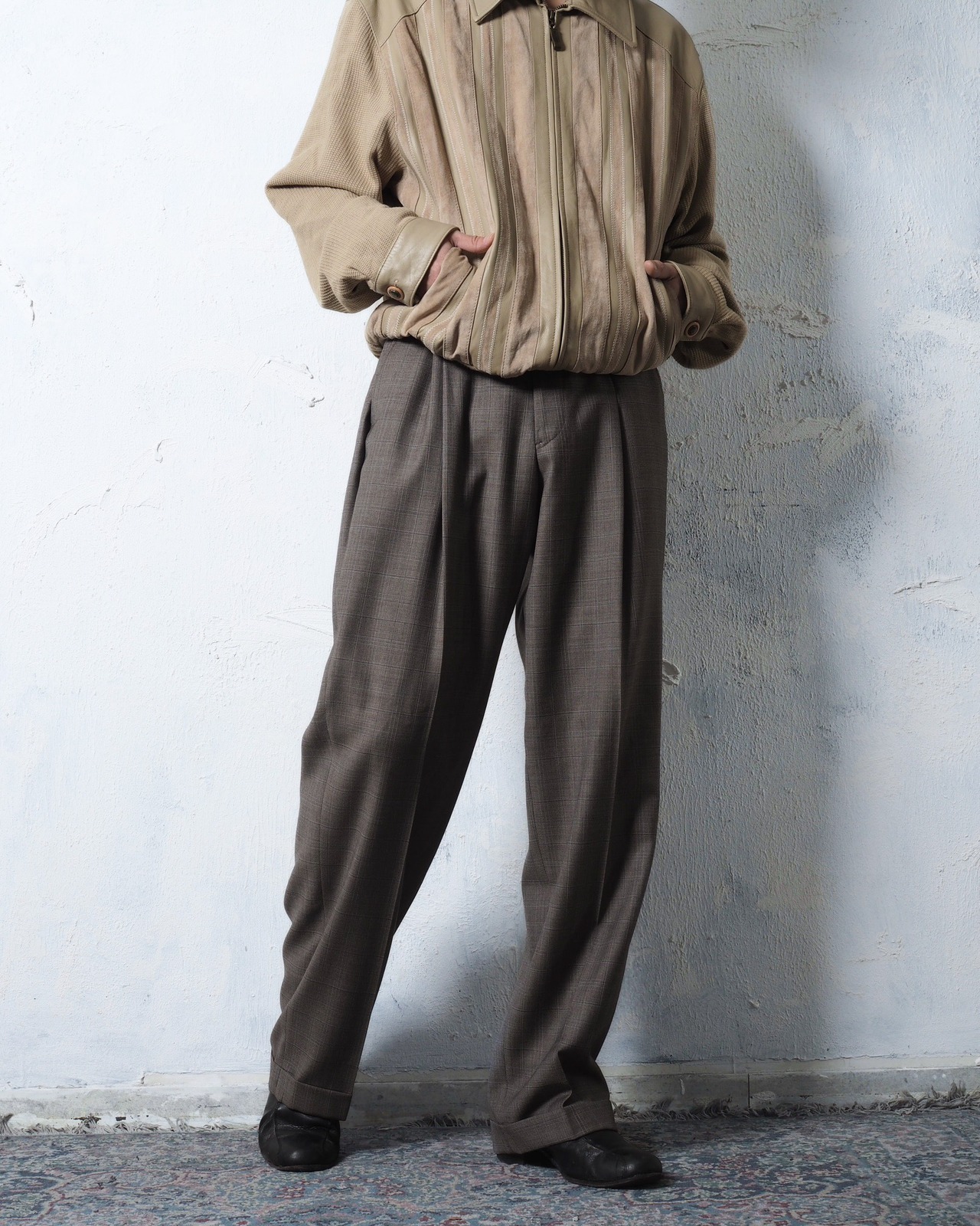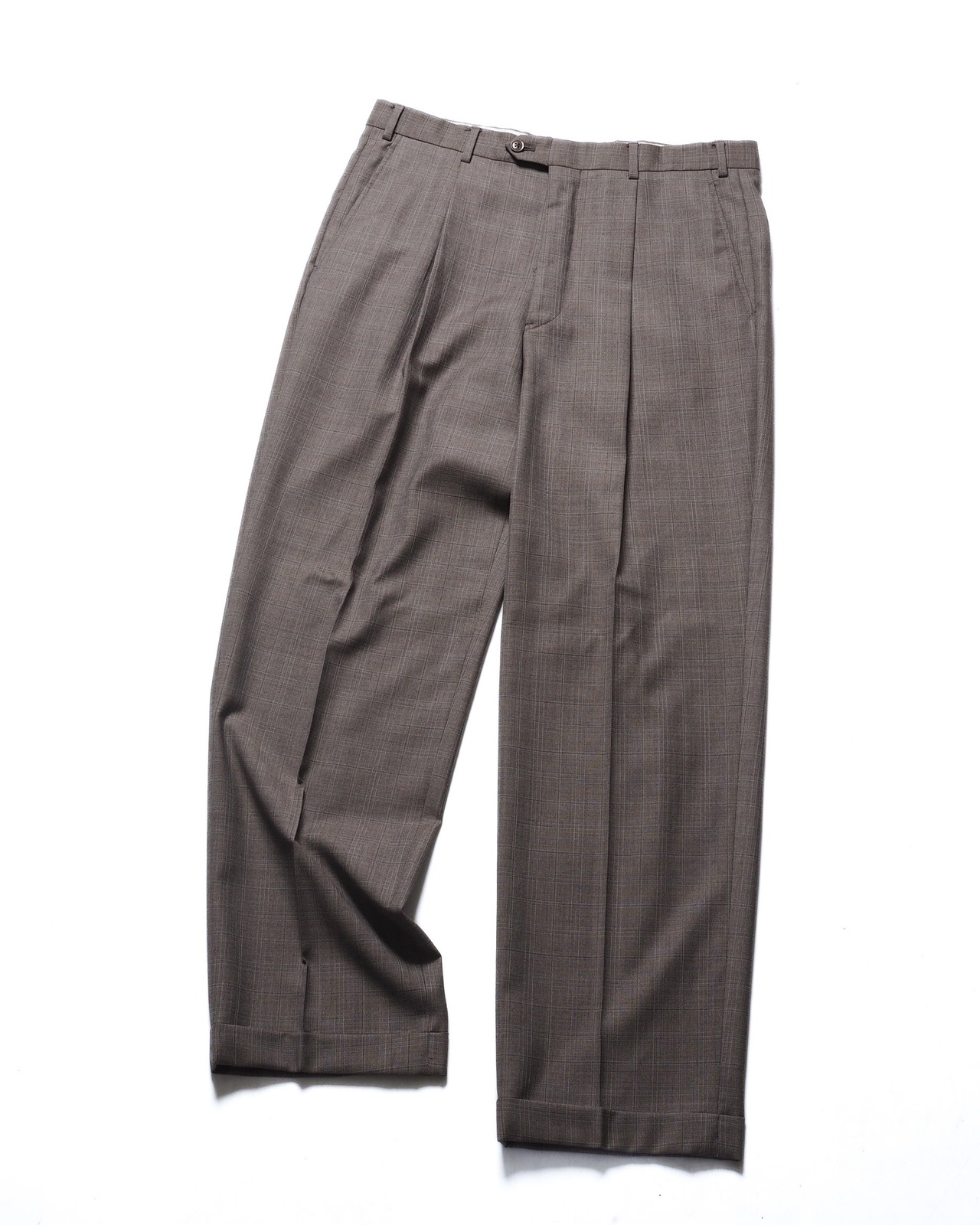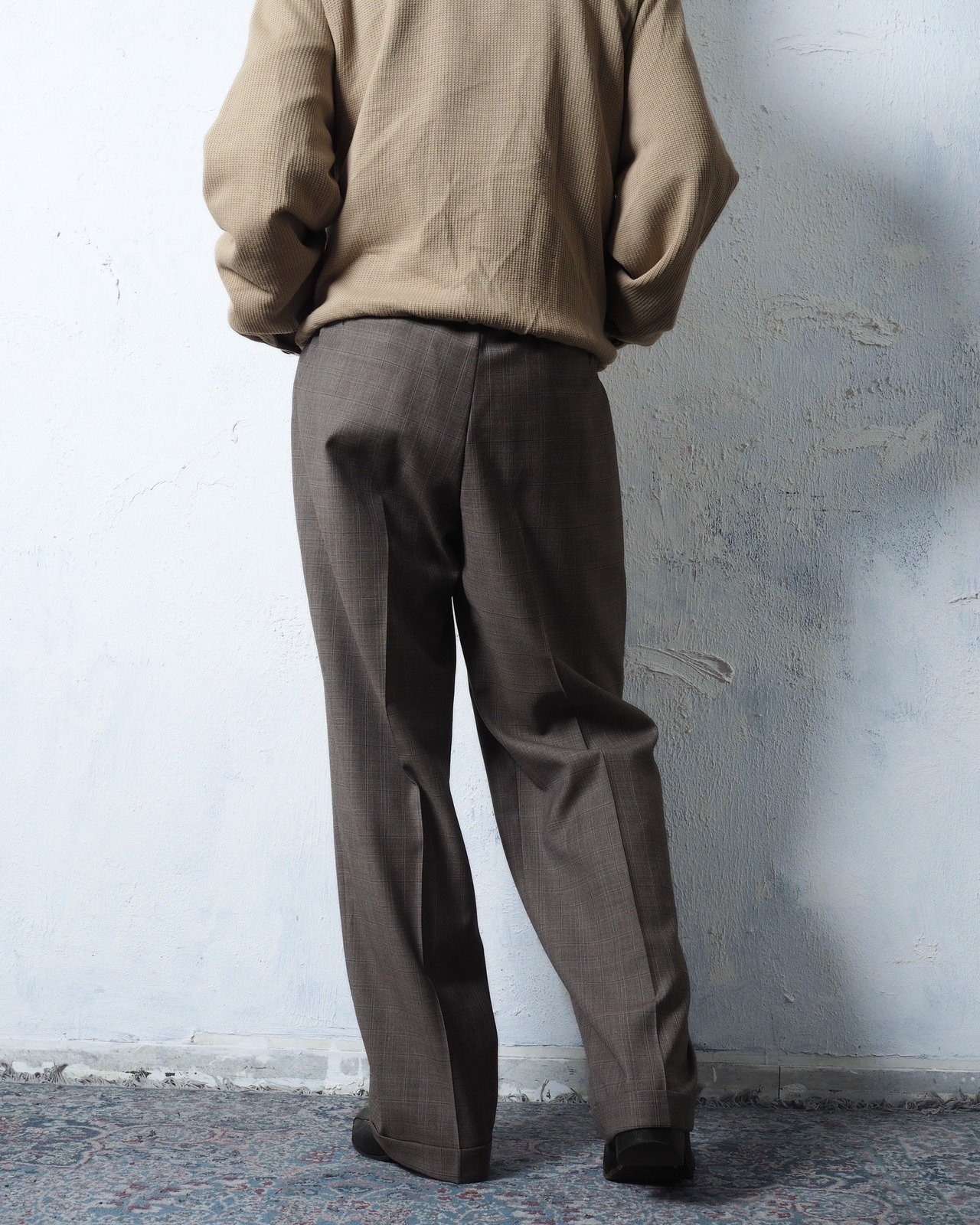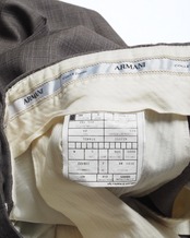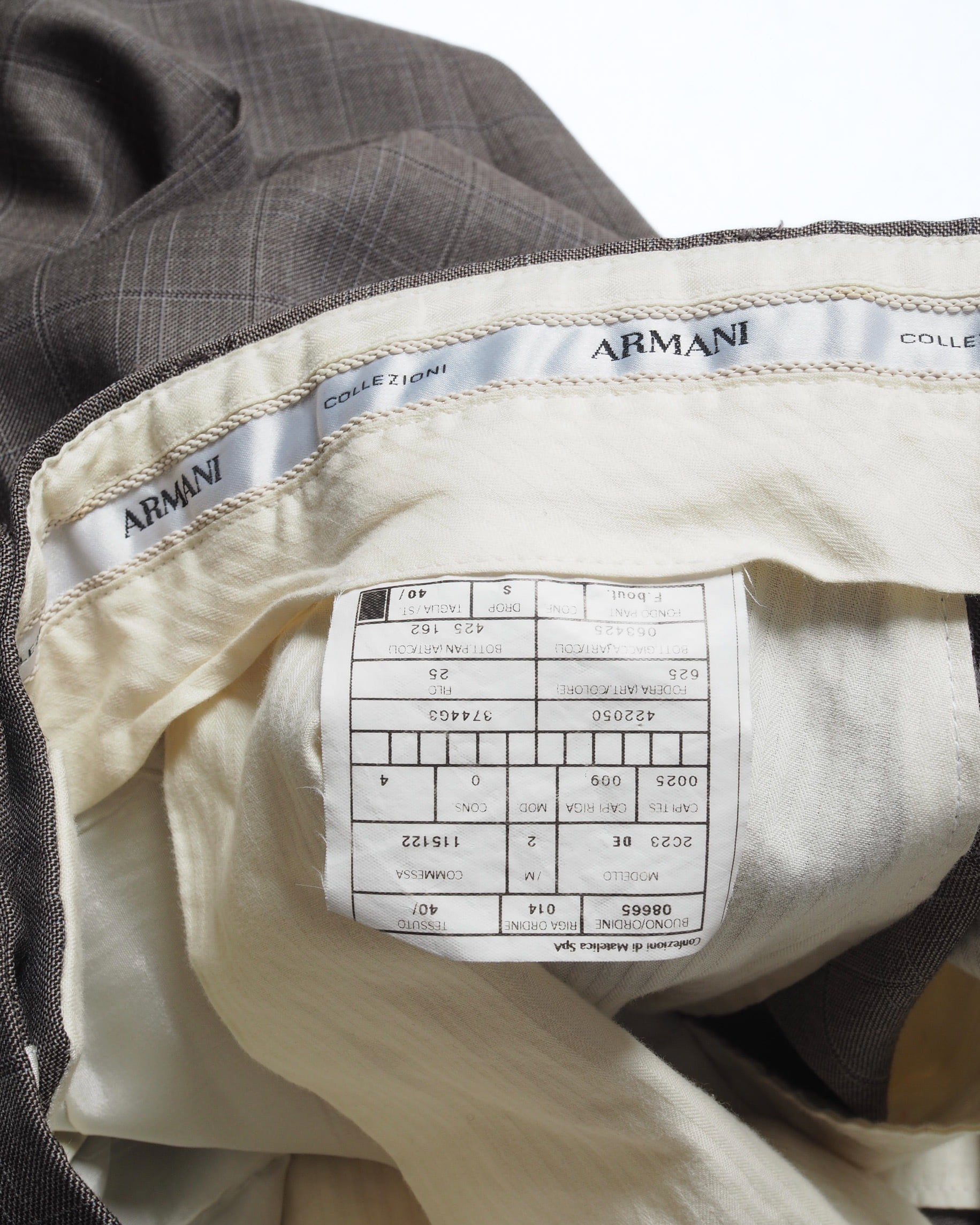 ザ・上品、グレージュのカラーに主張の激しくないチェックパターン、裾はダブルでブランドはアルマーニ