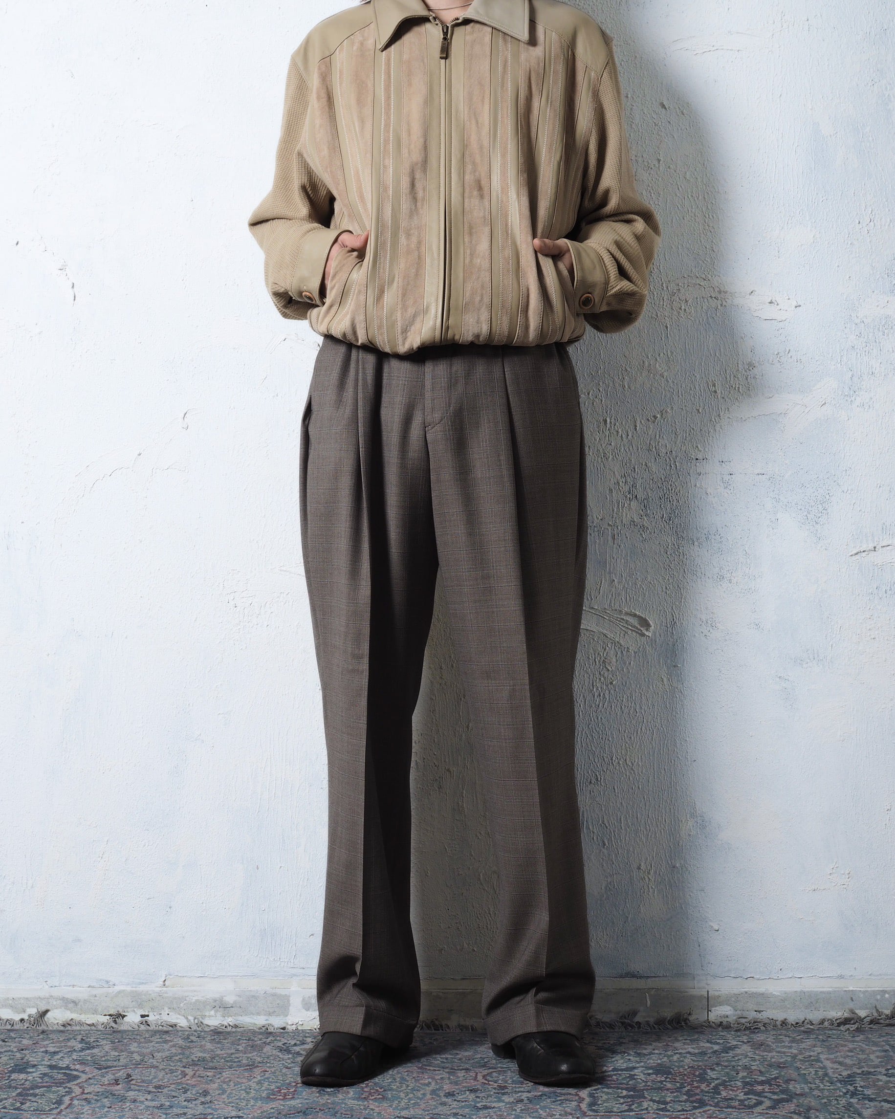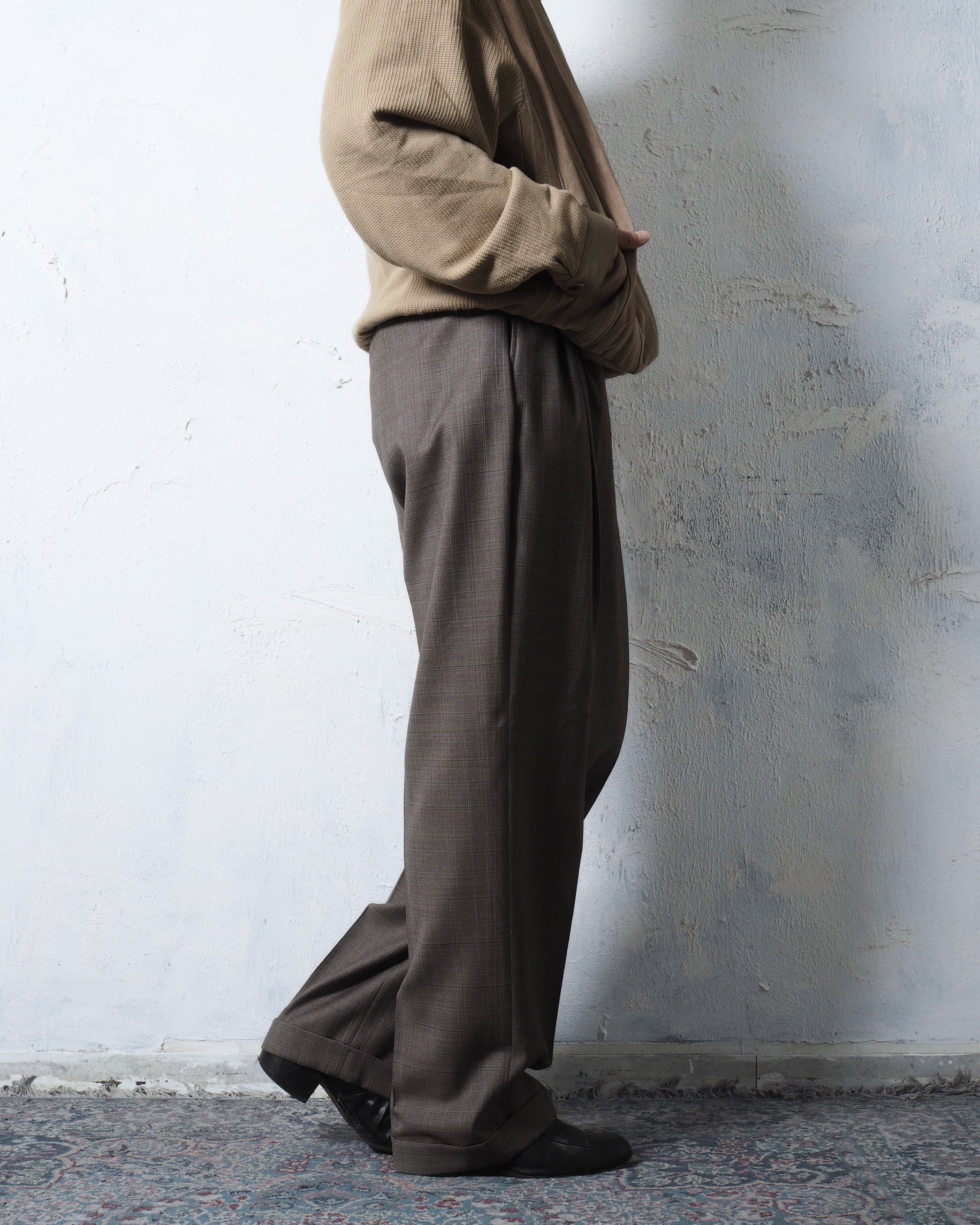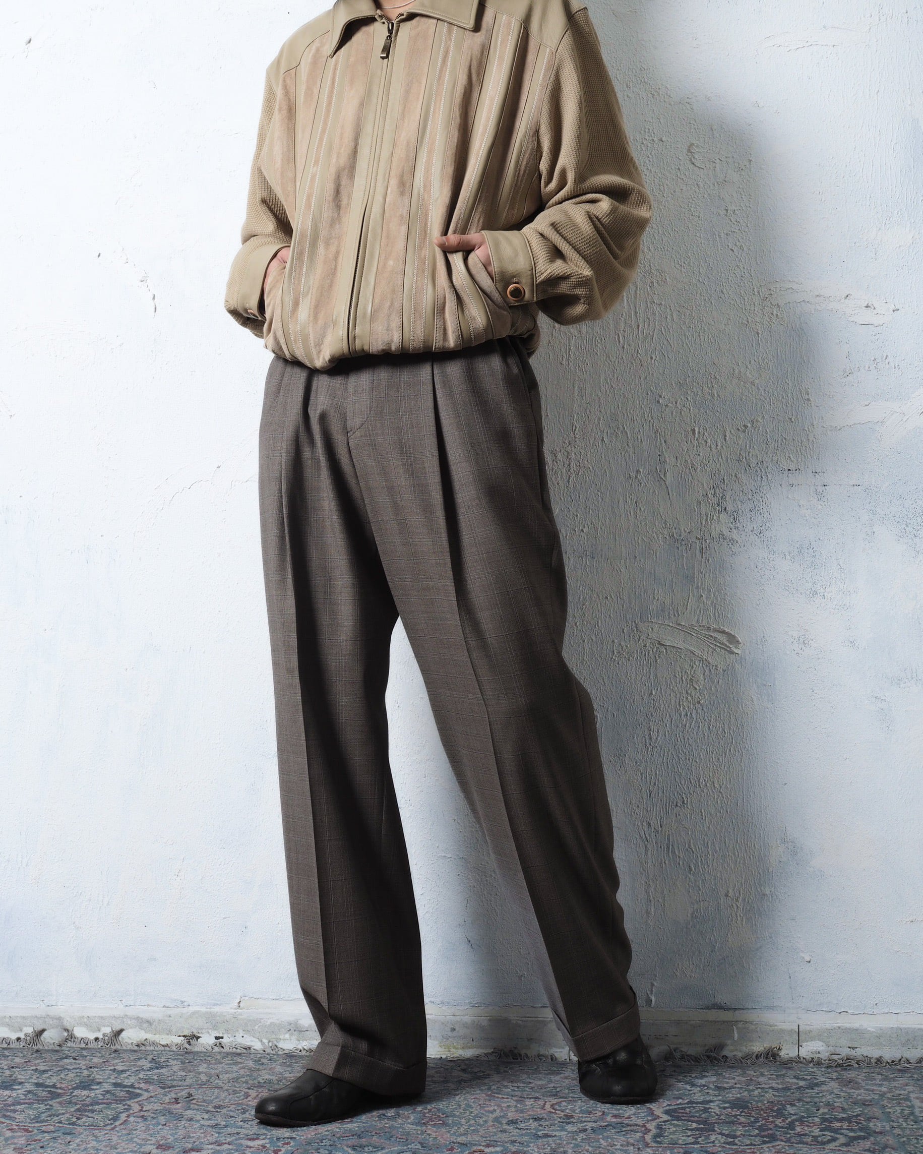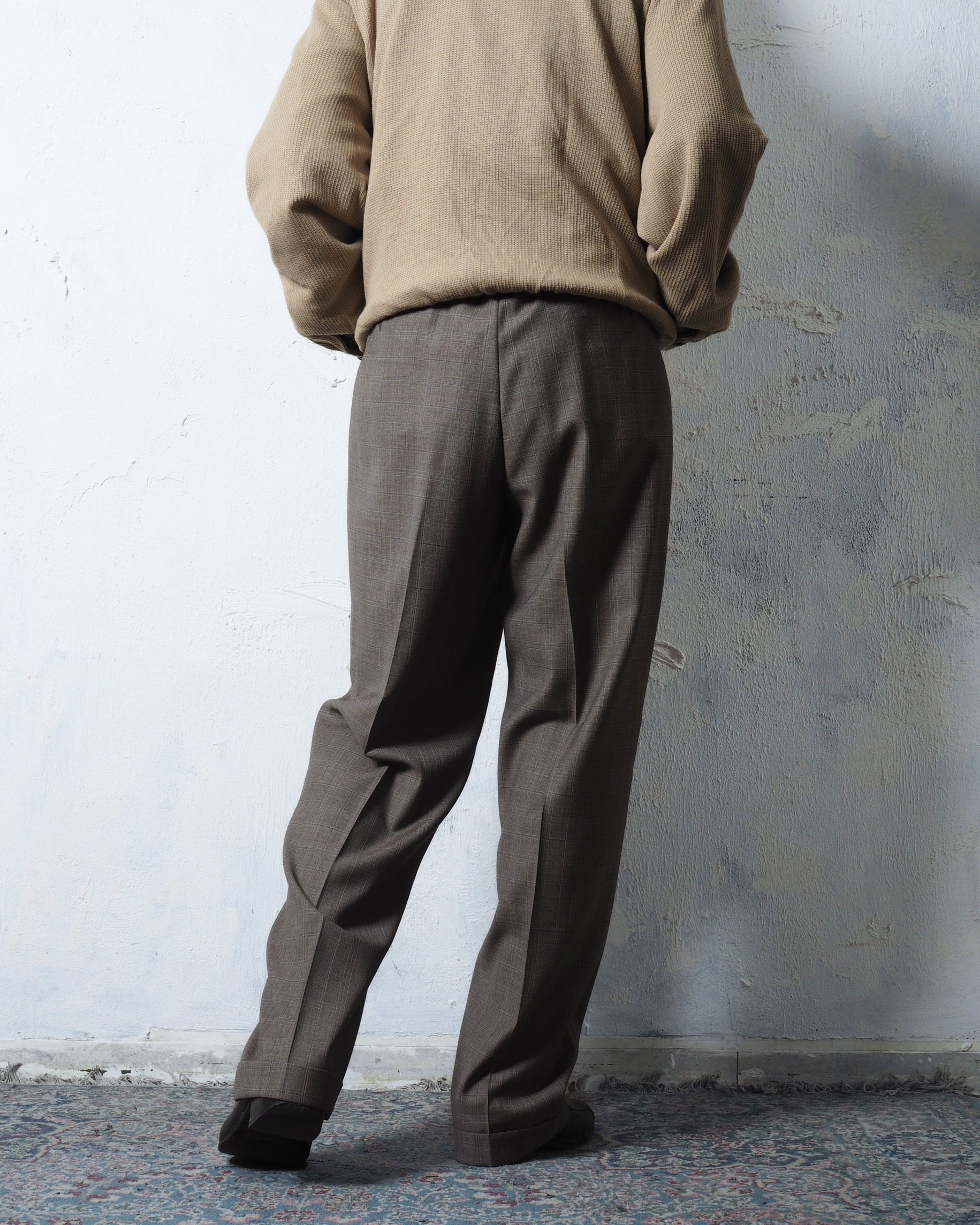 ザ・上品、グレージュのカラーに主張の激しくないチェックパターン、裾はダブルでブランドはアルマーニ