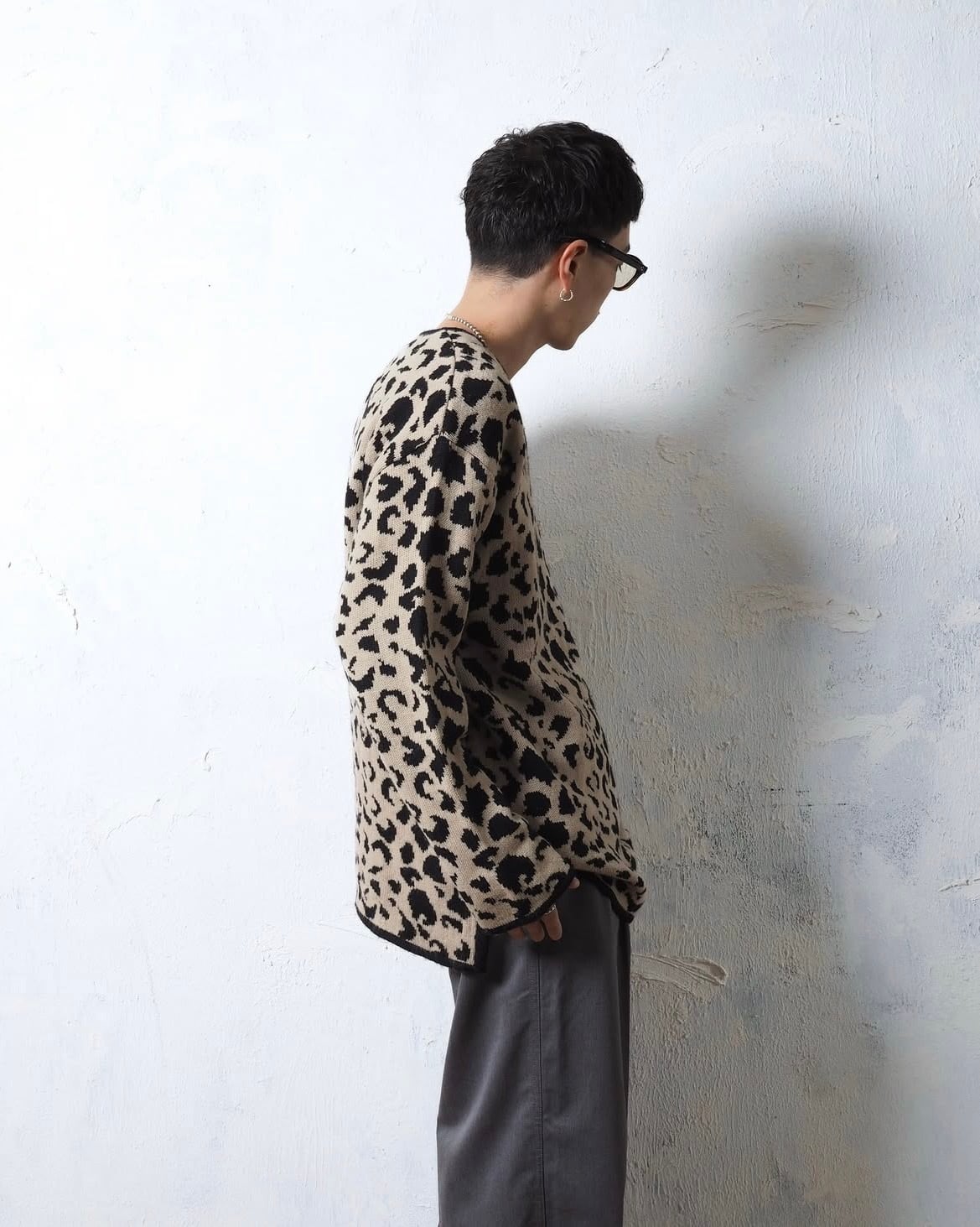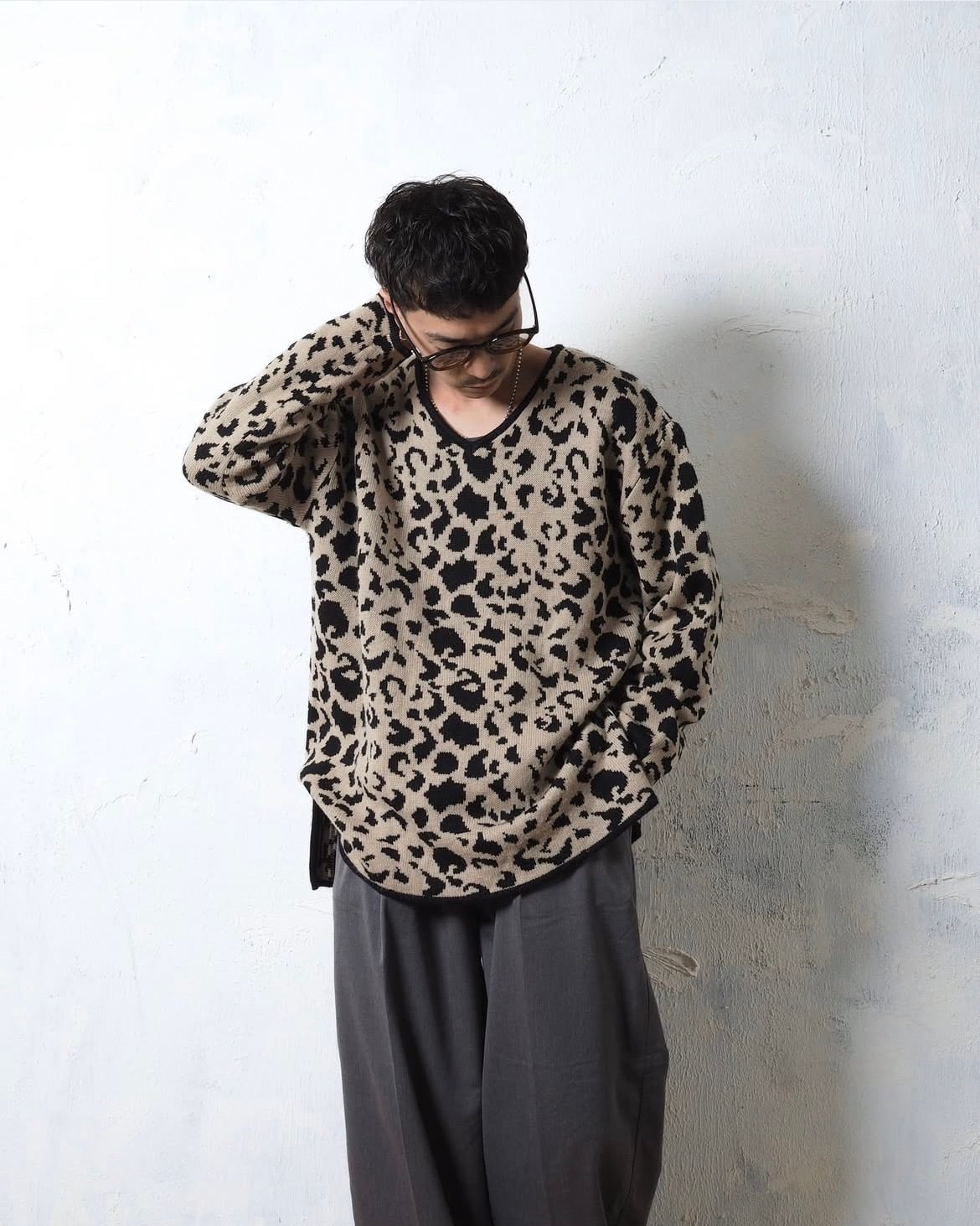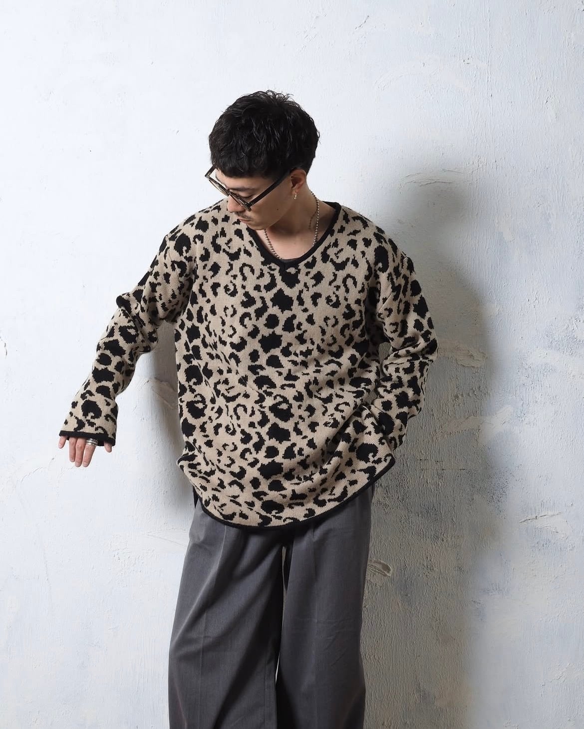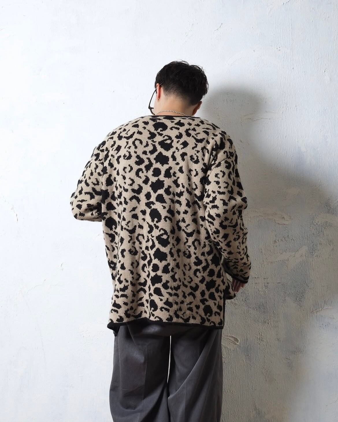 レディースXL、メンズが着たらドンピシャなサイズ感で、開きすぎてないネックやレオパードパターンもバランスが良い一着です