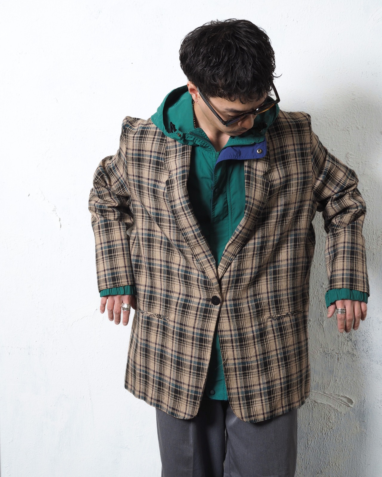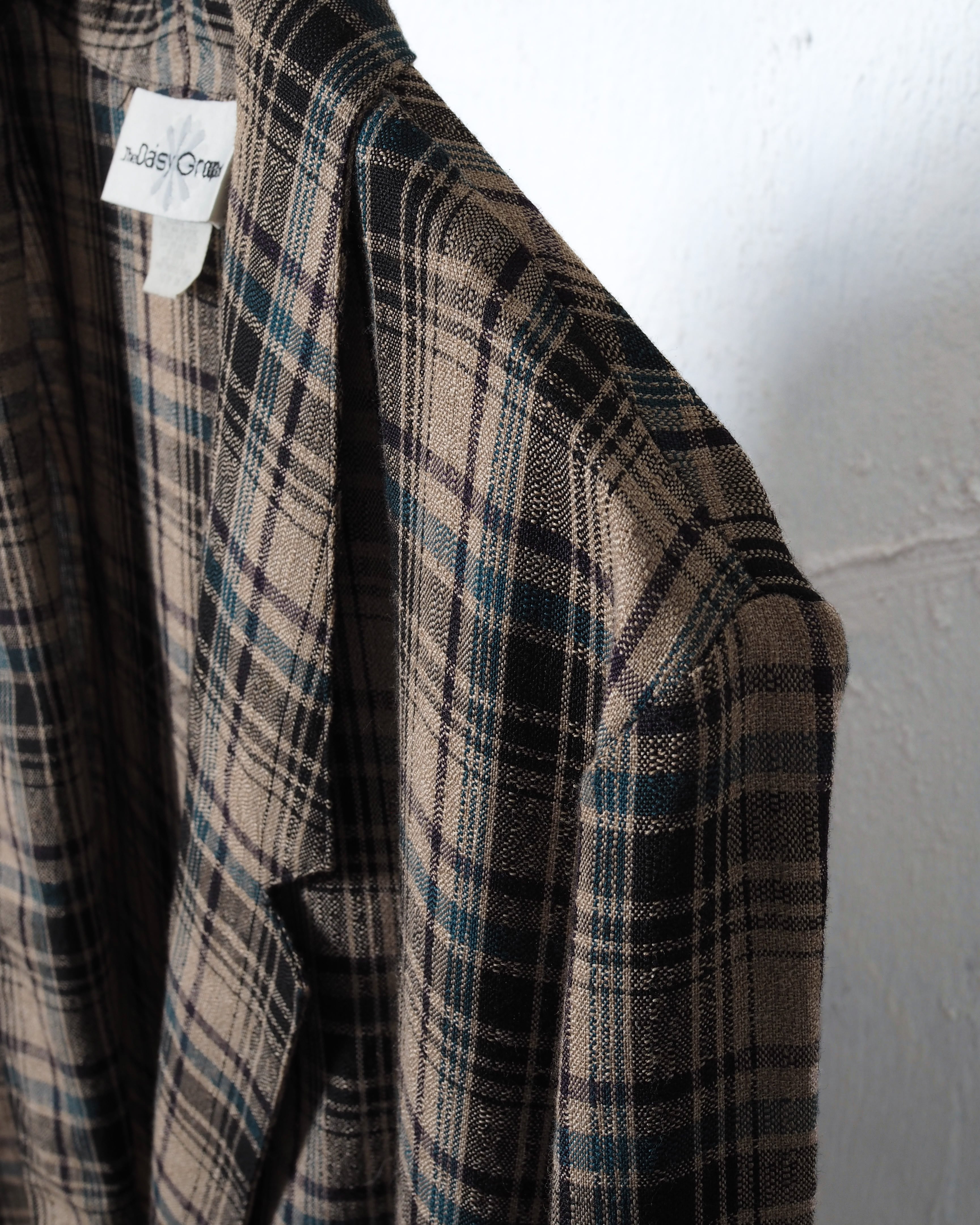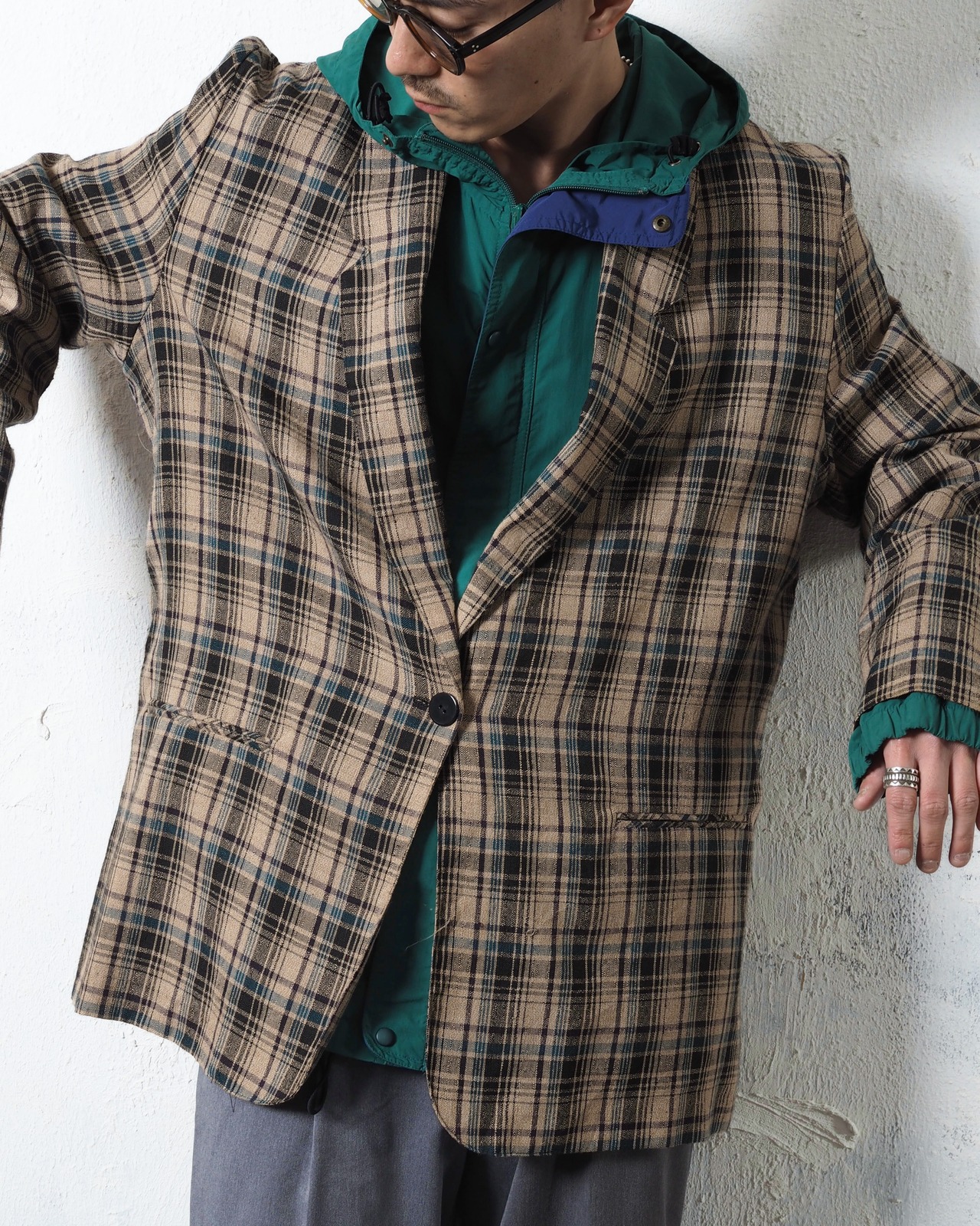 チャコールとベージュ、そこにブルーの刺しチェックが入りバランスの取れた一着