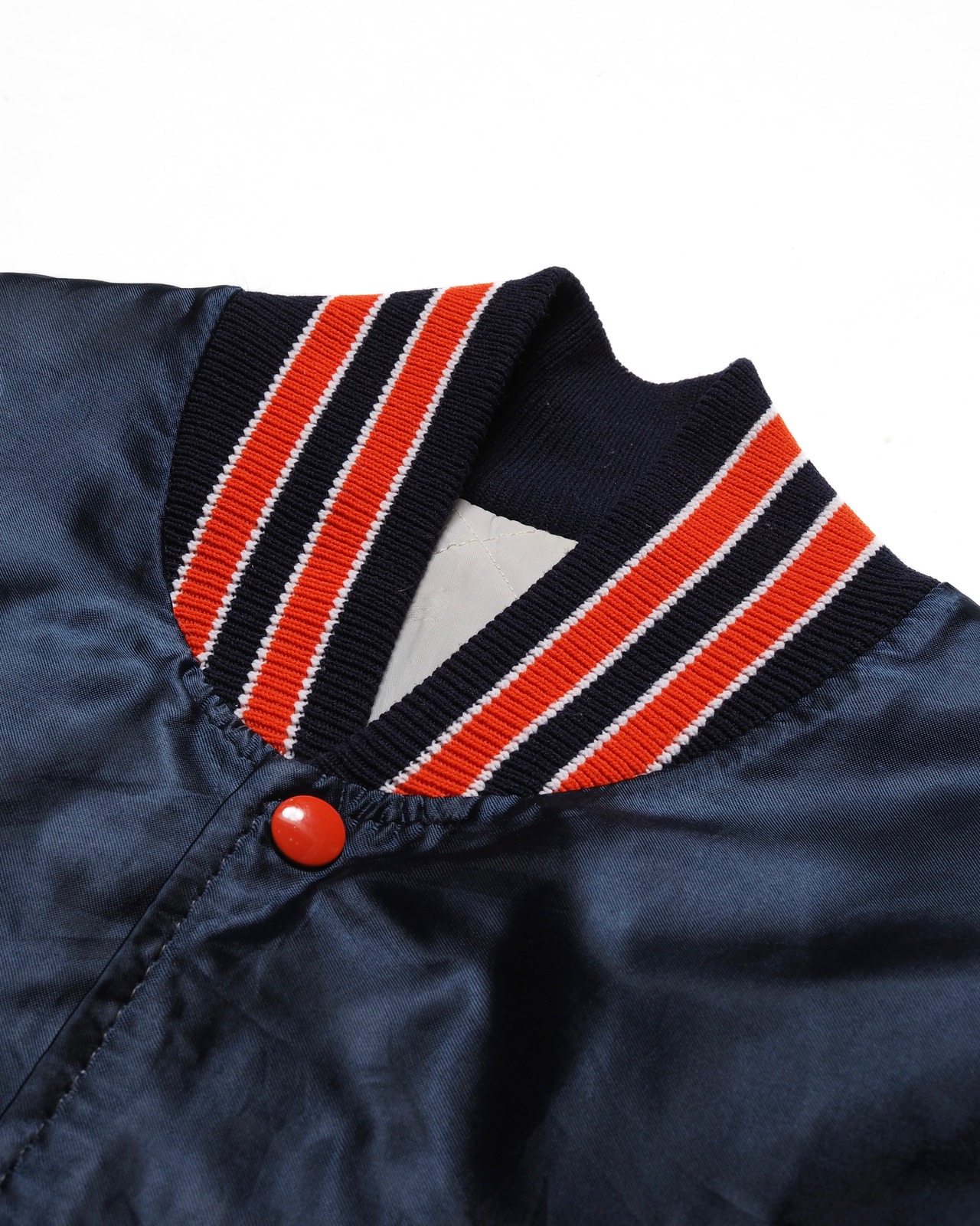 スナップボタン、リブ、刺繍はオレンジに統一され、ネイビーのボディ雰囲気と相まって◎