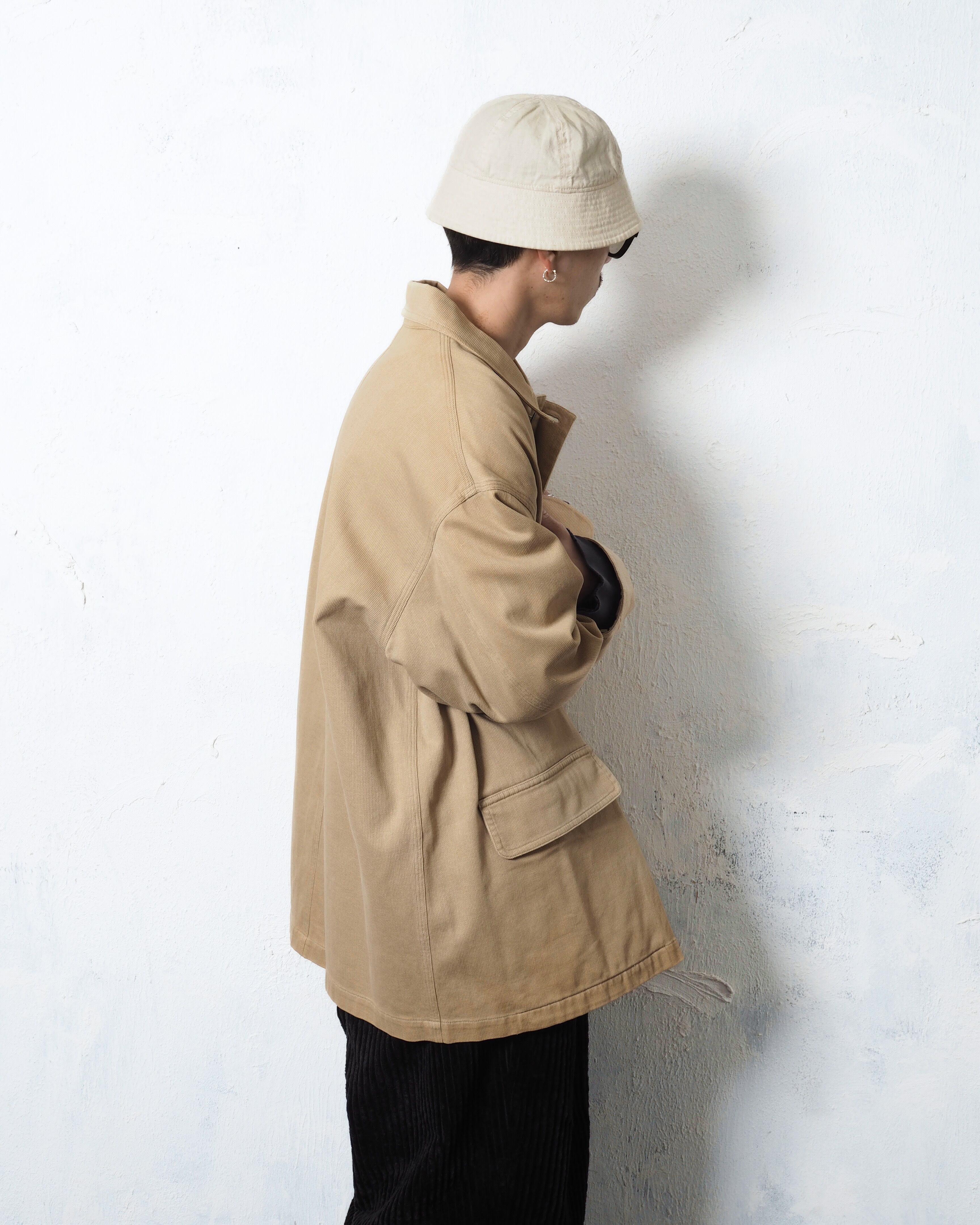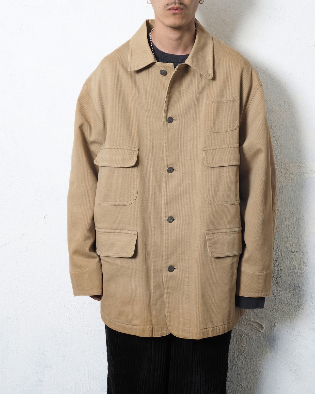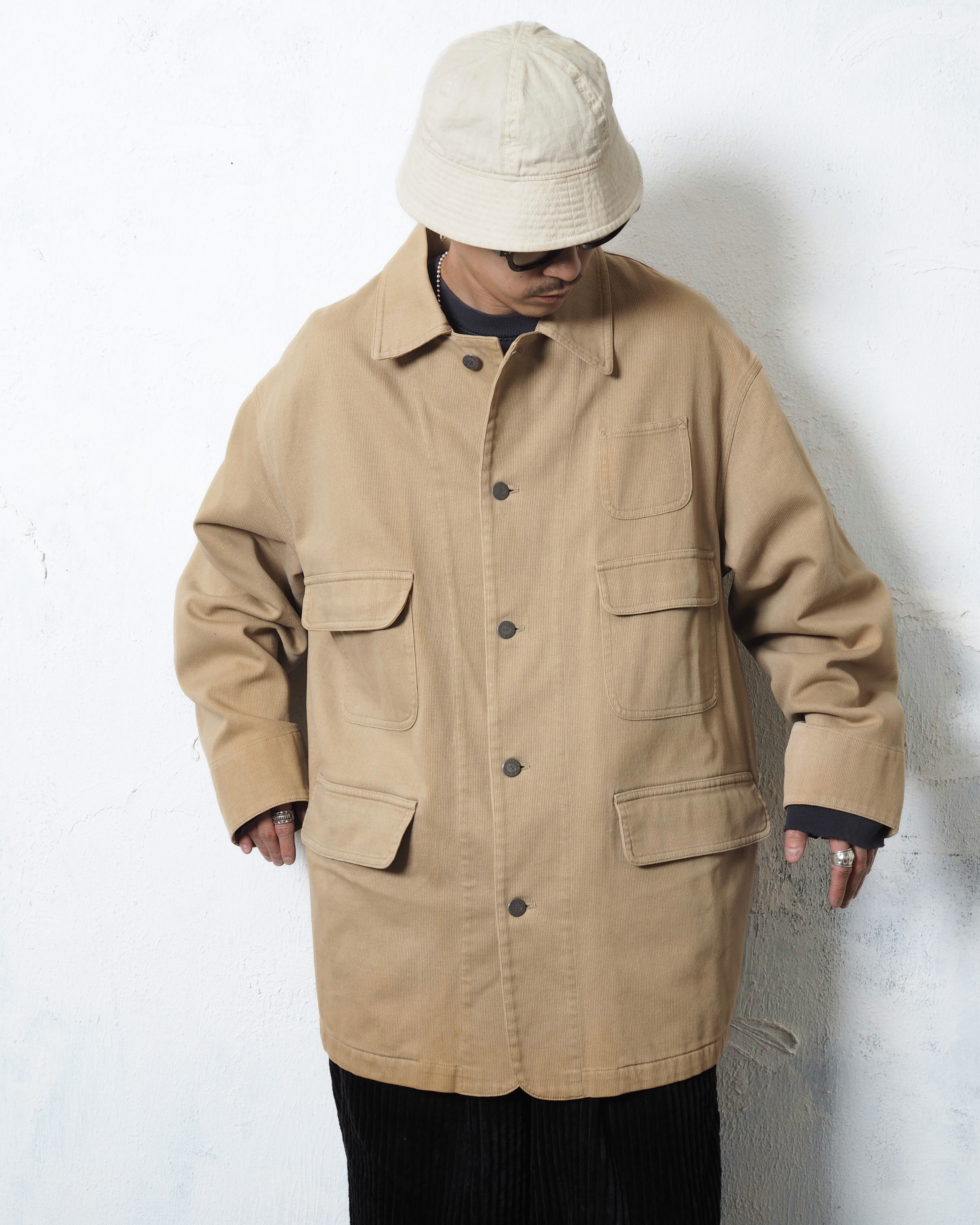 ピカ素材のベージュカバーオールで、フィールドジャケットを模した4ポケ