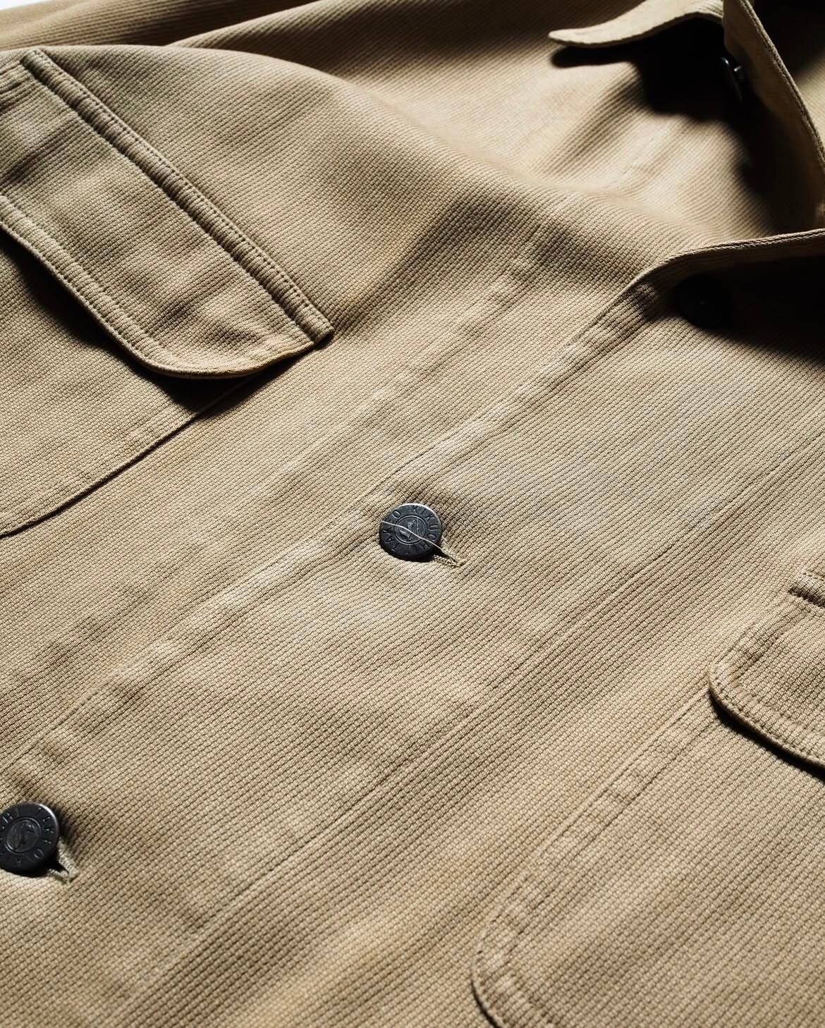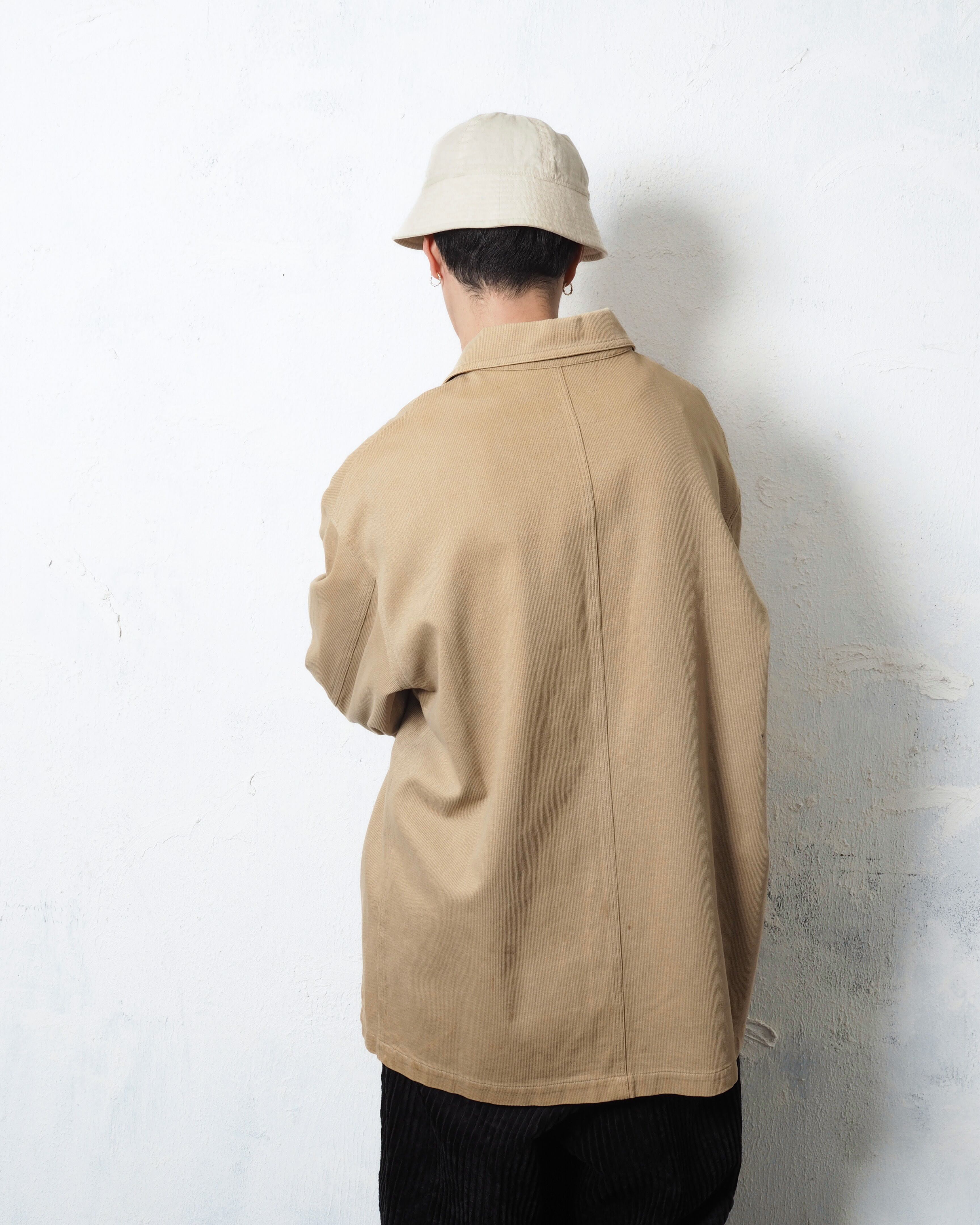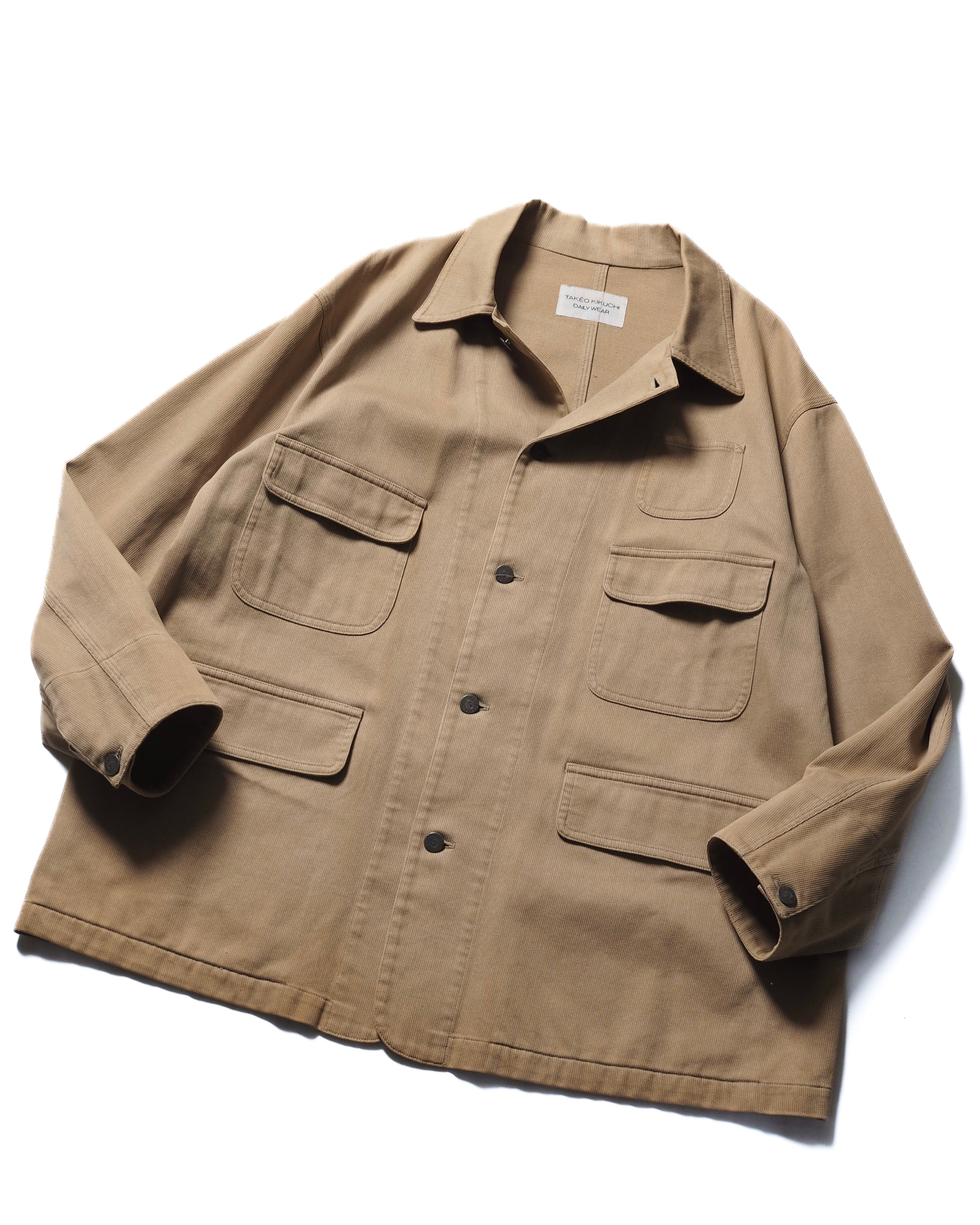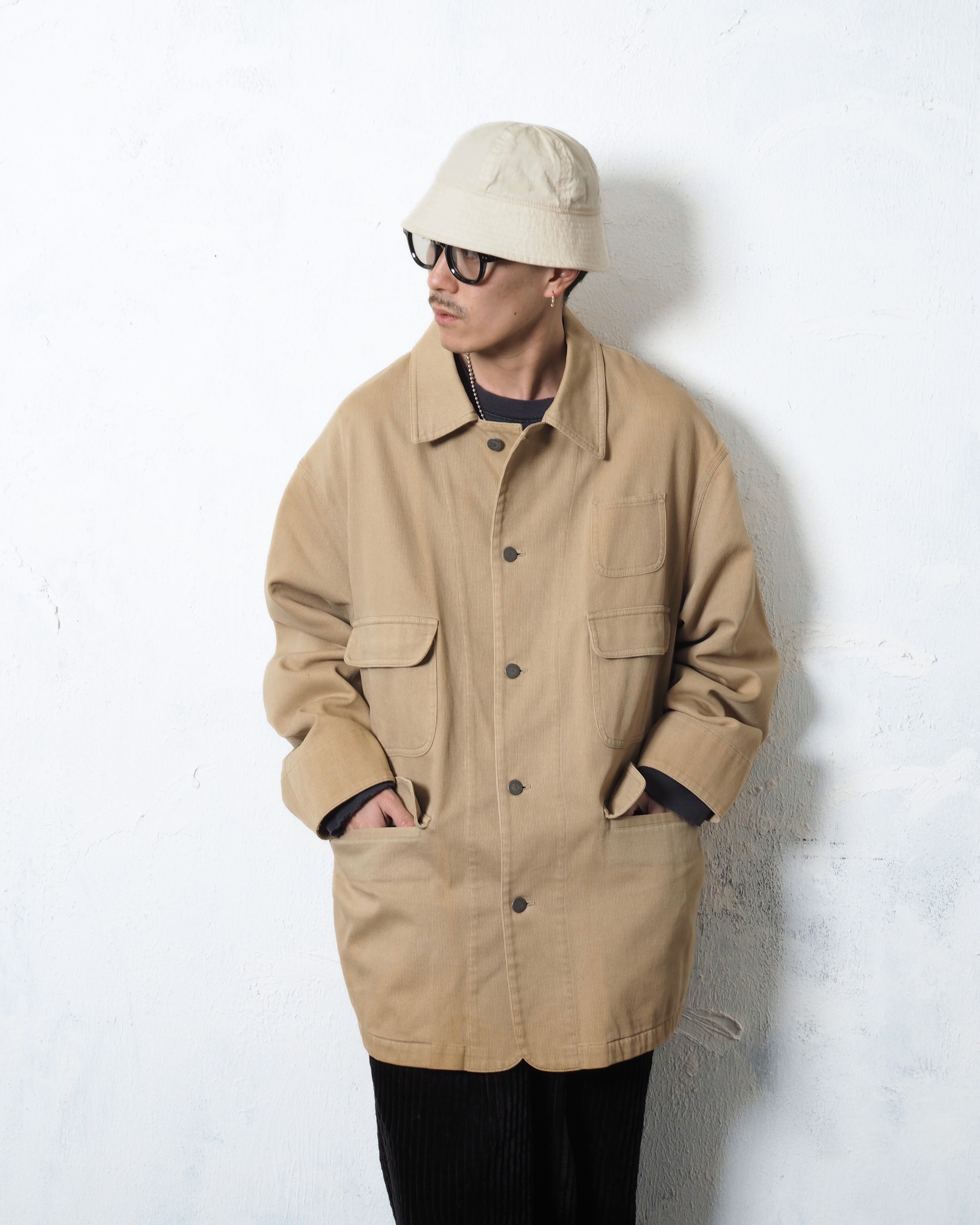 ピカ素材のベージュカバーオールで、フィールドジャケットを模した4ポケ