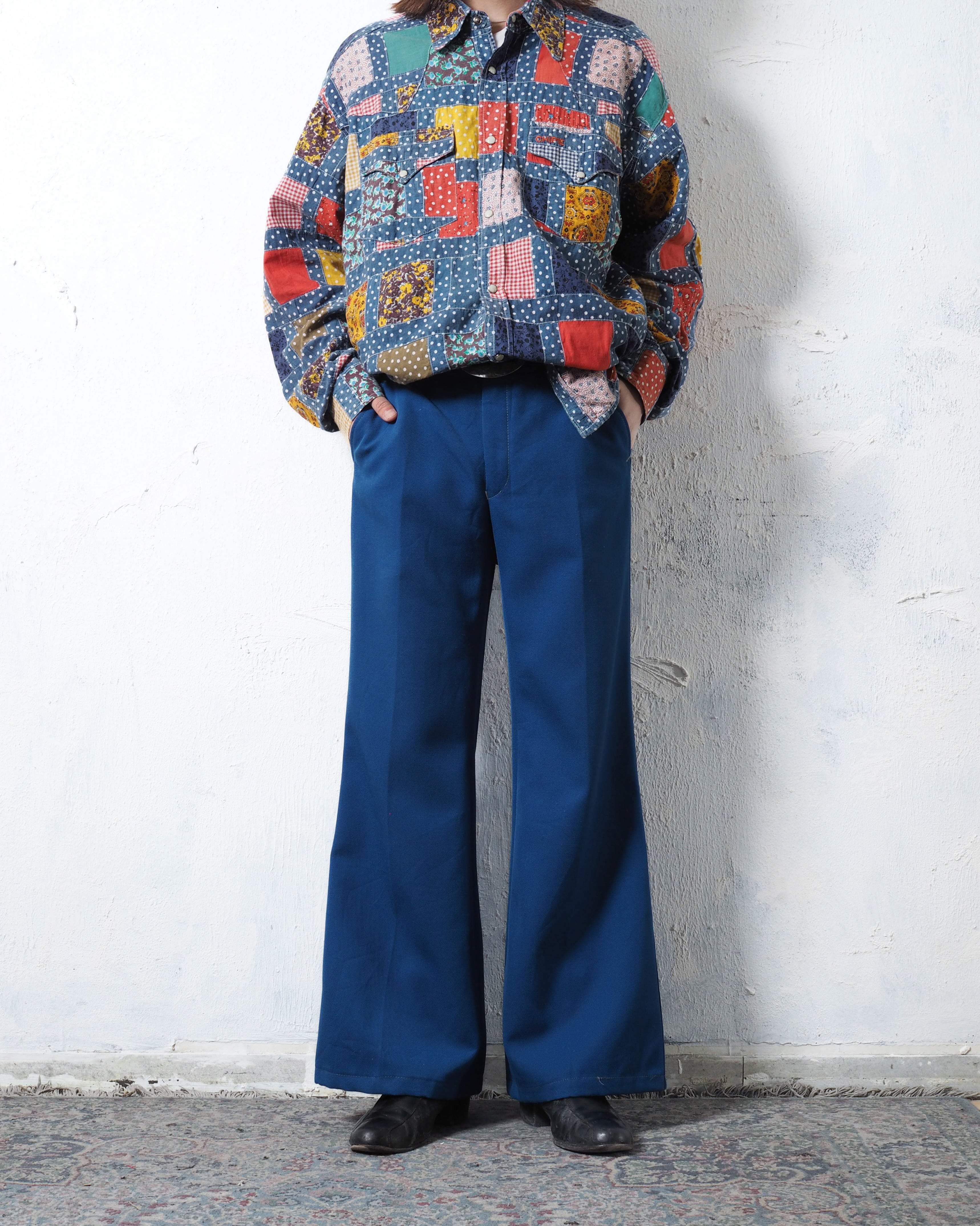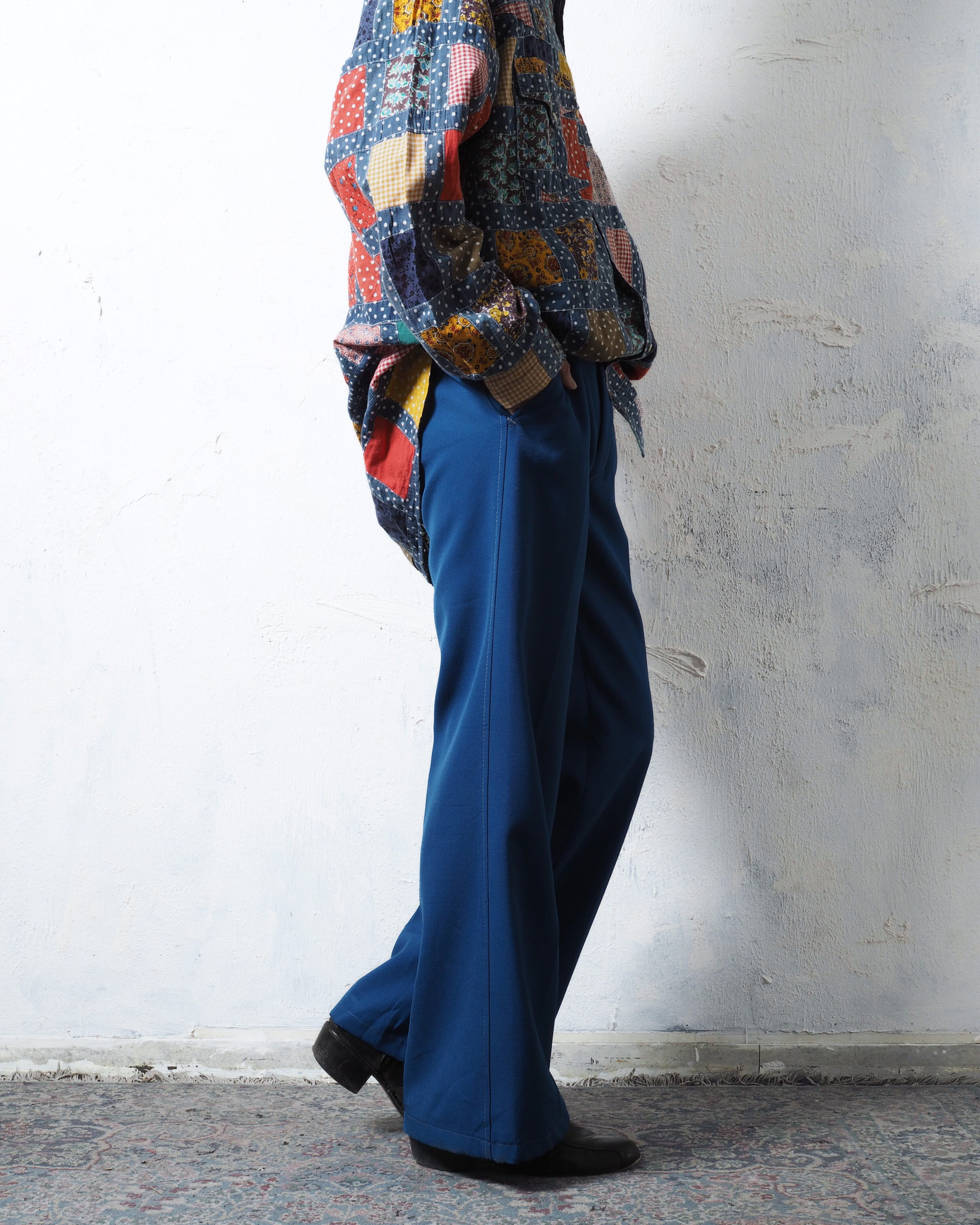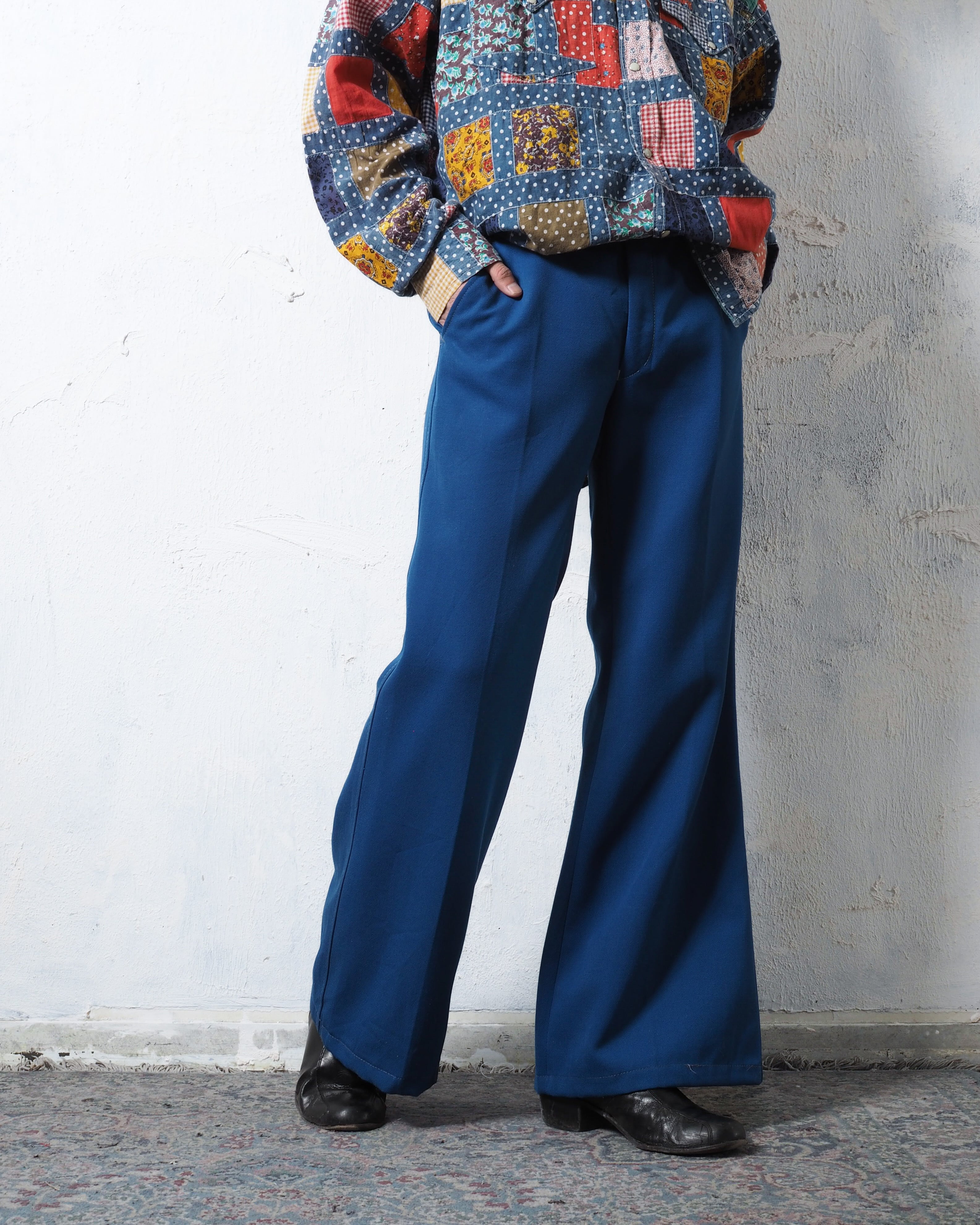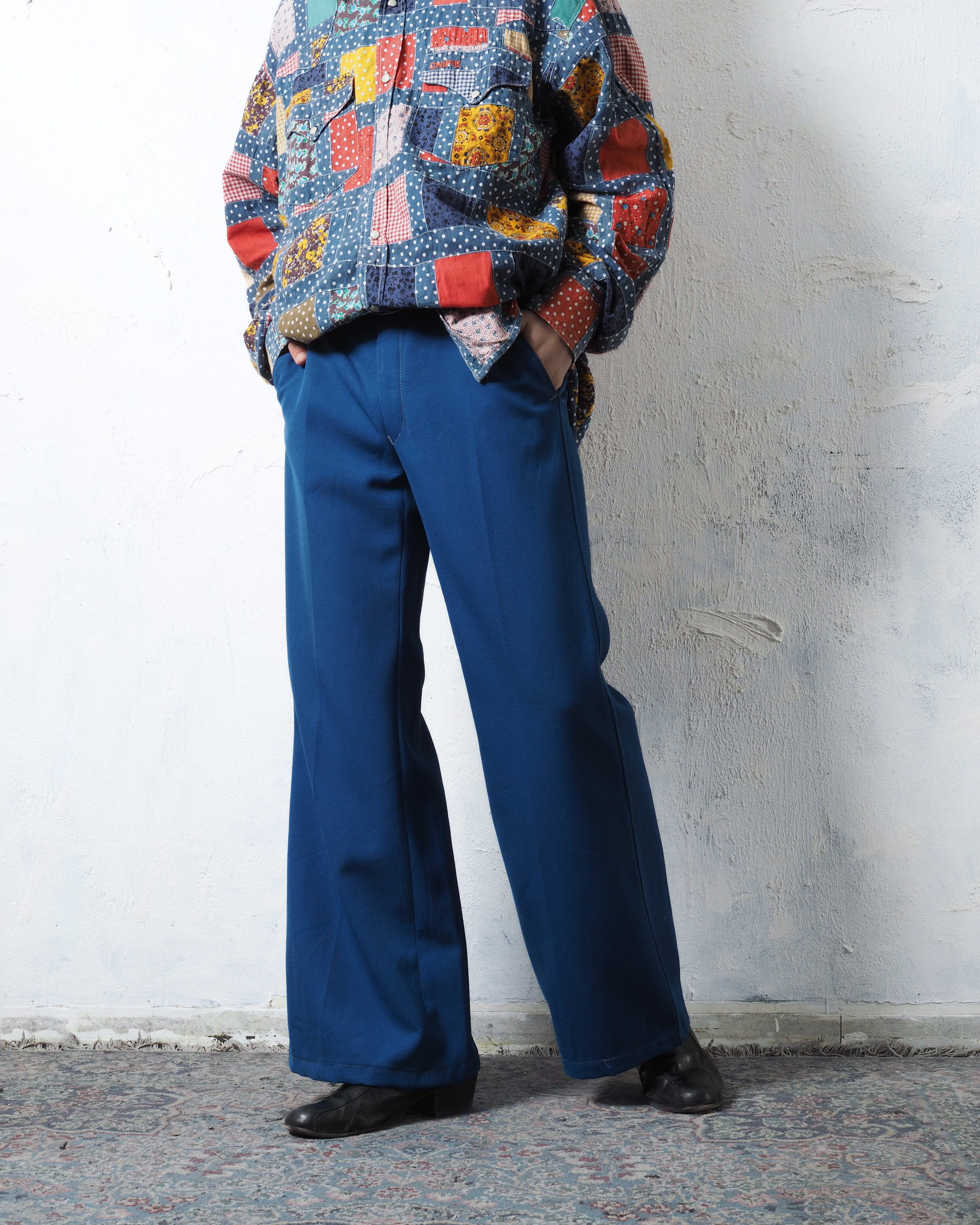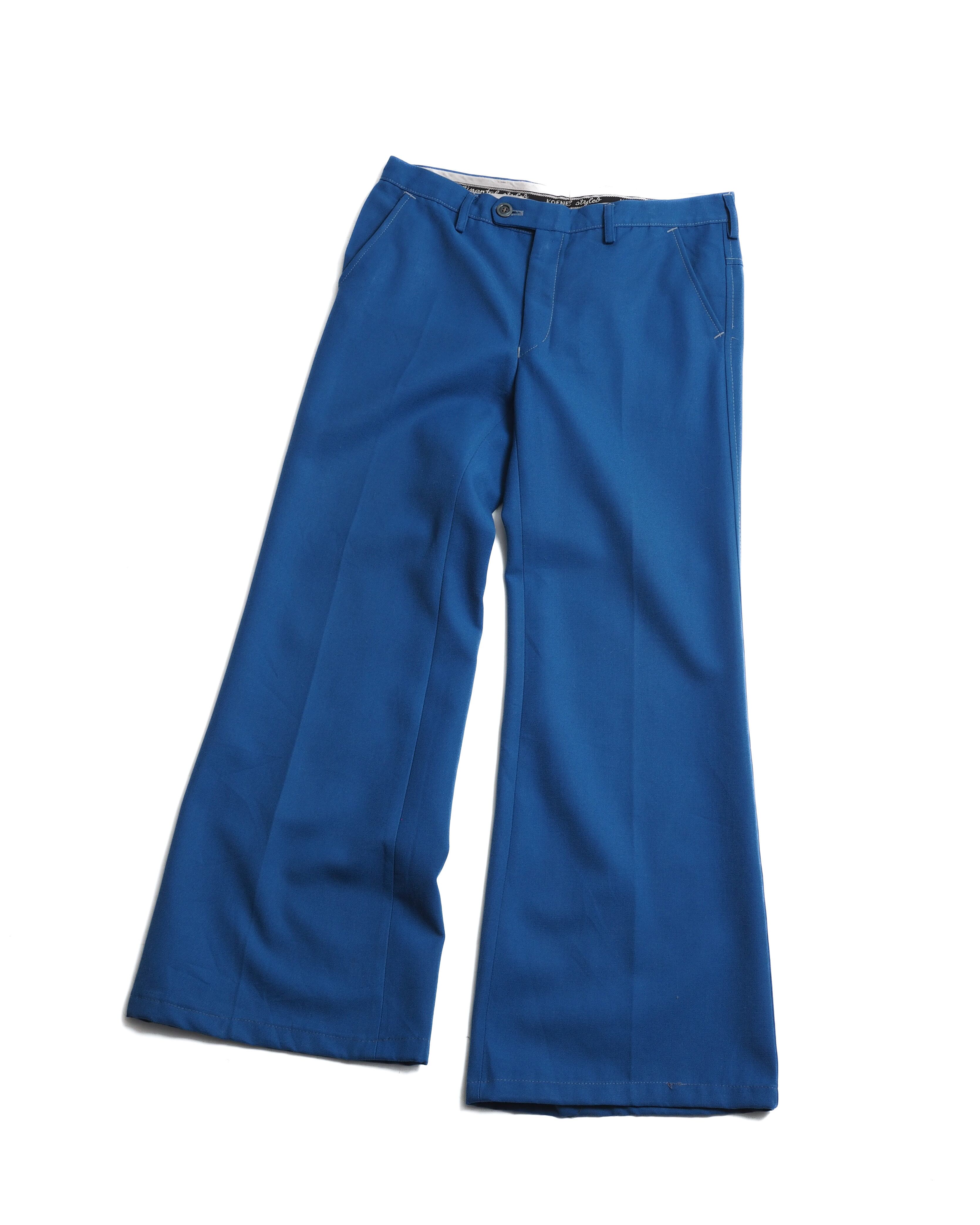鮮やかな青ボディに白ステッチが魅力的な仕立て屋系のフレアパンツ