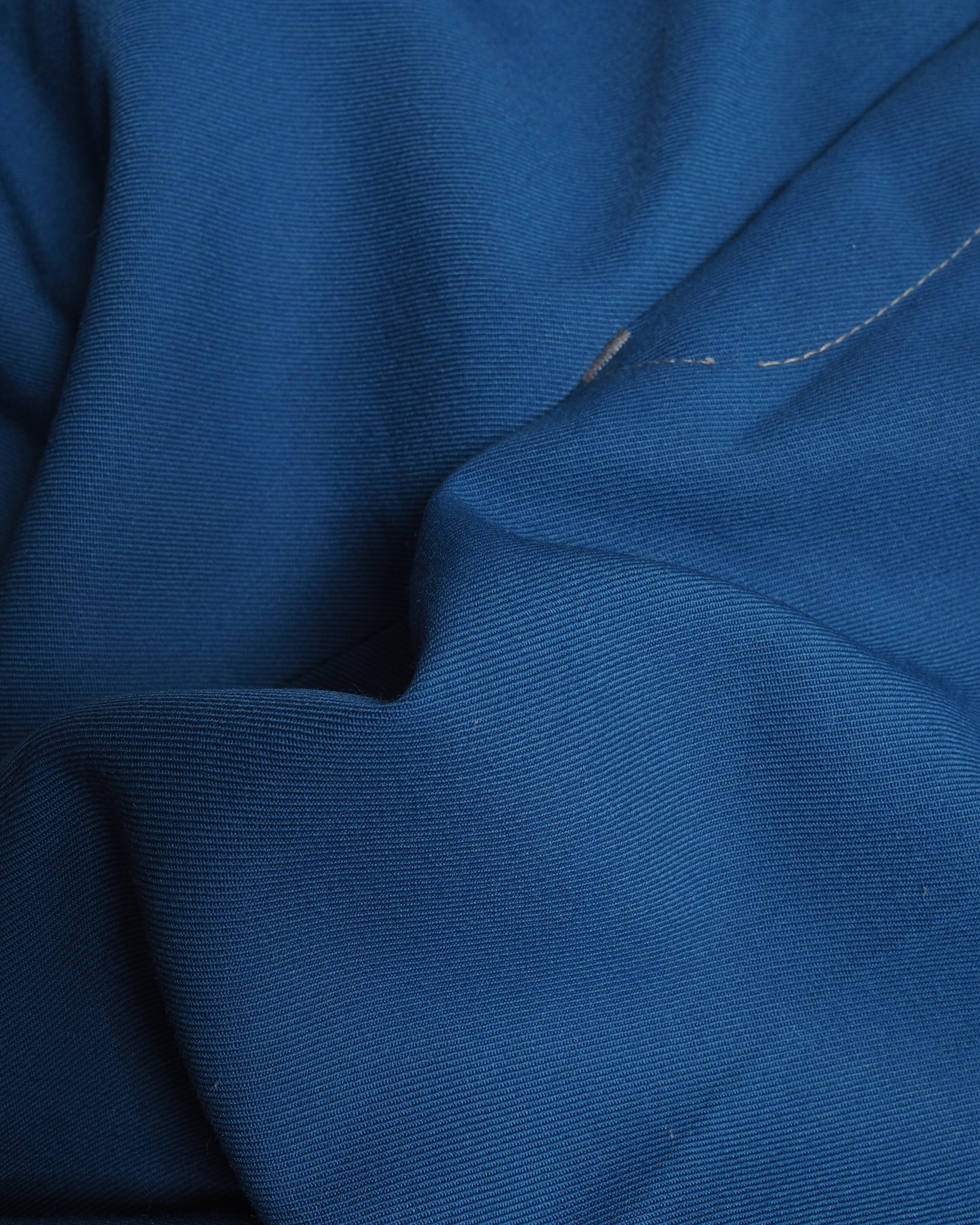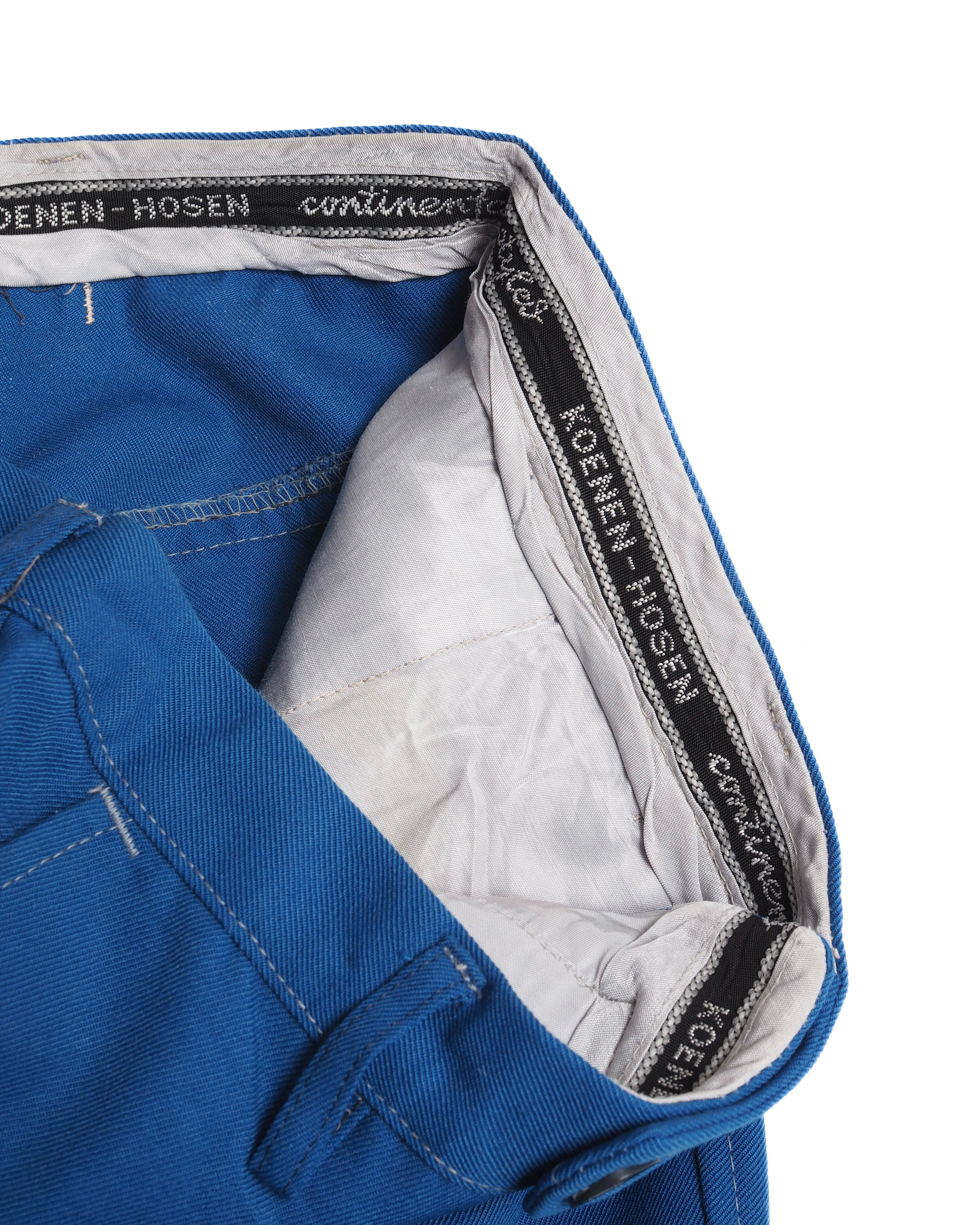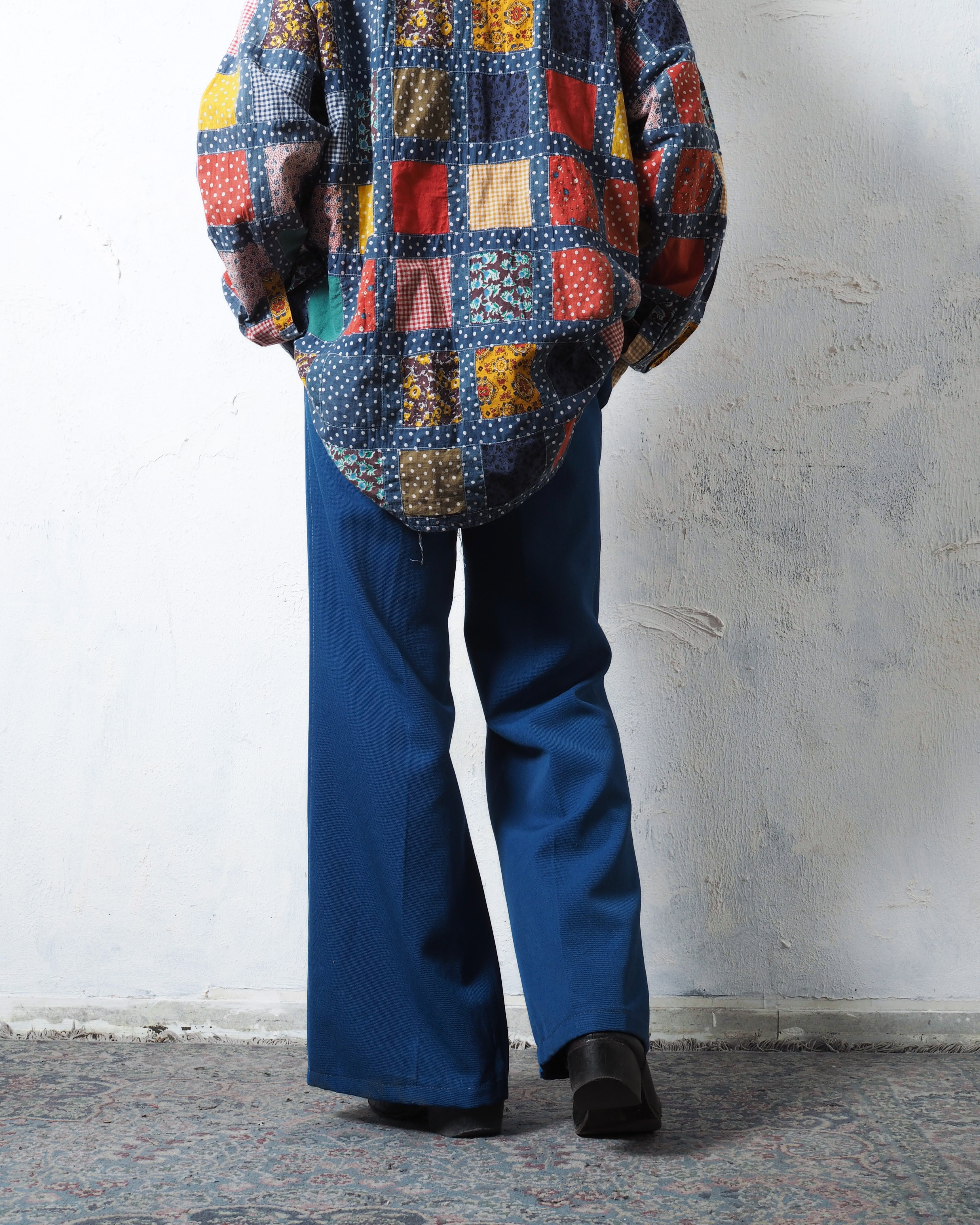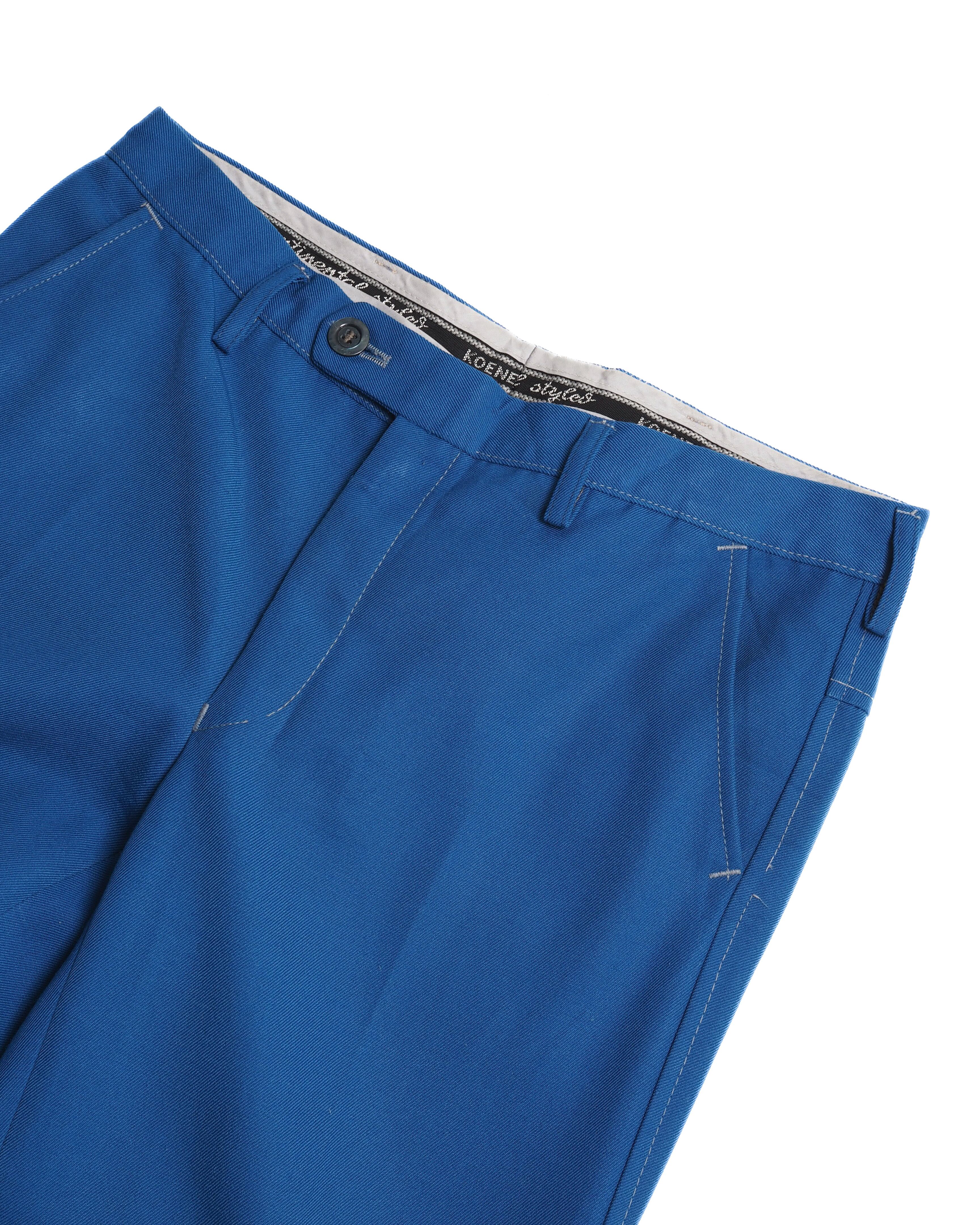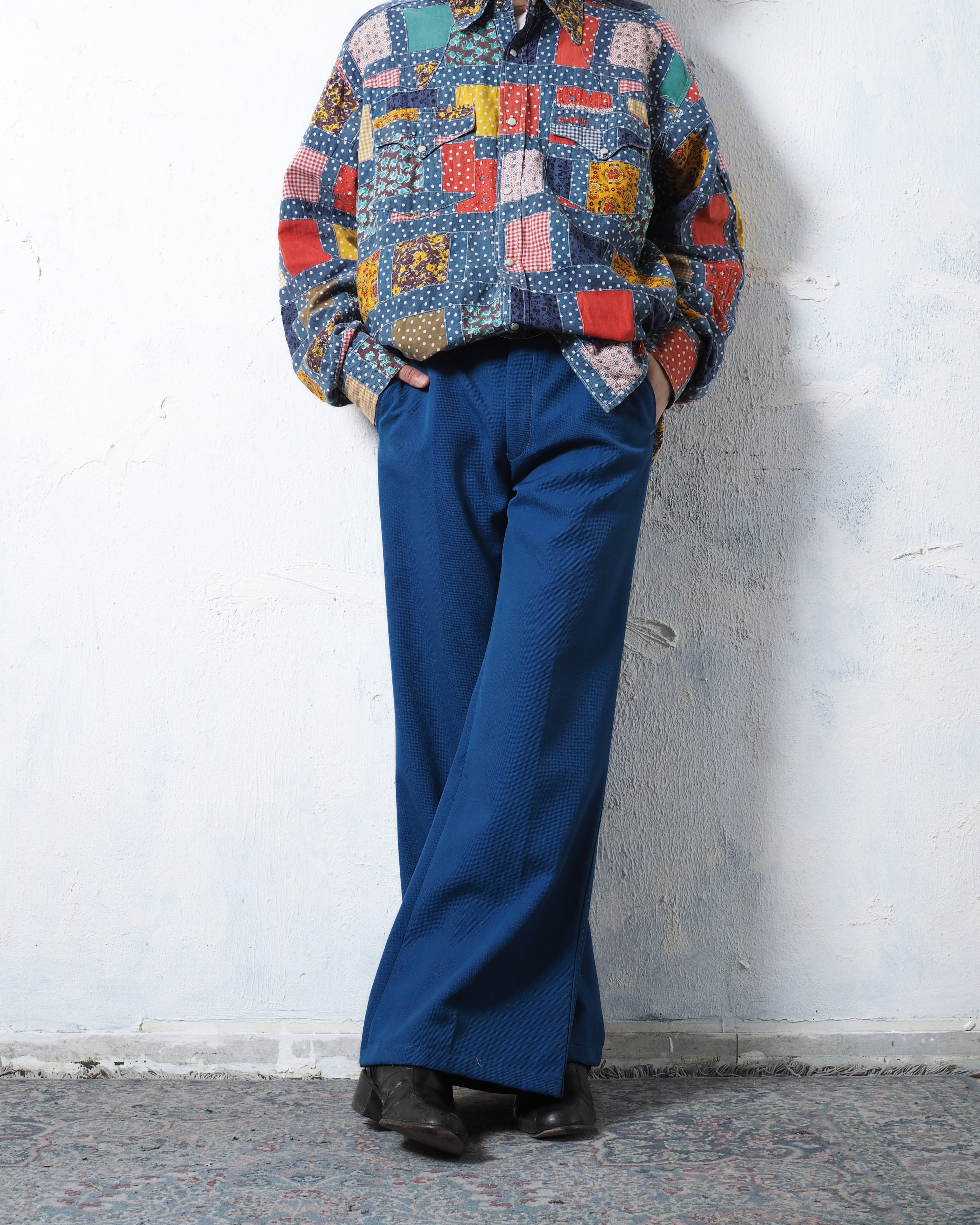 鮮やかな青ボディに白ステッチが魅力的な仕立て屋系のフレアパンツ