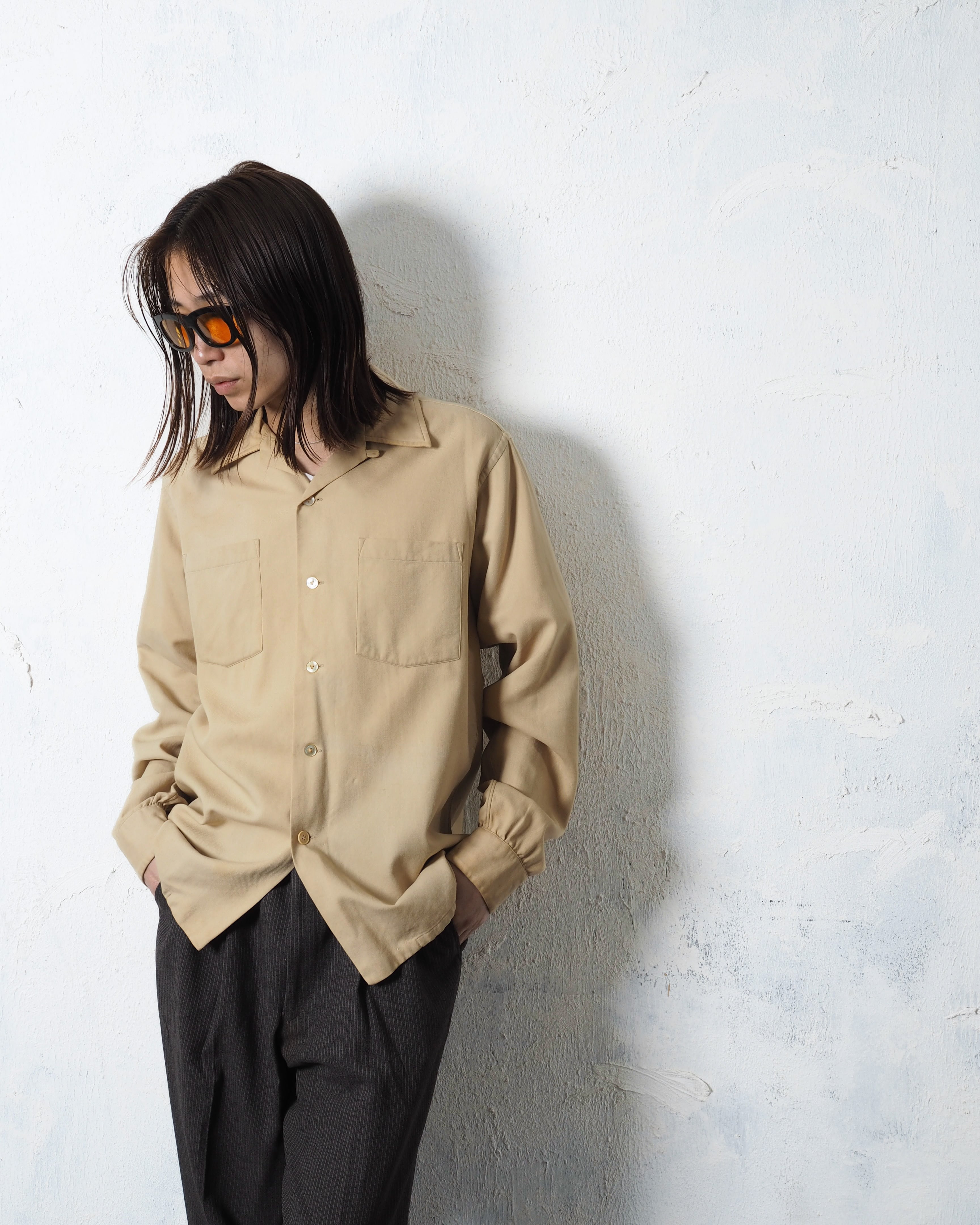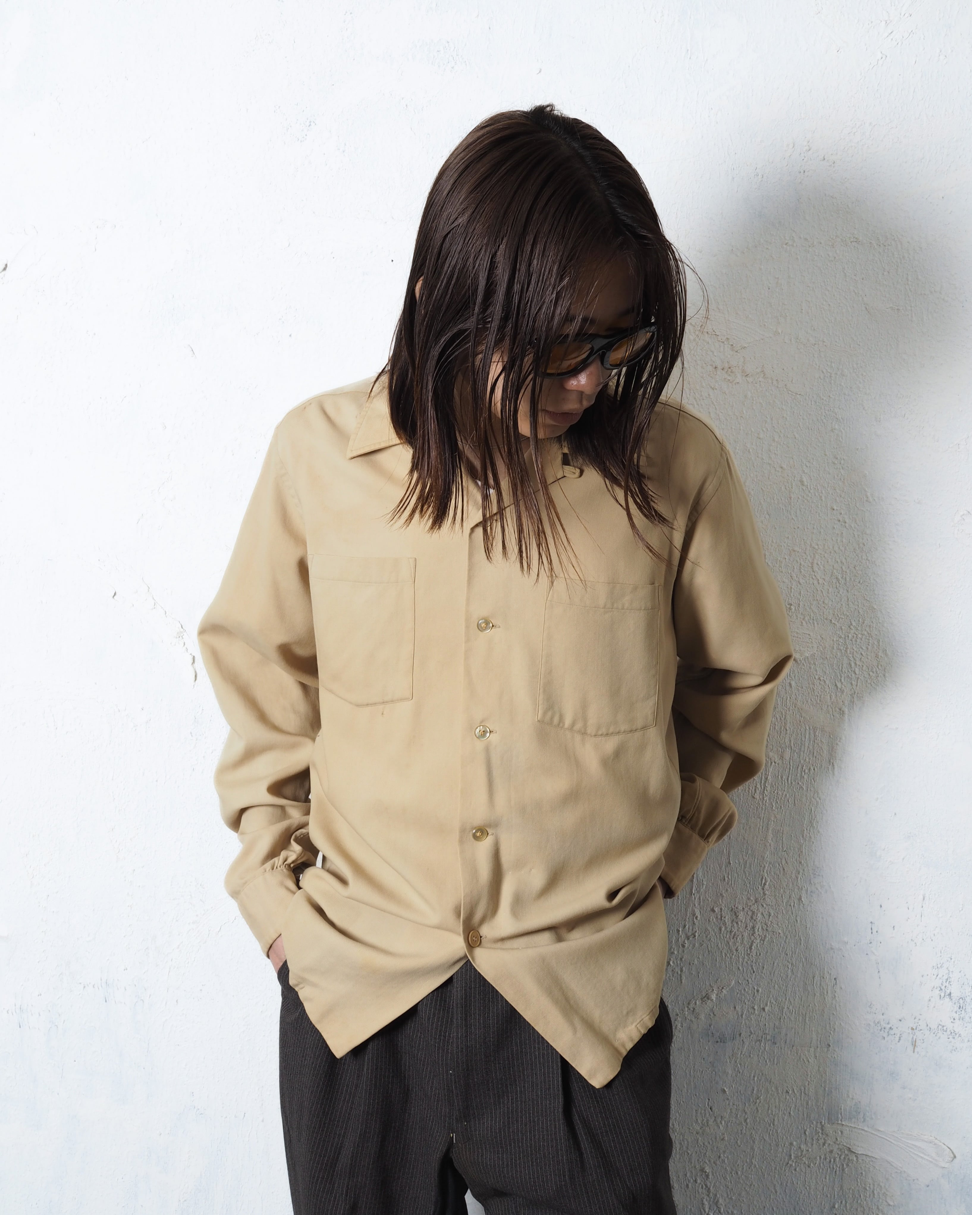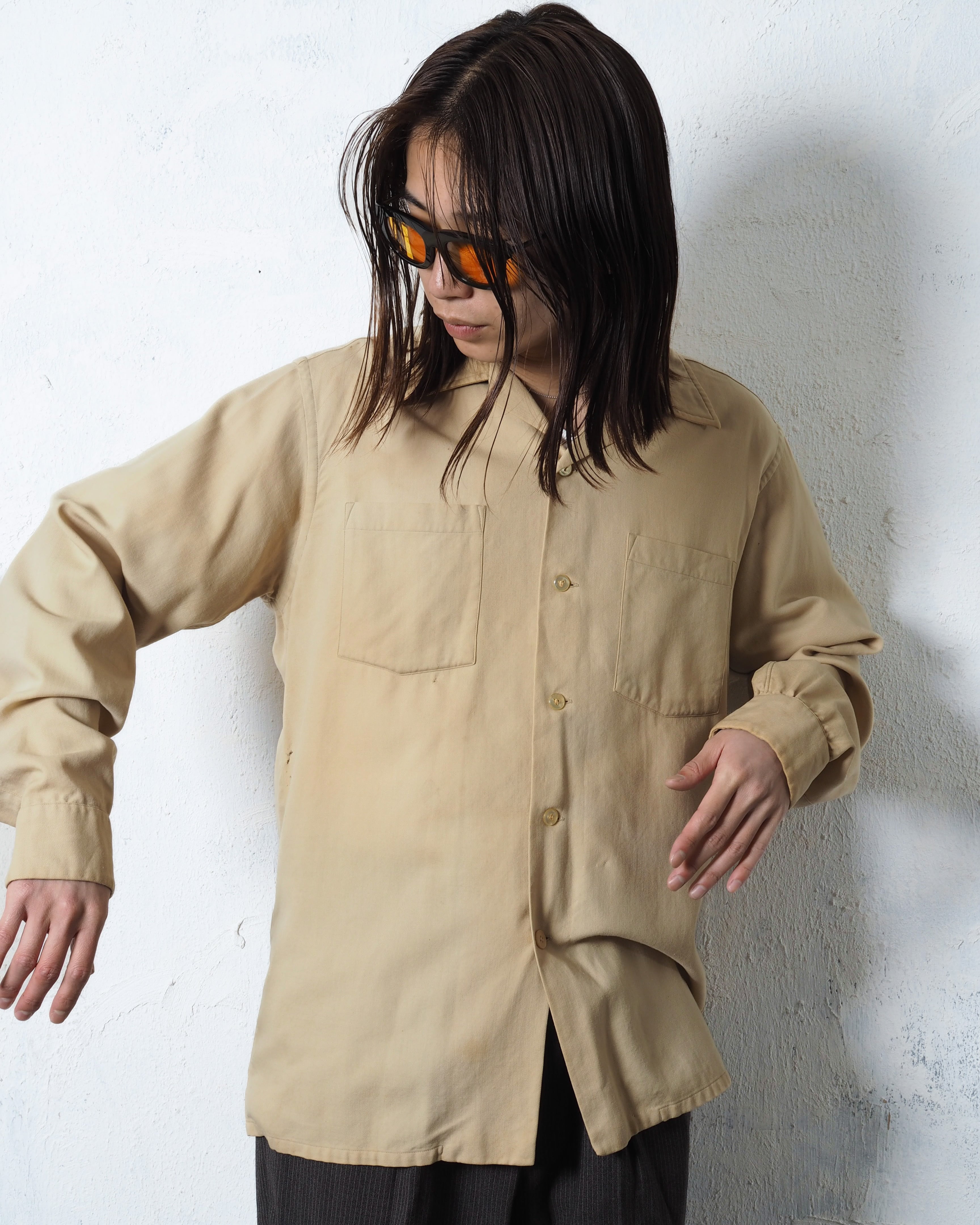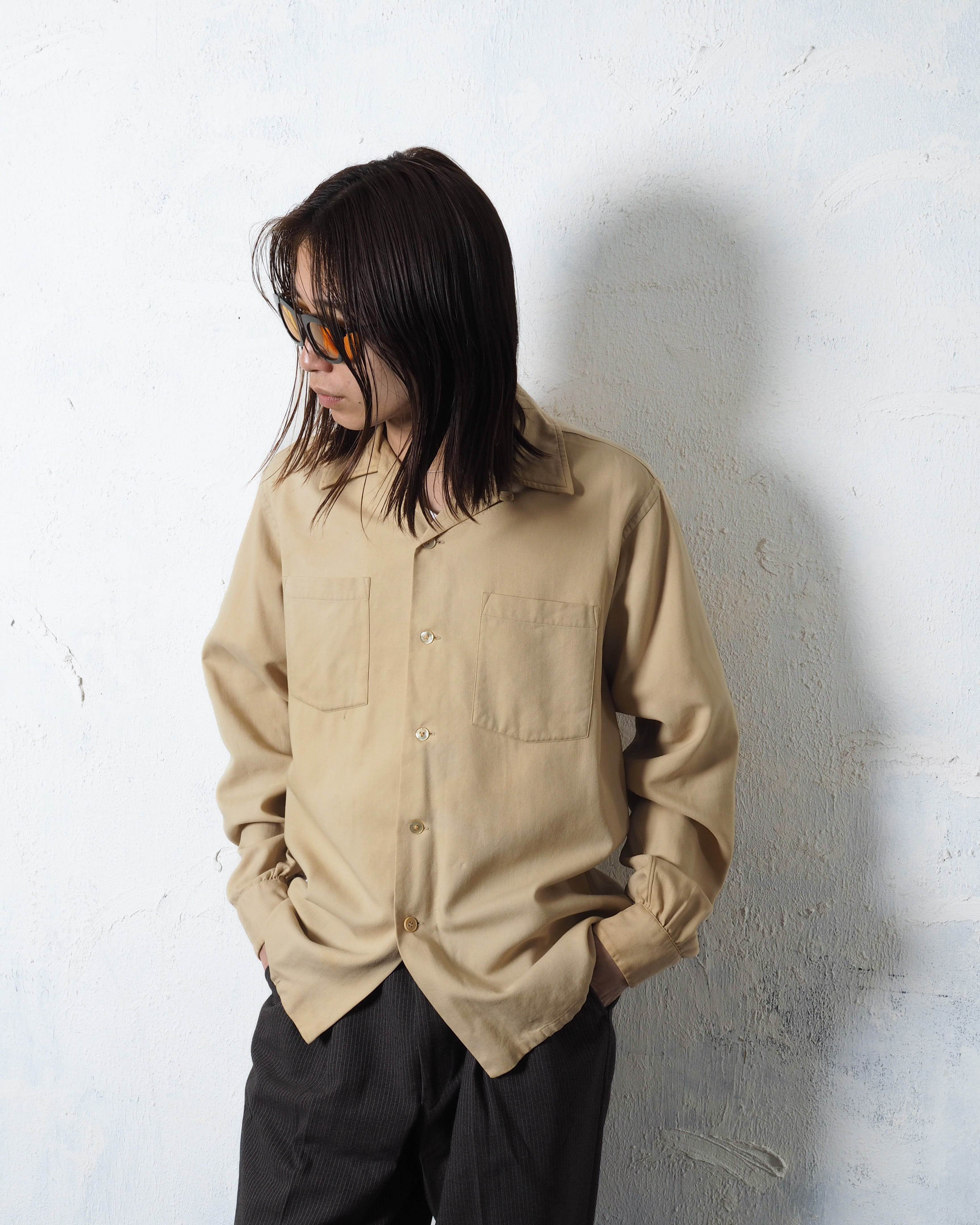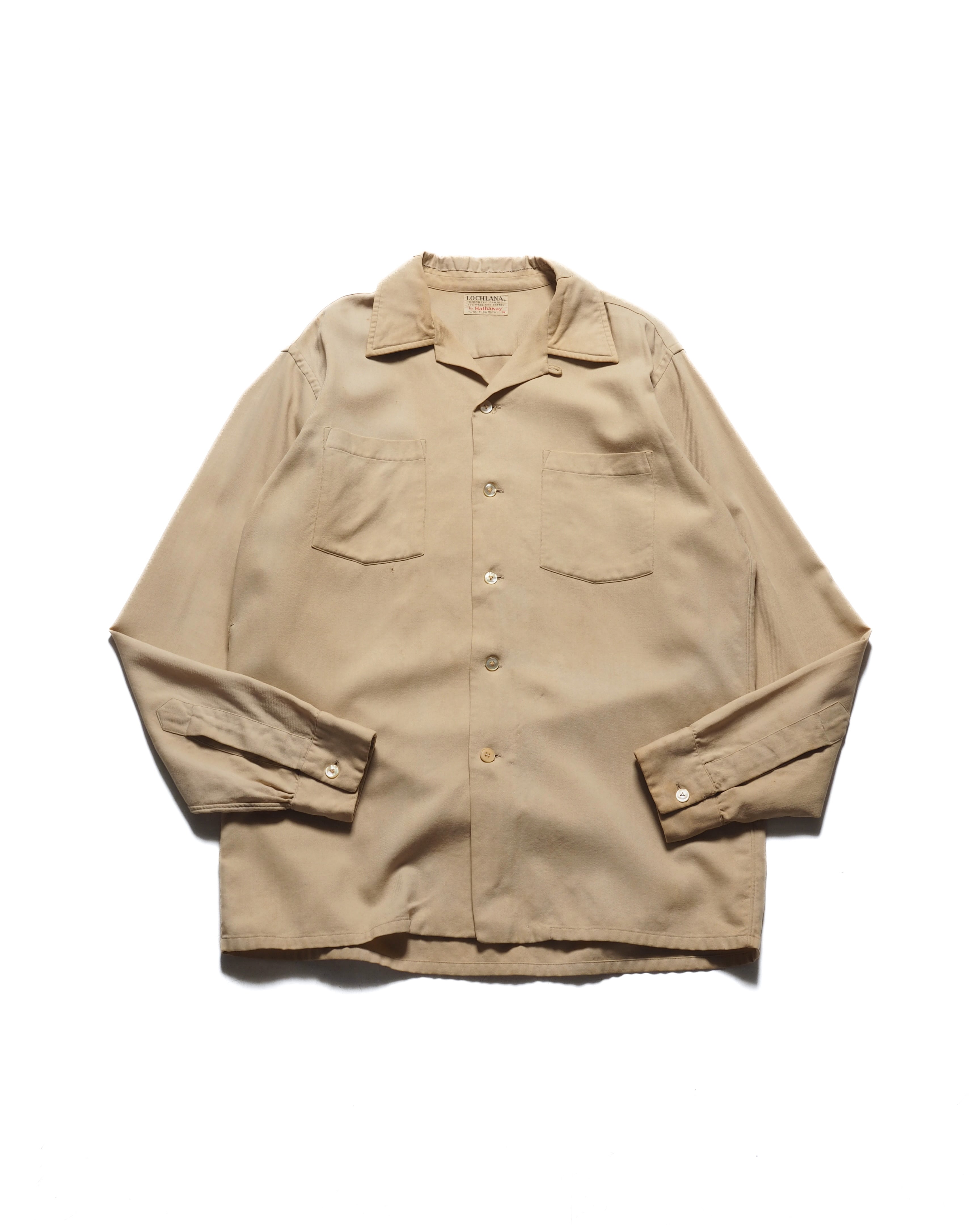 ウールとコットンの50/50で、ベージュに良いエイジングとボロ、オープンカラーの洒落シャツ