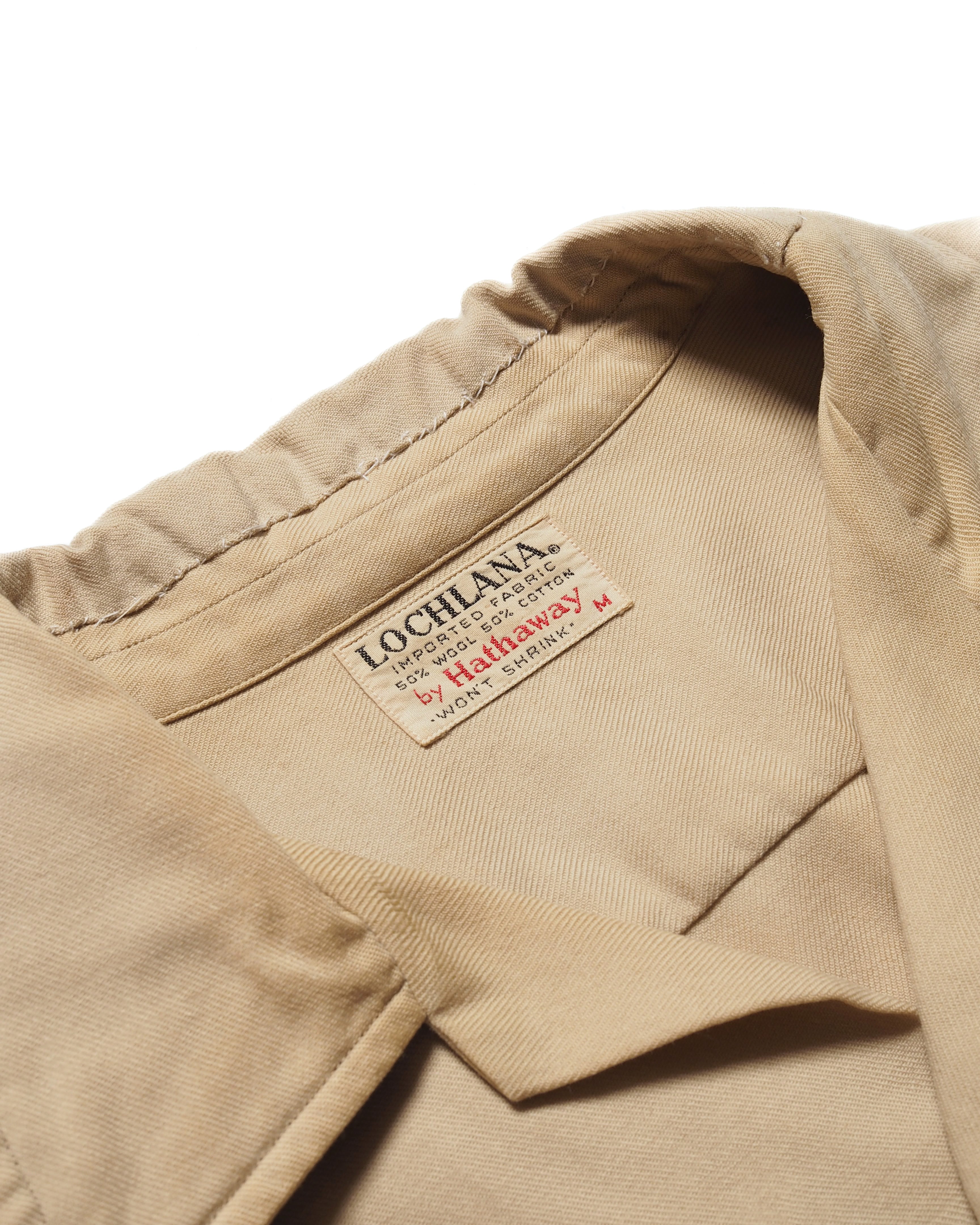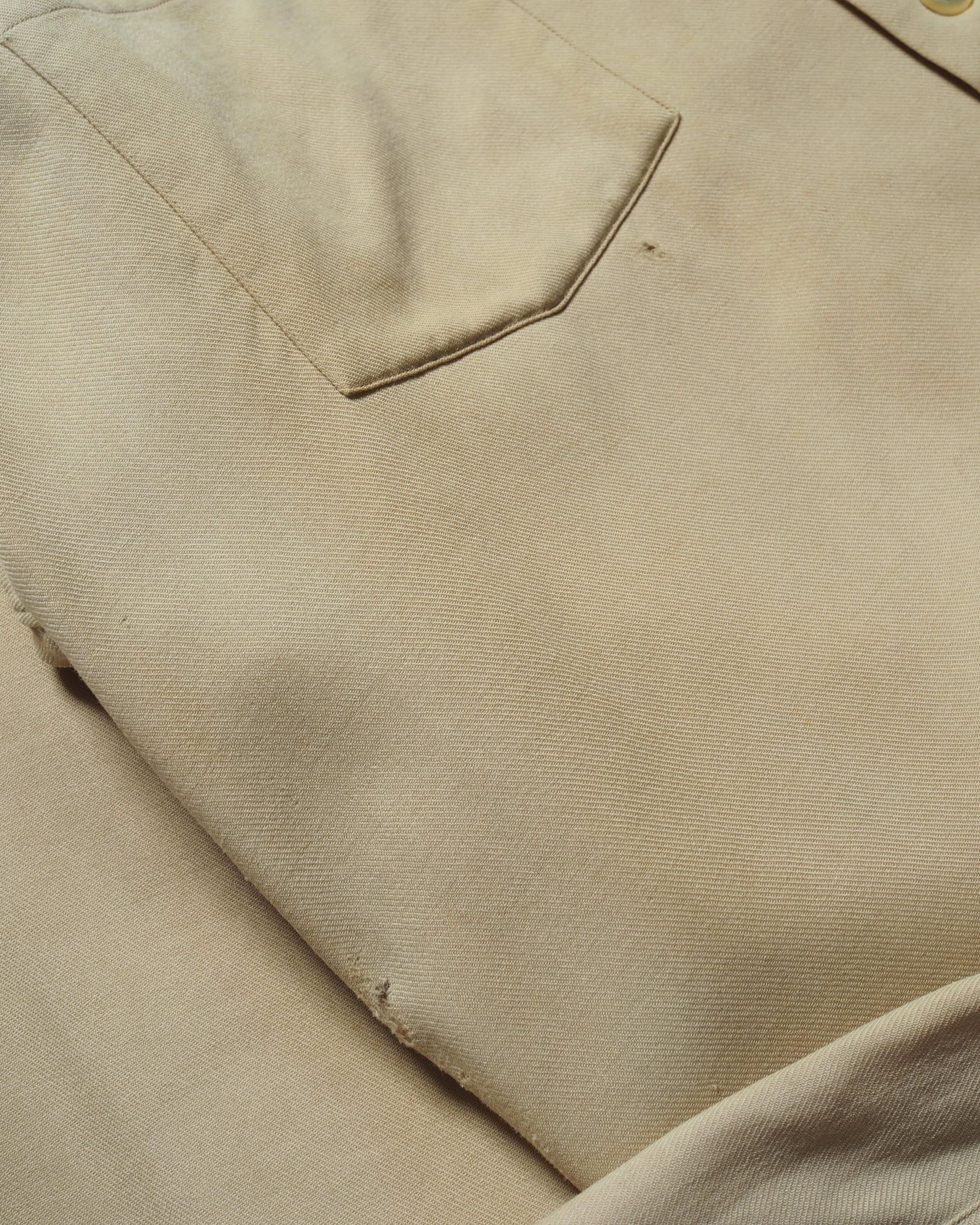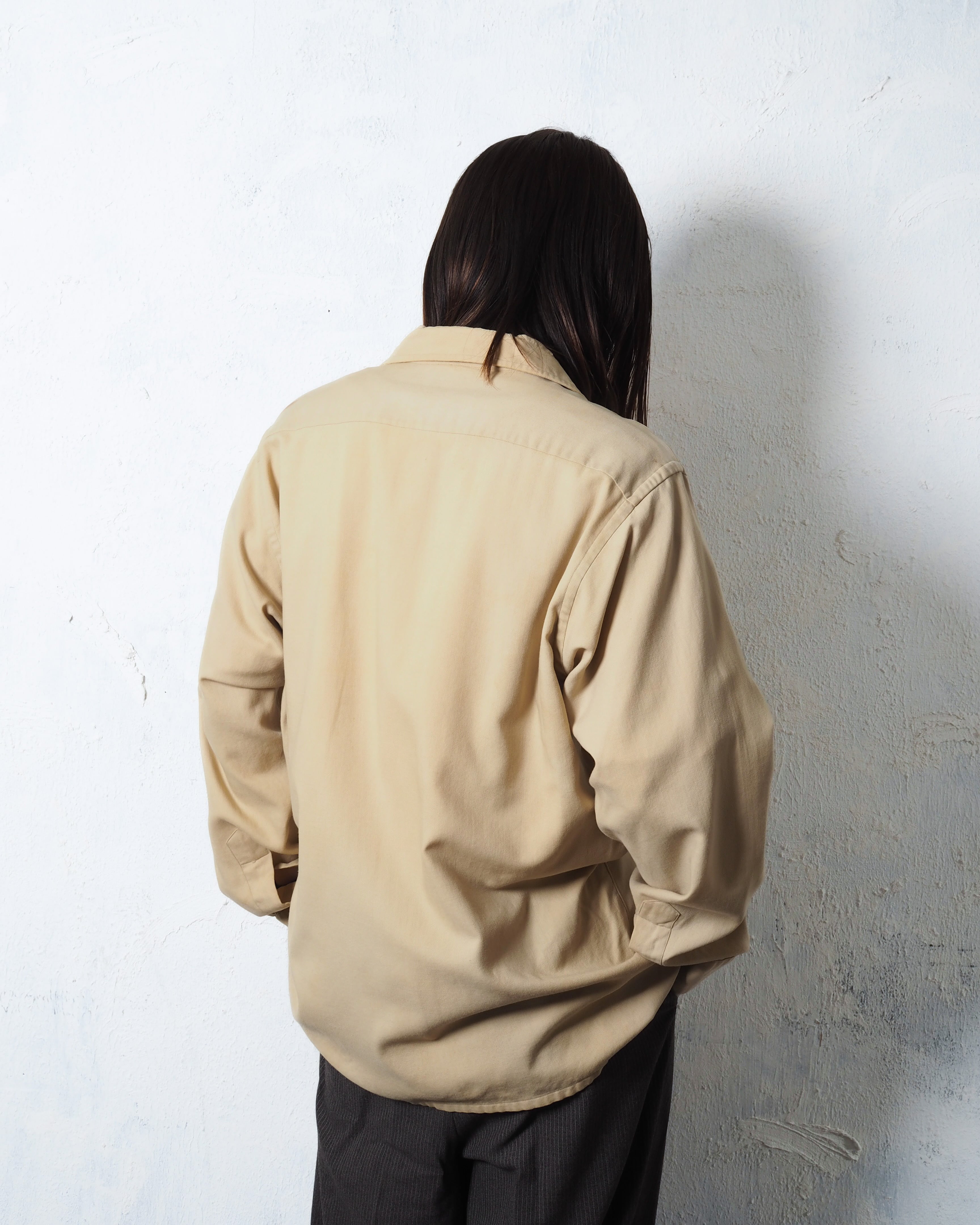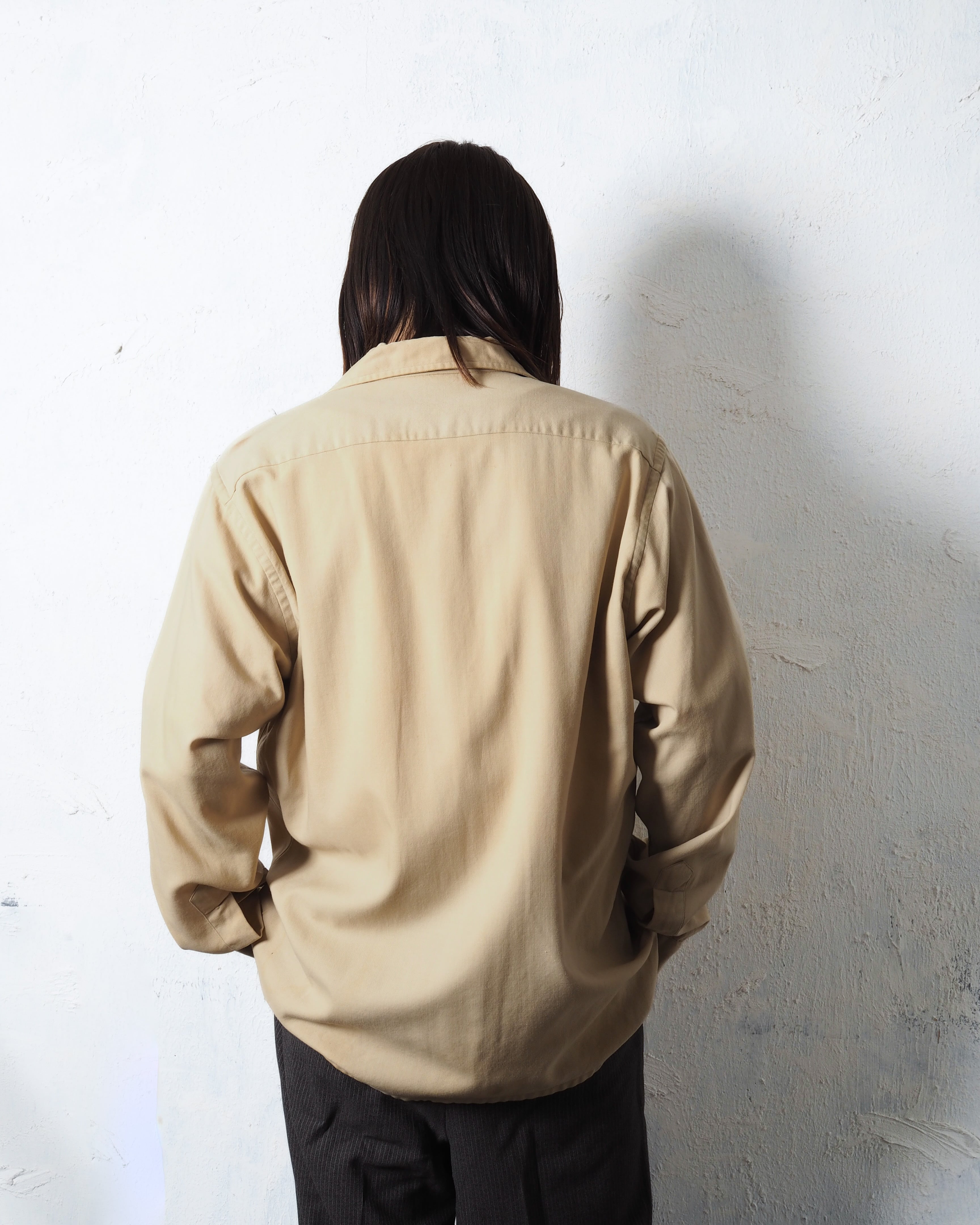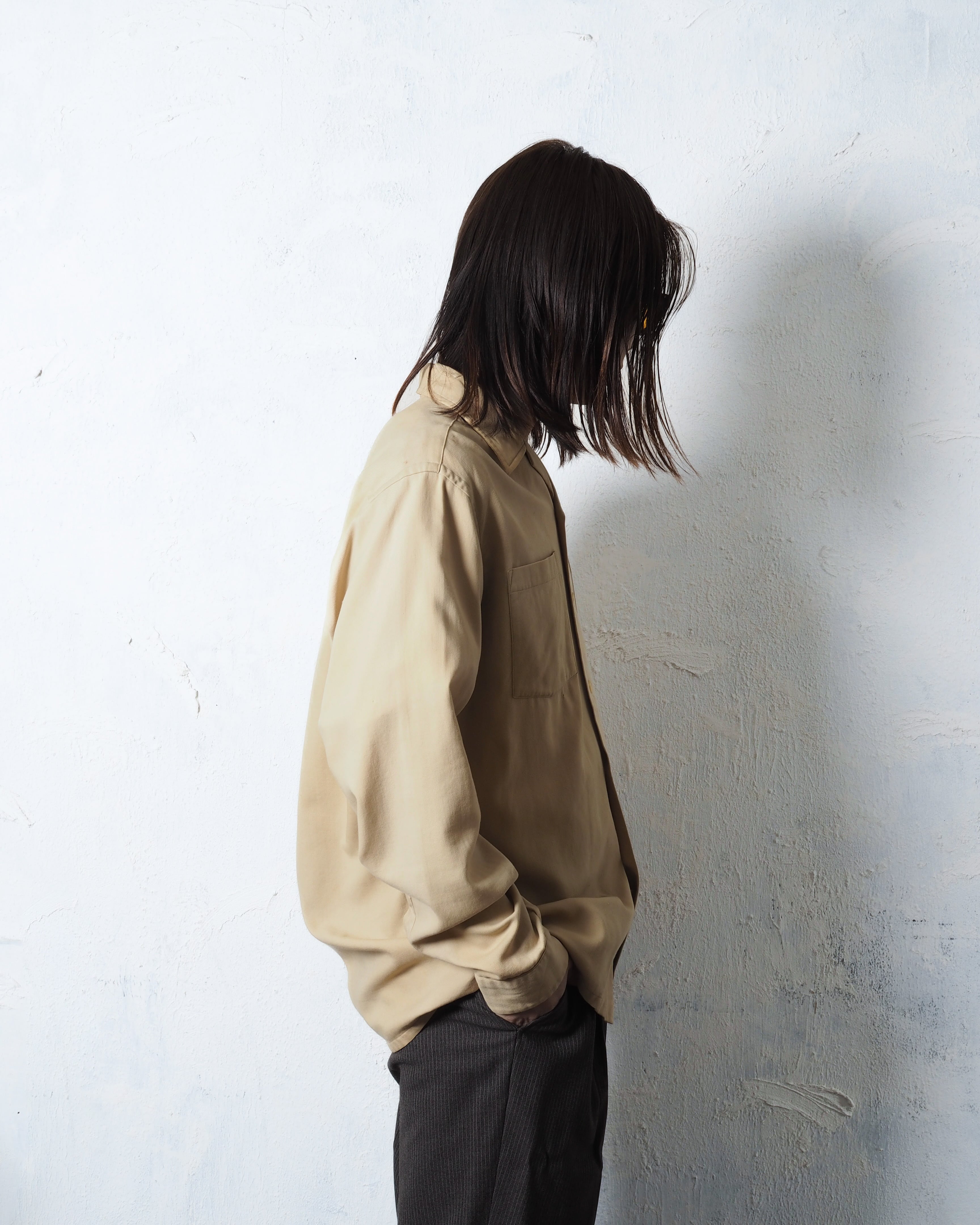 ウールとコットンの50/50で、ベージュに良いエイジングとボロ、オープンカラーの洒落シャツ