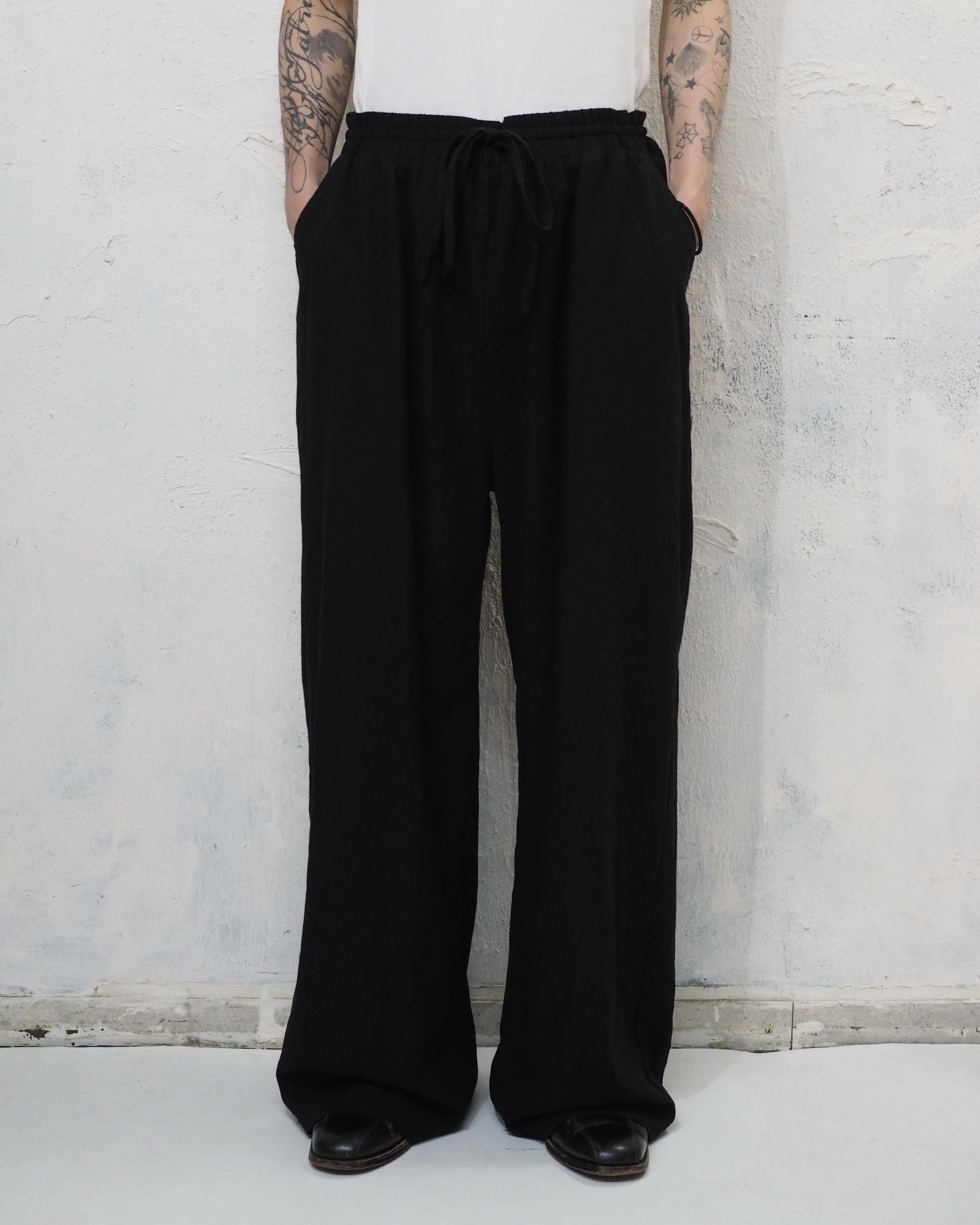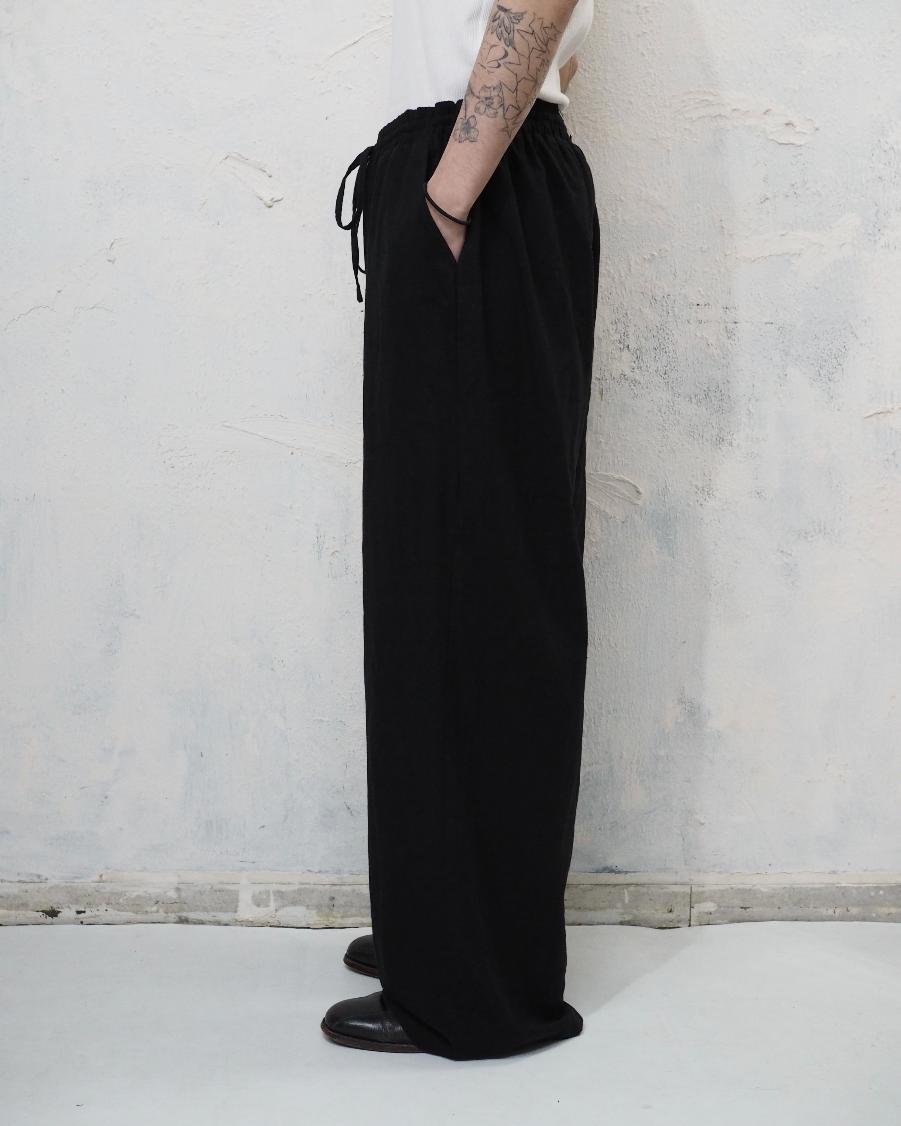 ファブリック盛り沢山の黒イージーパンツ