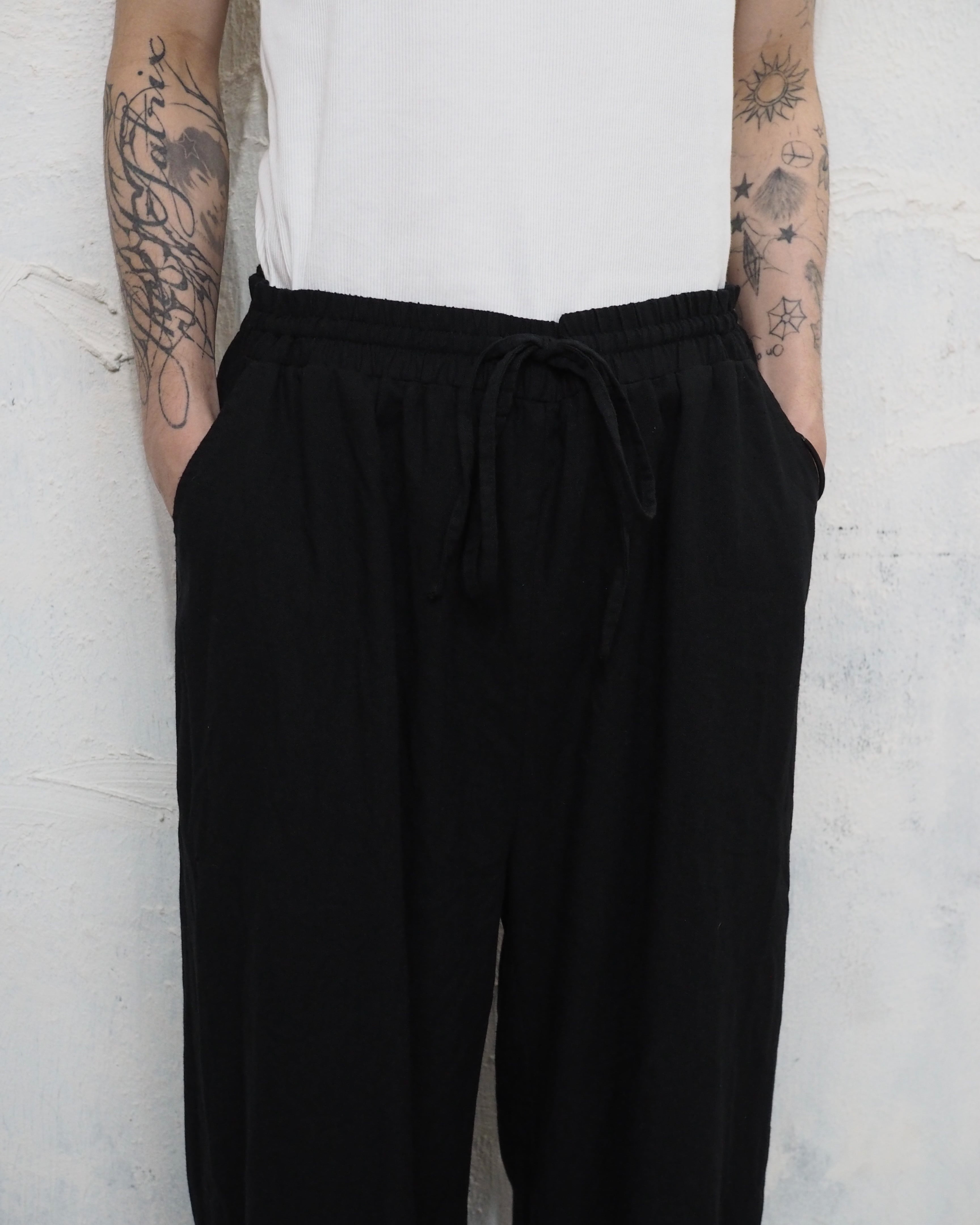 ポケット付きで、リネンとレーヨンの主張が強めの素材感、ワタリ幅から裾幅にかけて綺麗に落ちる一本です