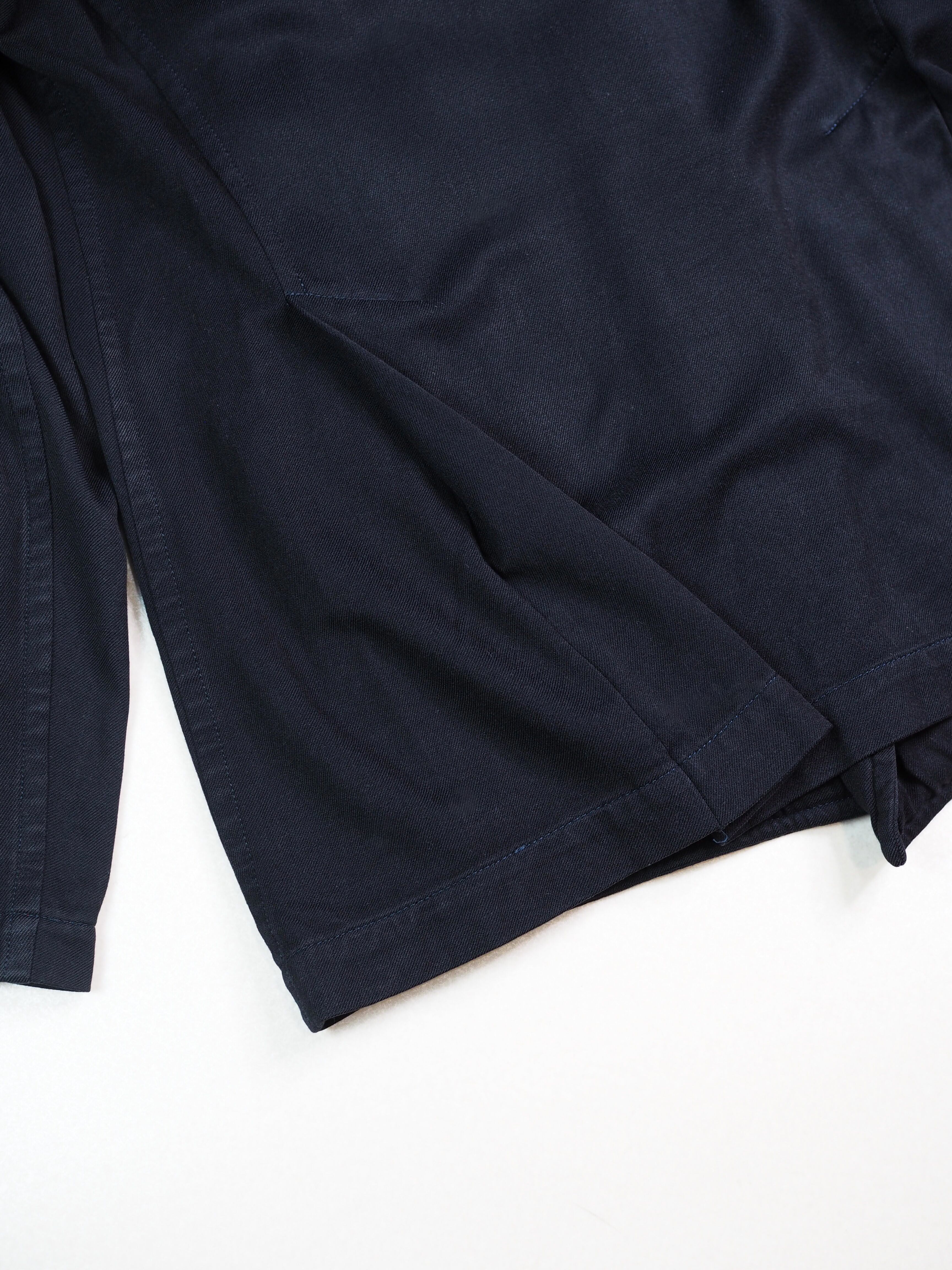 いわゆるPコートやフレンチワークを彷彿とさせるダブル仕様の前立てに、先染めからなる経年変化(褪色)が雰囲気を押し上げる仕上がり。