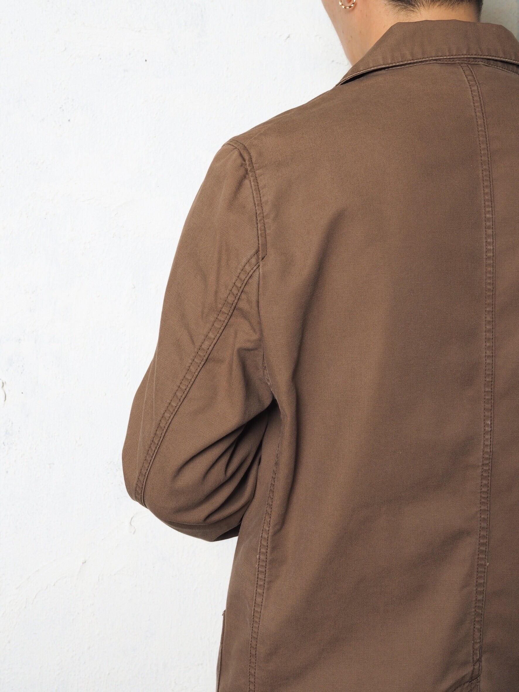 ブラウンカラーにドライタッチな薄手のコットンボディ、カバーオールディオールではあるものの、