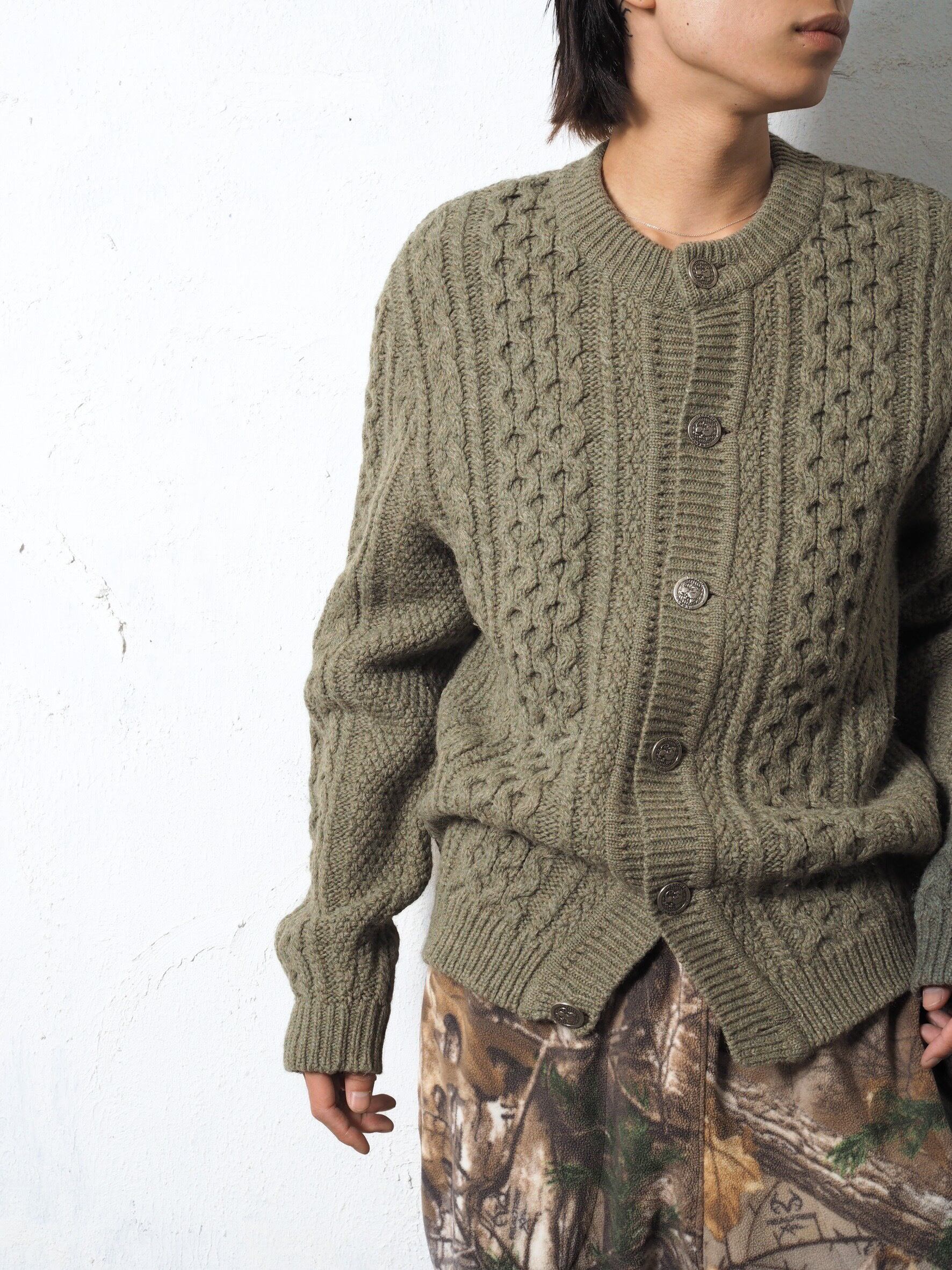 立体感あるケーブル編み、独特なボタンの