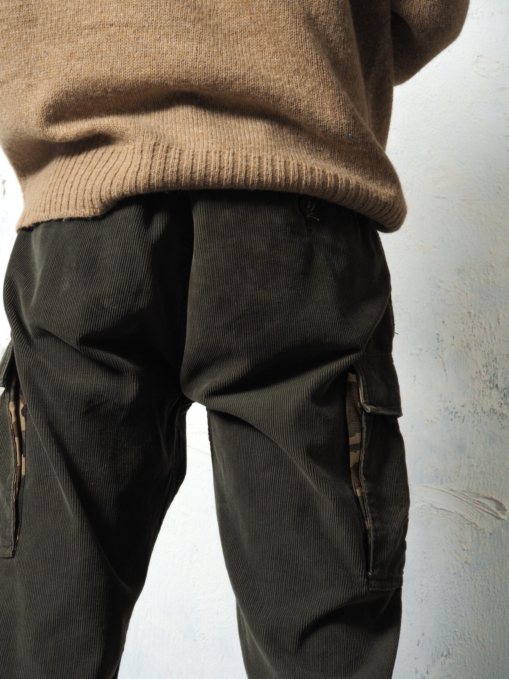 ウエストバンドとポケットの裏地、カーゴポケットのマチに迷彩のデザインスイッチングで、リップストップを採用したミリタリー踏襲ながらあくまでブランドのオリジナリティーを感じる仕上がり