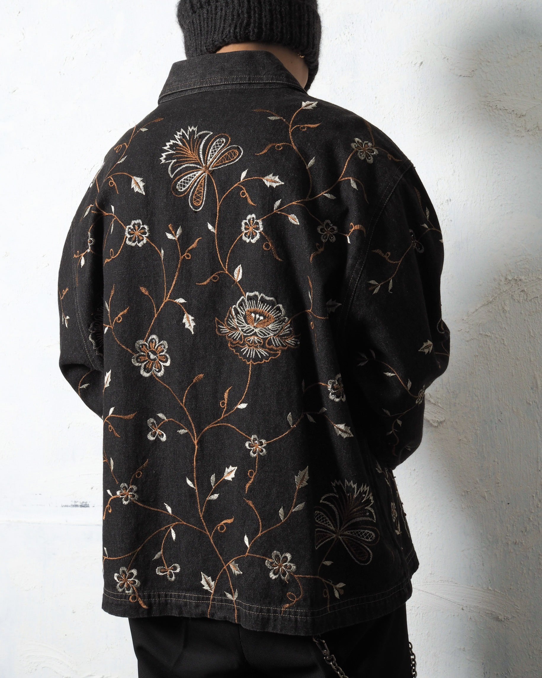 総柄の花デザインはクールな印象のブラックデニムを程良くヌケ目のある雰囲気を齎す仕上がり