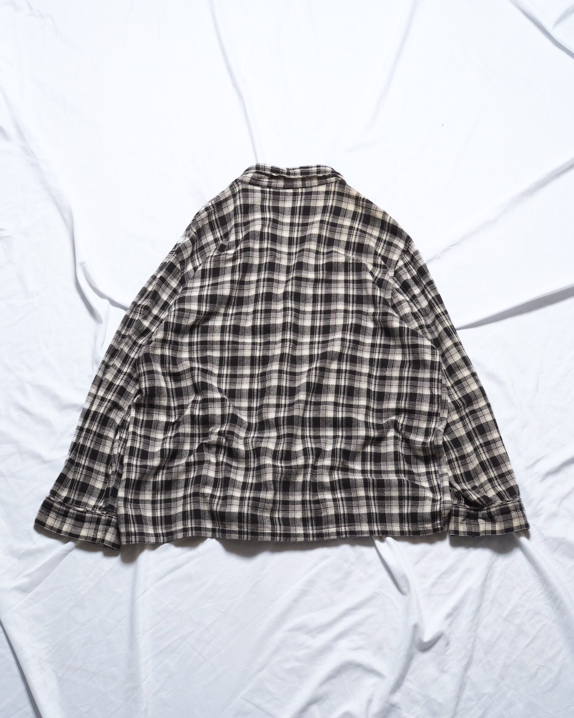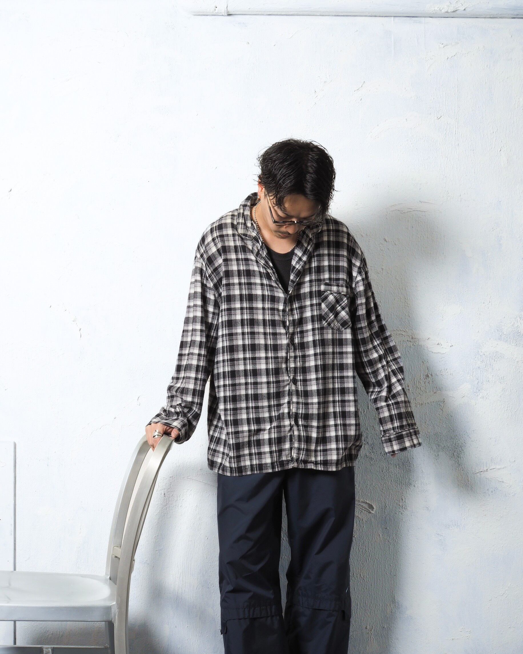 このシャツはモノトーン配色とパジャマシャツ特有の抜け感のマッチ度の高さが表れている一着です
